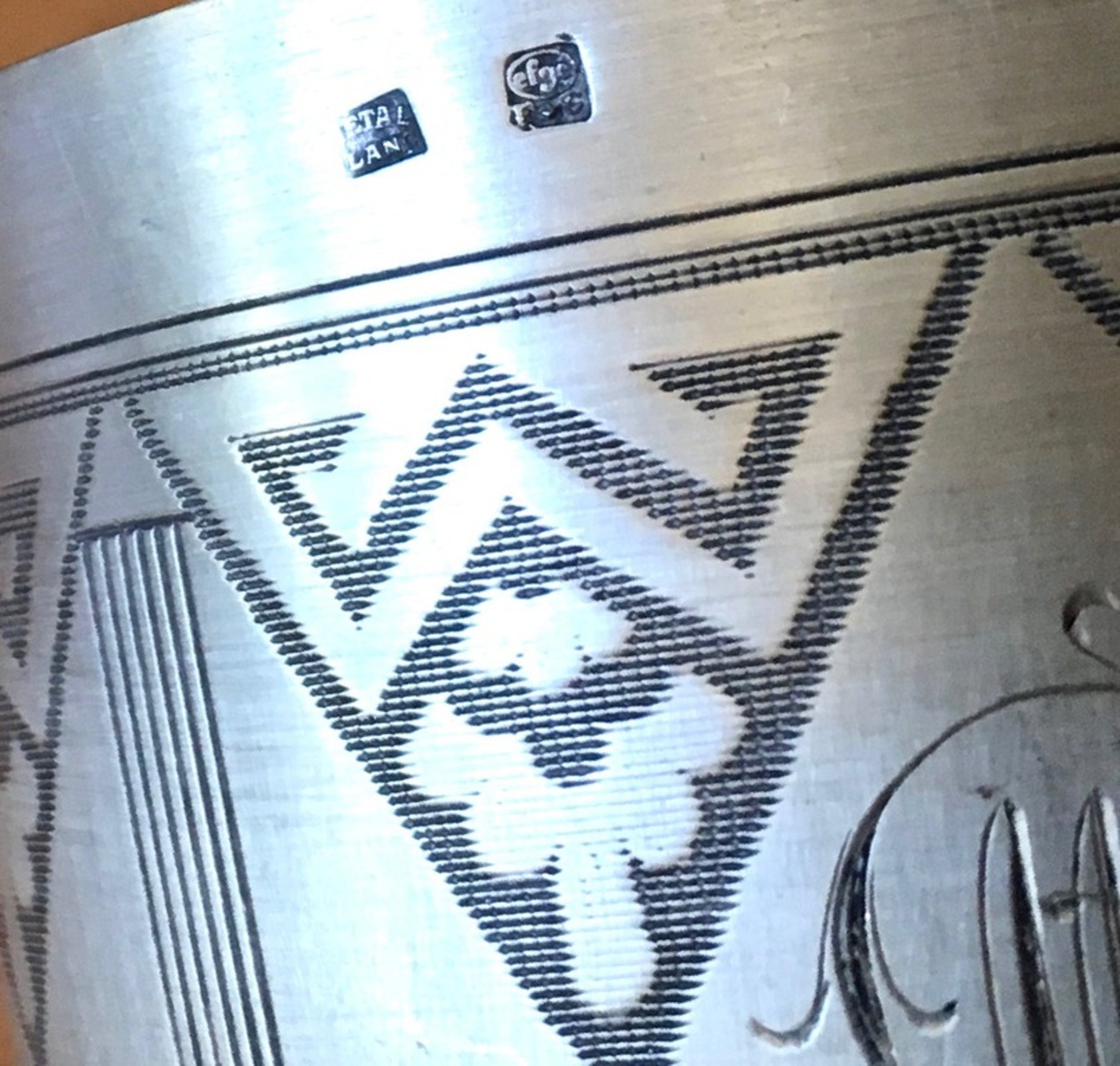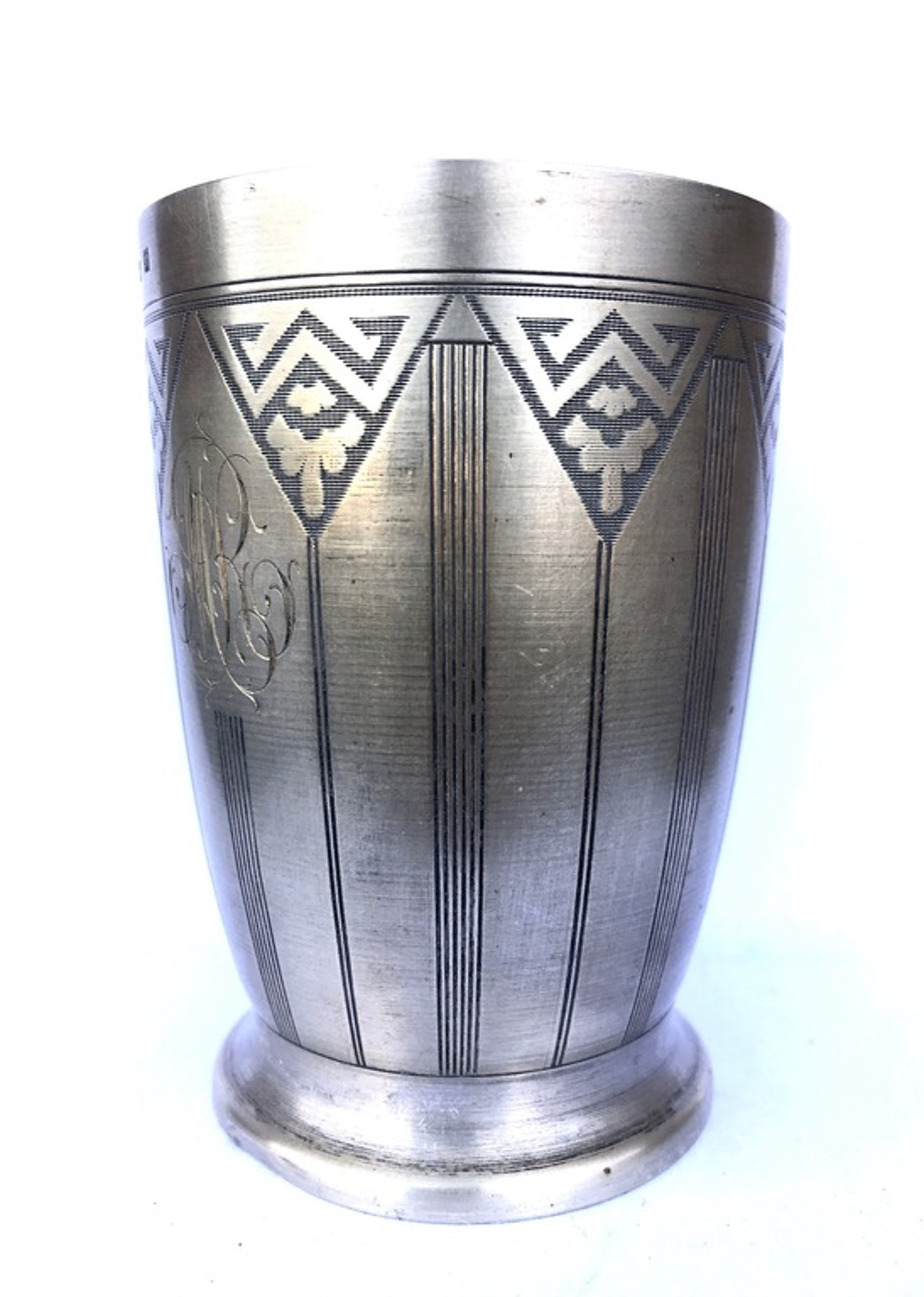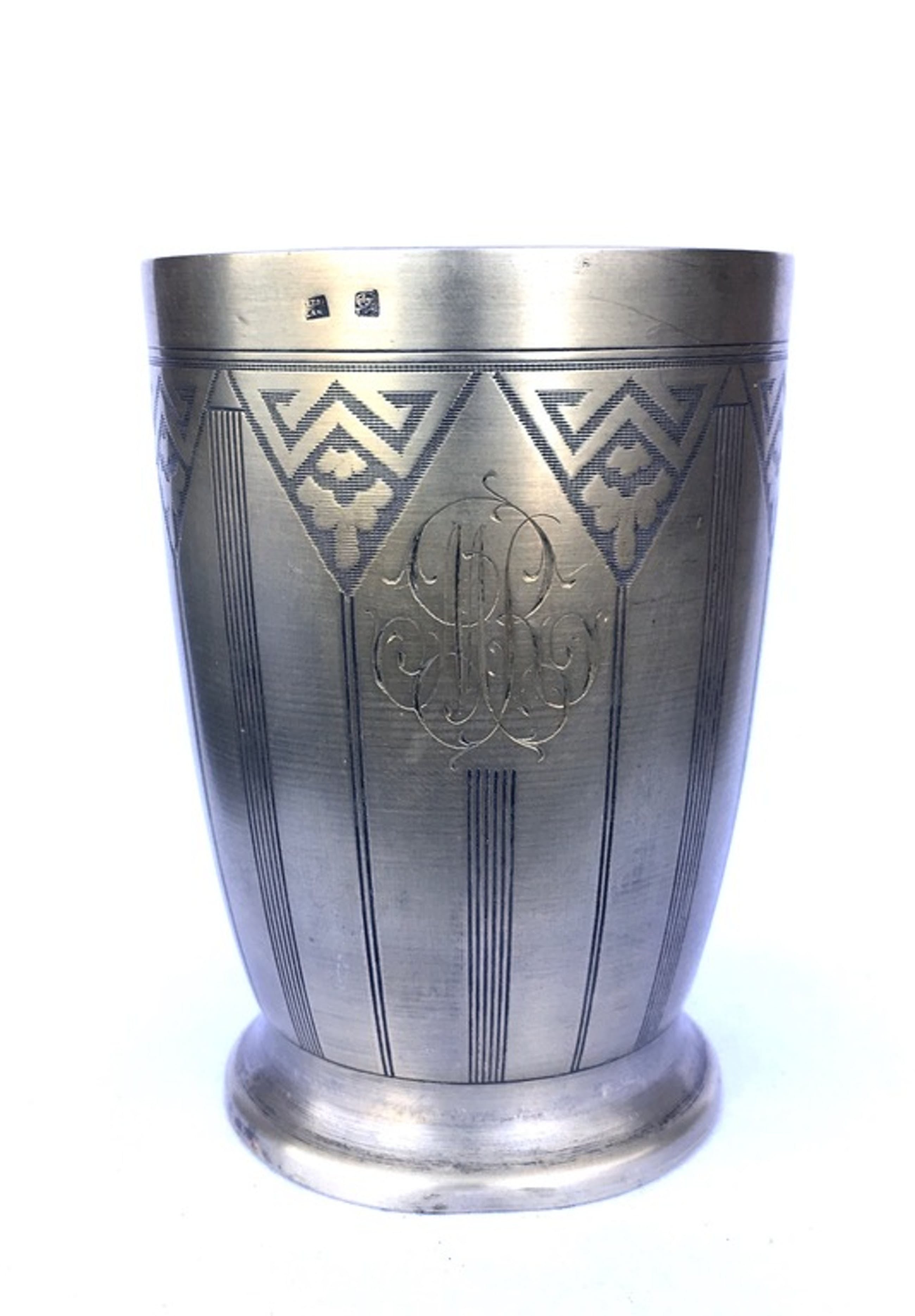 Stijlvolle Franse Métal Blanc zilveren beker uit de art deco periode met modernistisch decor en monogram. De beker is aan de bovenrand uitstekend gemerkt met het Franse Métal Blanc merk en met de firmanaam: Efge.