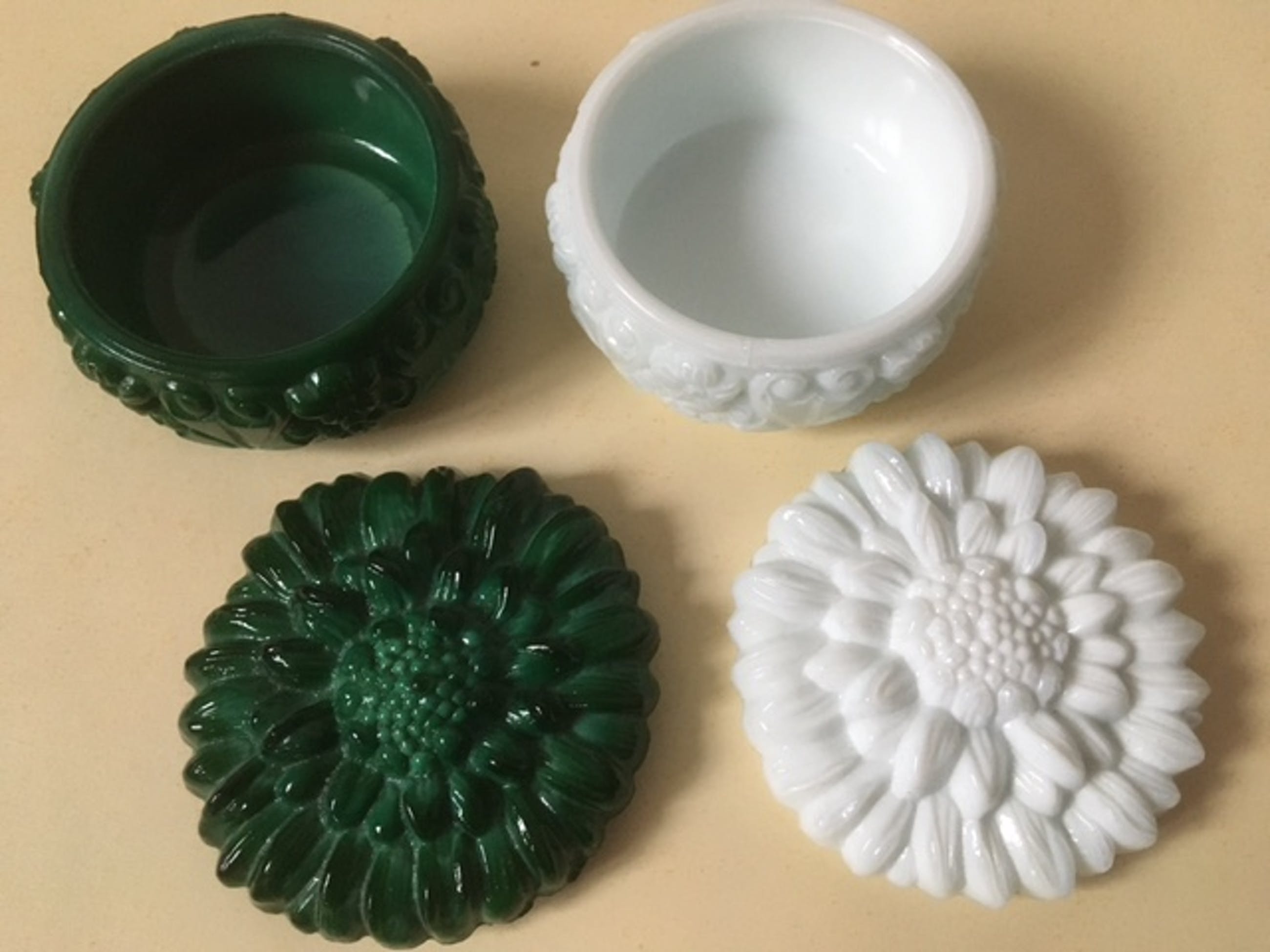 2 x Malachiet geperst glazen dekseldozen van Frantisek Pazourek voor Curt Schlevogt, Gablonz. Hoogte incl. 7 cm, max doorsnede 10 cm, gewicht ca 480. Ca. 1930-1950.