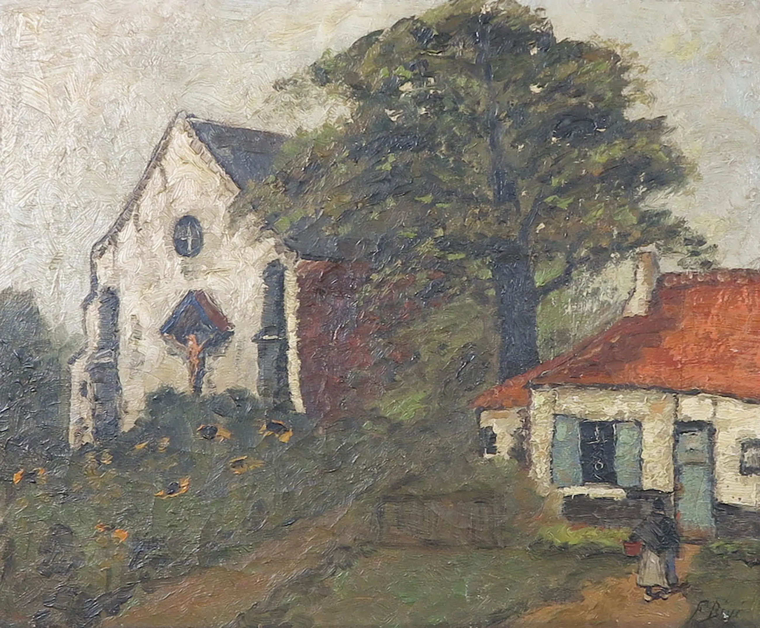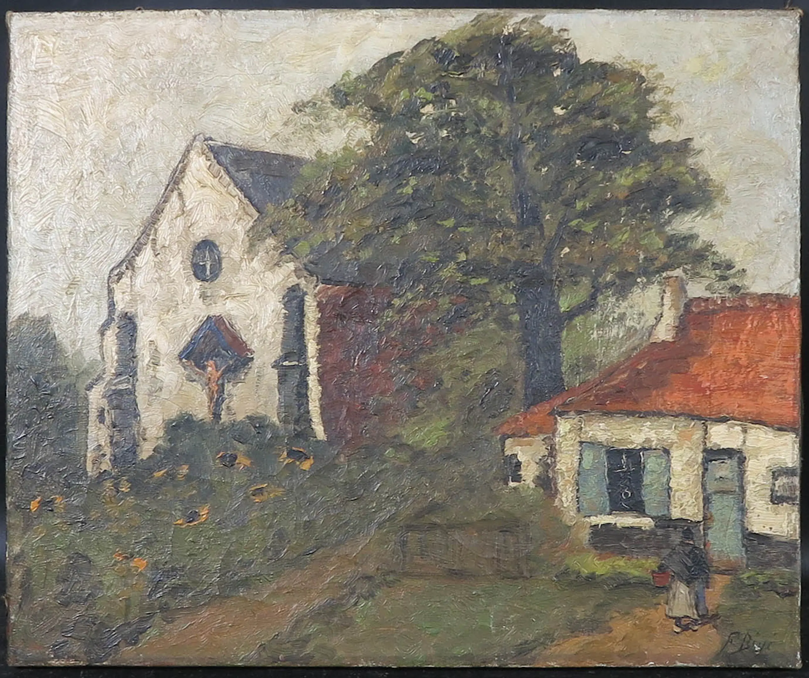 Olieverfschilderij van Franz Binjé. Binjé was een Belgische kunstschilder die behoorde tot het impressionisme. Hij schilderde vooral kleine landschappen. Het werk is rechtsonder handgesigneerd.
