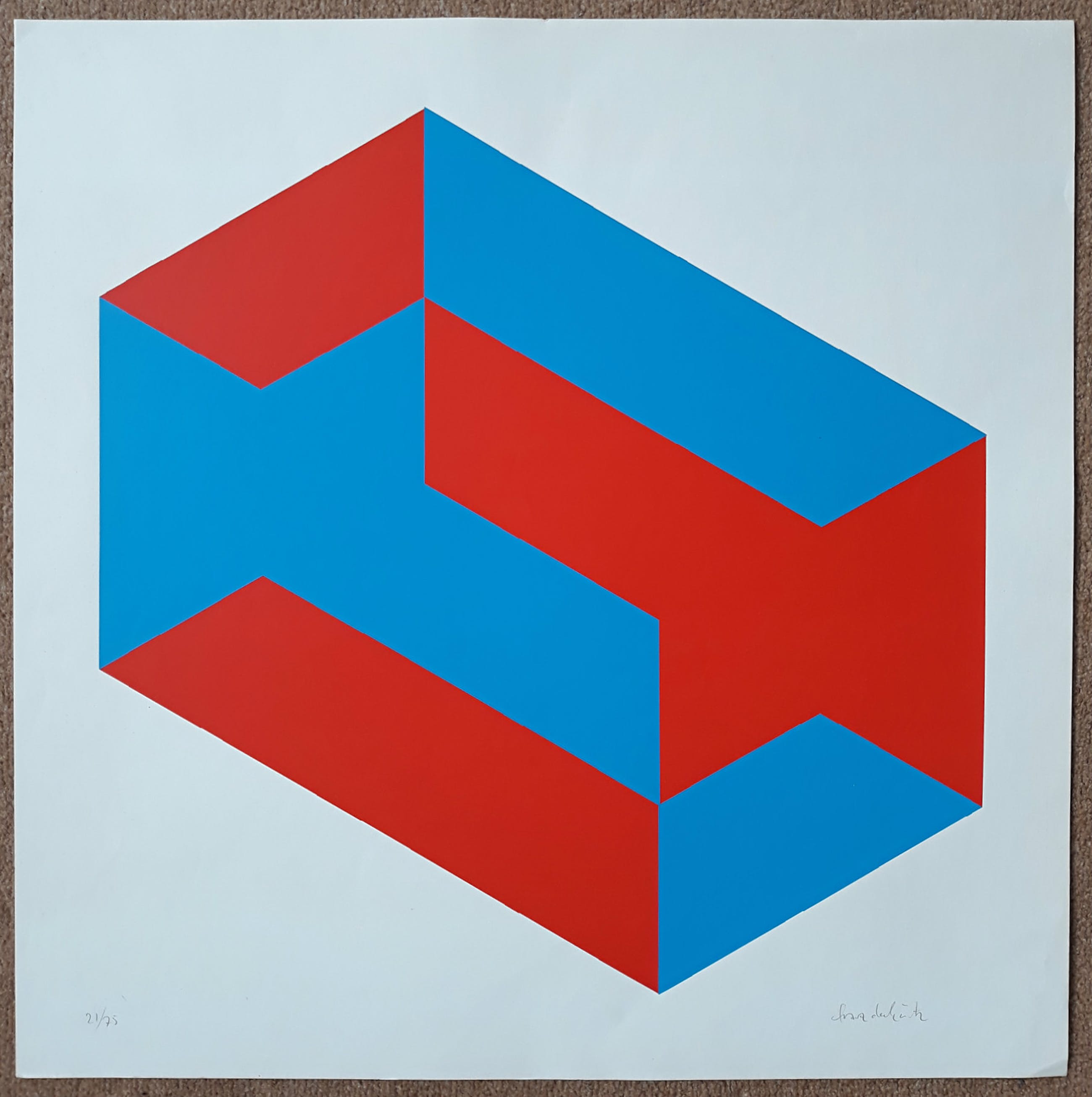 Strakke geometrische compositie van Franz Deckwitz. Zeefdruk op papier, met potlood gesigneerd en genummerd (21/75). In goede conditie; de witte marge linksboven is iets aangetast door zilvervisjes, ingelijst met passe-partout valt dit merendeels weg en wat overblijft valt naar alle waarschijnlijkheid niet op.