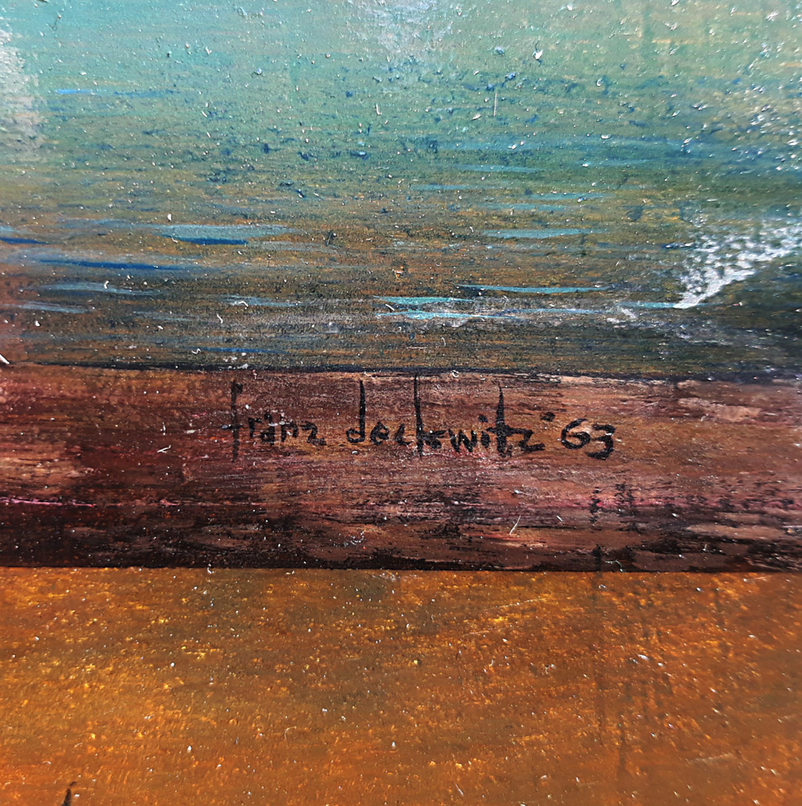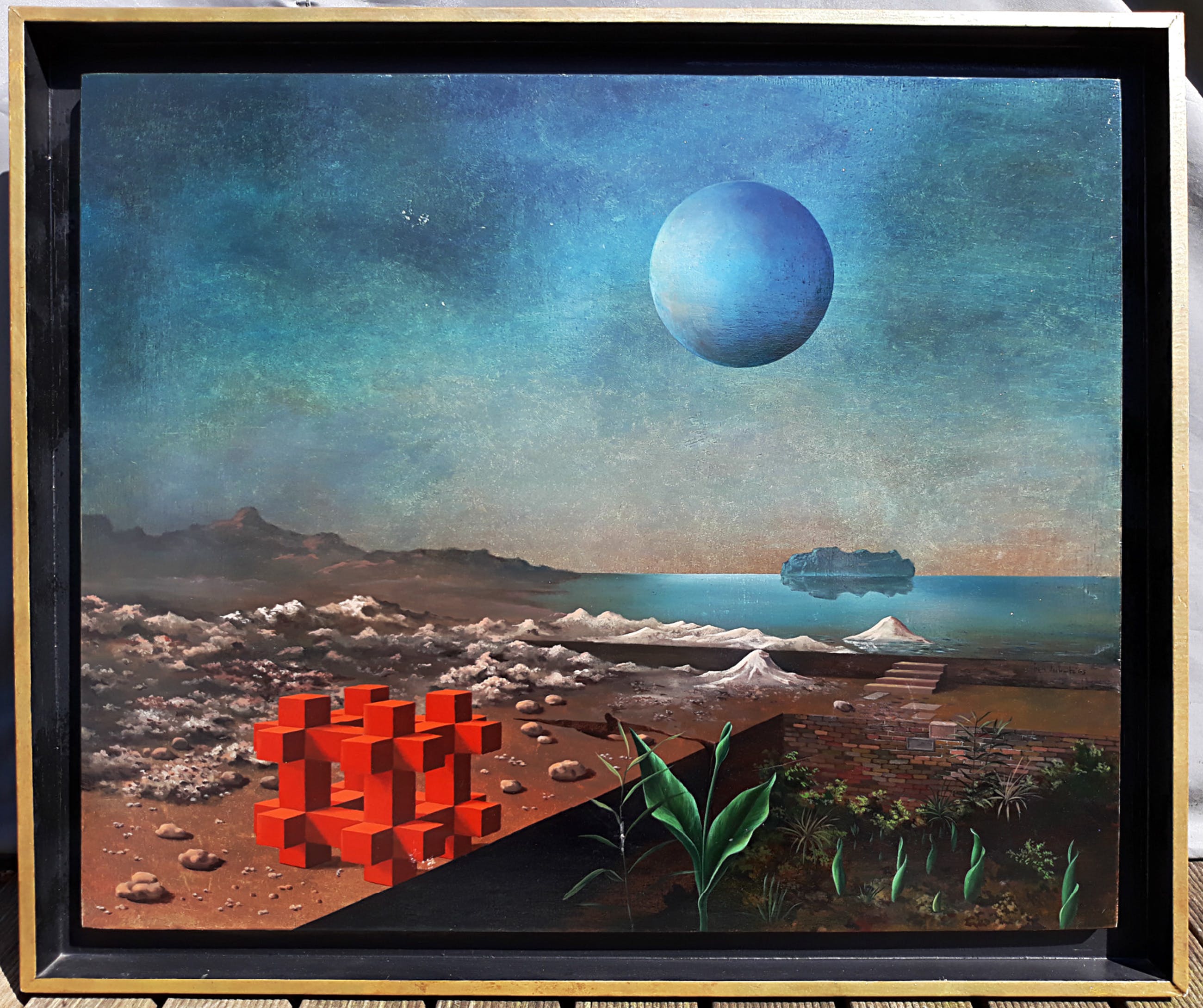 Mooi, zeer fijn geschilderd landschap van Franz Deckwitz. Olieverf op paneel, gesigneerd en gedateerd (‘63) rechtsonder, netjes ingelijst. Alles in goede conditie; er zitten wel wat oppervlakkige krasjes op een paar plekken (ongeveer 10cm links van de maan en onderin de kubus-achtige constructie (zie foto’s)) maar die zijn goed te restaureren. Werk is in het echt iets donkerder dan op de foto’s naar voren komt, het werk moet in een lichte ruimte, of in spotlicht, hangen. Herkomst: Galerie Mokum, Amsterdam.