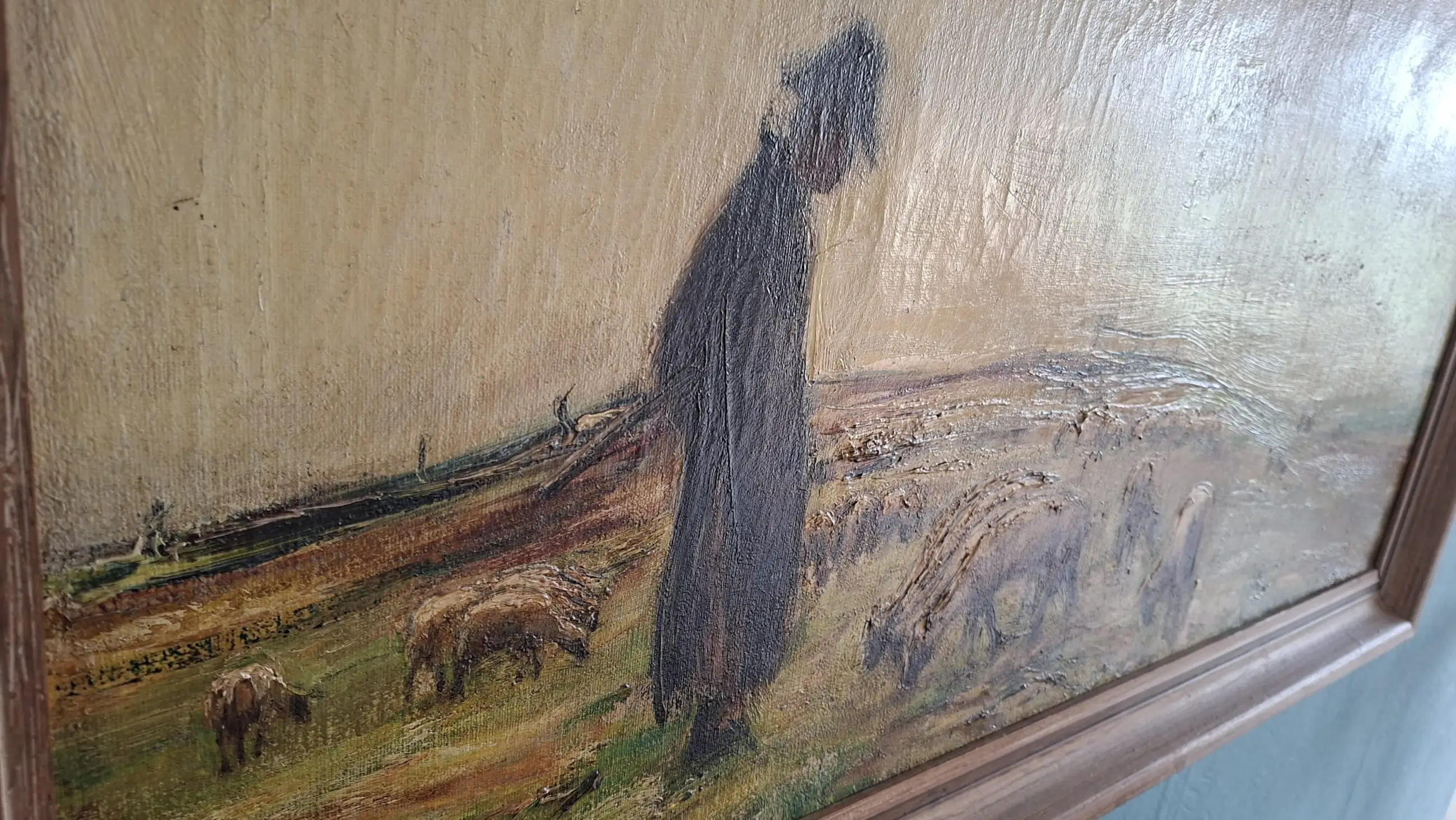 In een prachtige, post-impressionistische stijl voert Franz Delaforgue ons mee naar een zonovergoten heidelandschap. Met een meesterlijke beheersing van licht en textuur — prachtig zichtbaar in de dik aangezette verfpartijen (impasto) — zien we een herder die zijn kudde met een haast tastbare rust door de natuur leidt. De sfeer roept onmiddellijk herinneringen op aan de grote meesters van de Haagse en Larense School, zoals Anton Mauve.