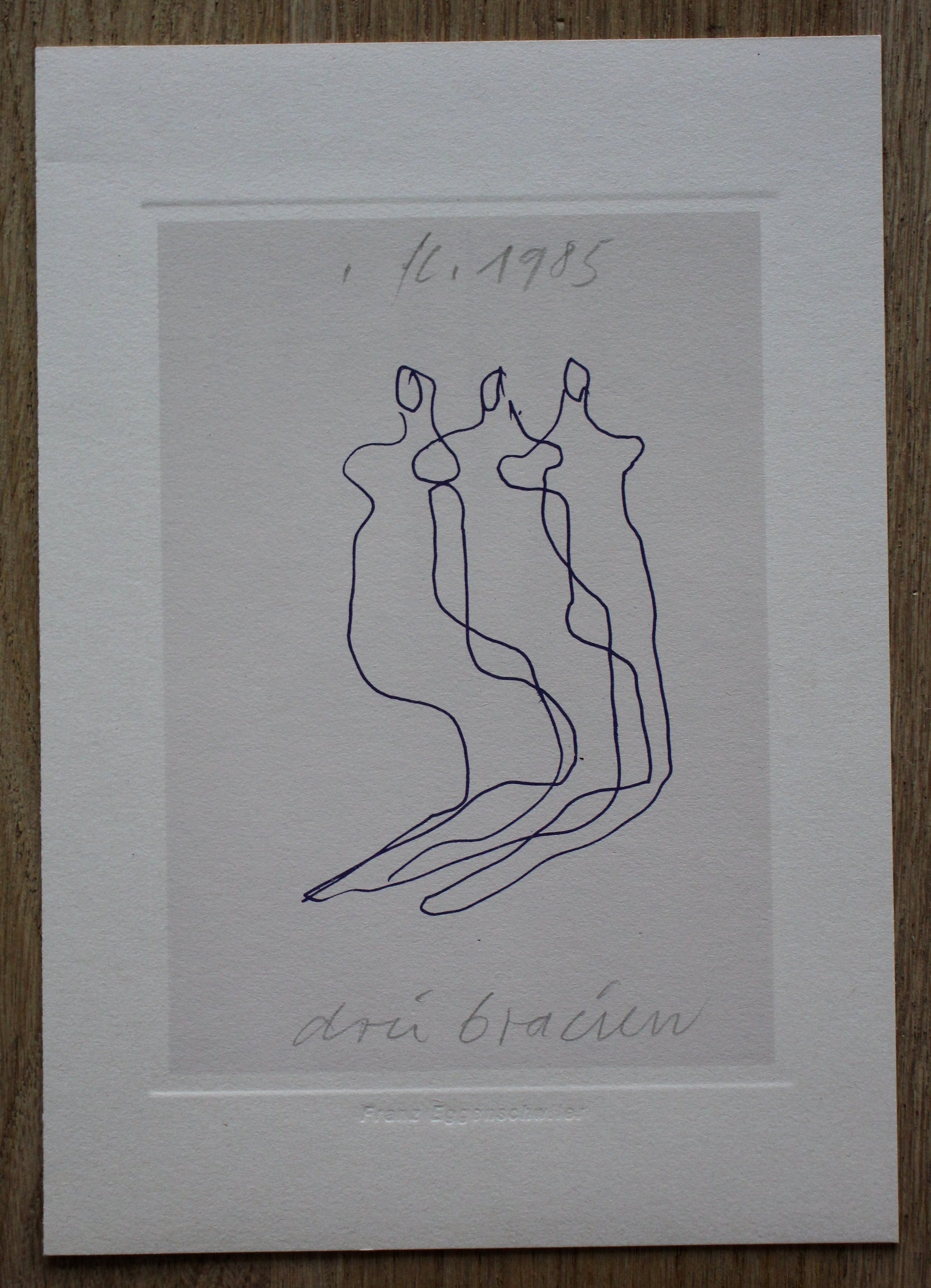 Ets van Franz Eggenschwiler. Titel: onleesbaar. Jaar: 1985. Afmetingen blad/kaart: H21 x b14.5cm. Afmetingen voorstelling: H14.5 x b10.5 cm. Het werk is, bovenaan, gesigneerd door de kunstenaar(Eggenschwiler signeert vrijwel altijd met monogram). De authenticiteit van het aangeboden werk wordt volledig gegarandeerd. Een certificaat van echtheid kan, op aanvraag, worden gemaild.