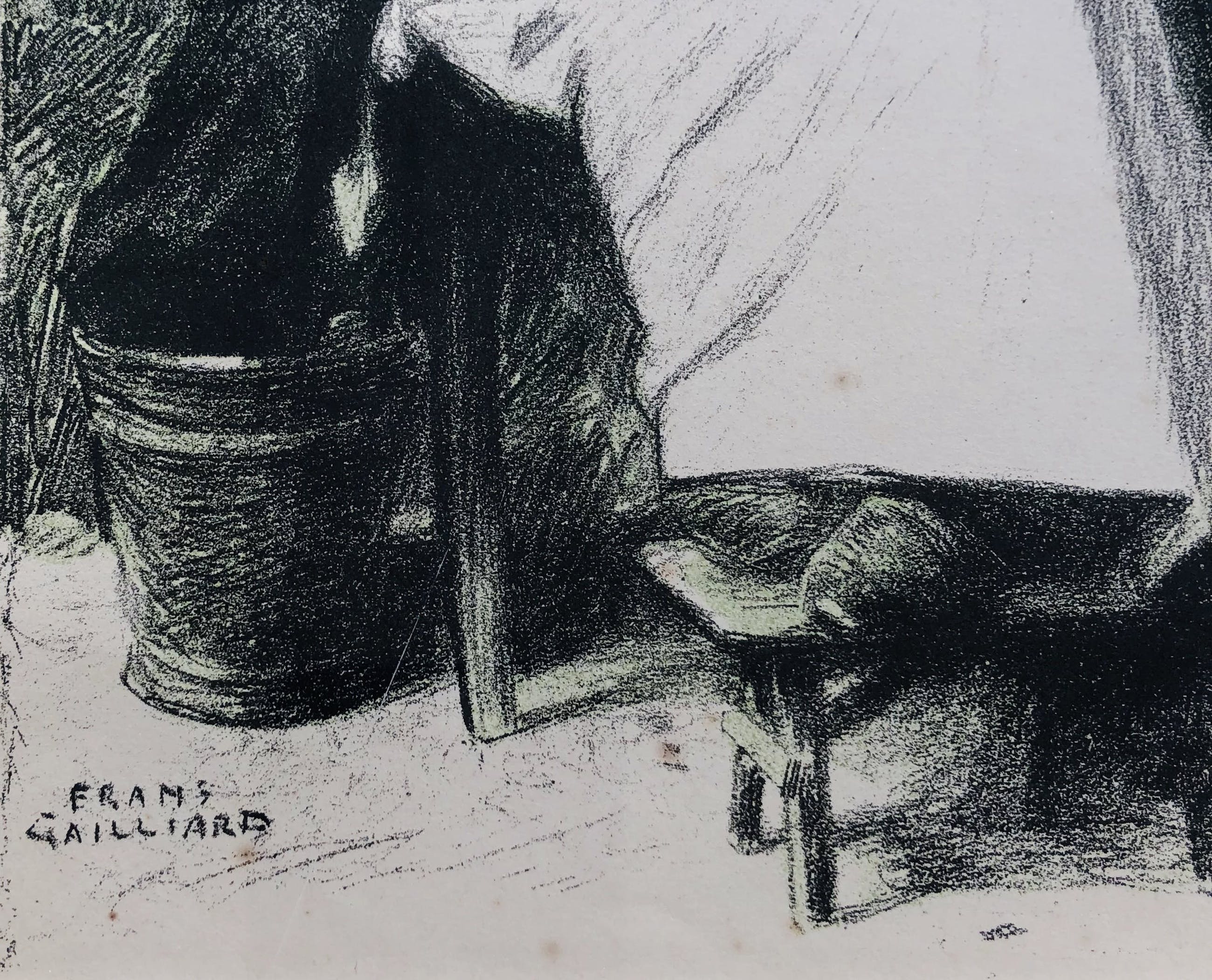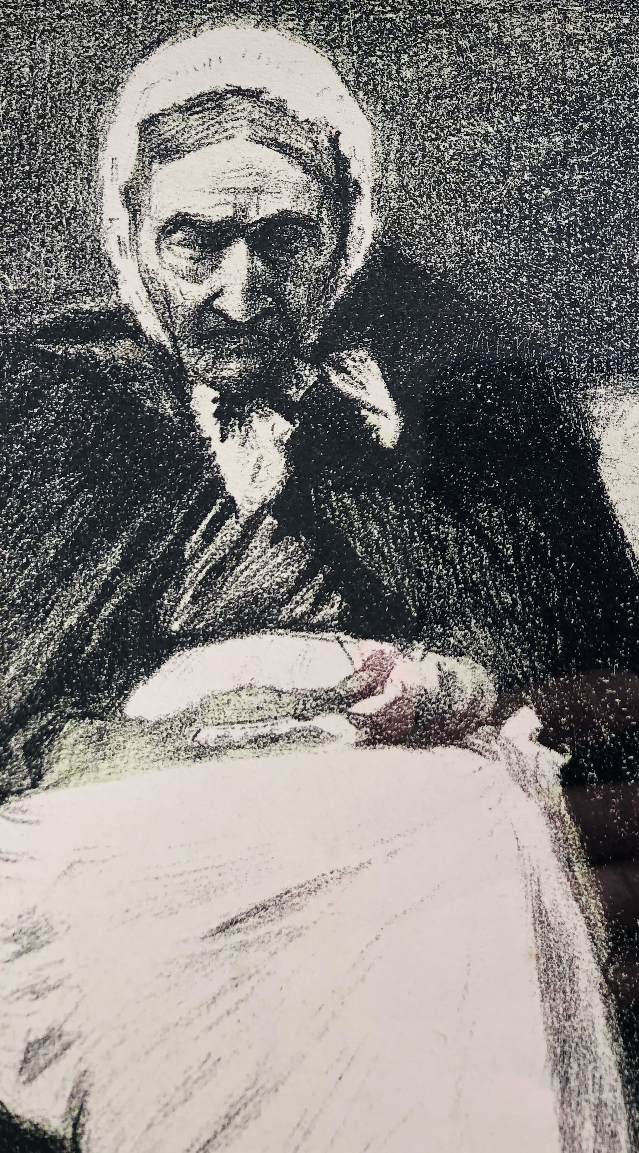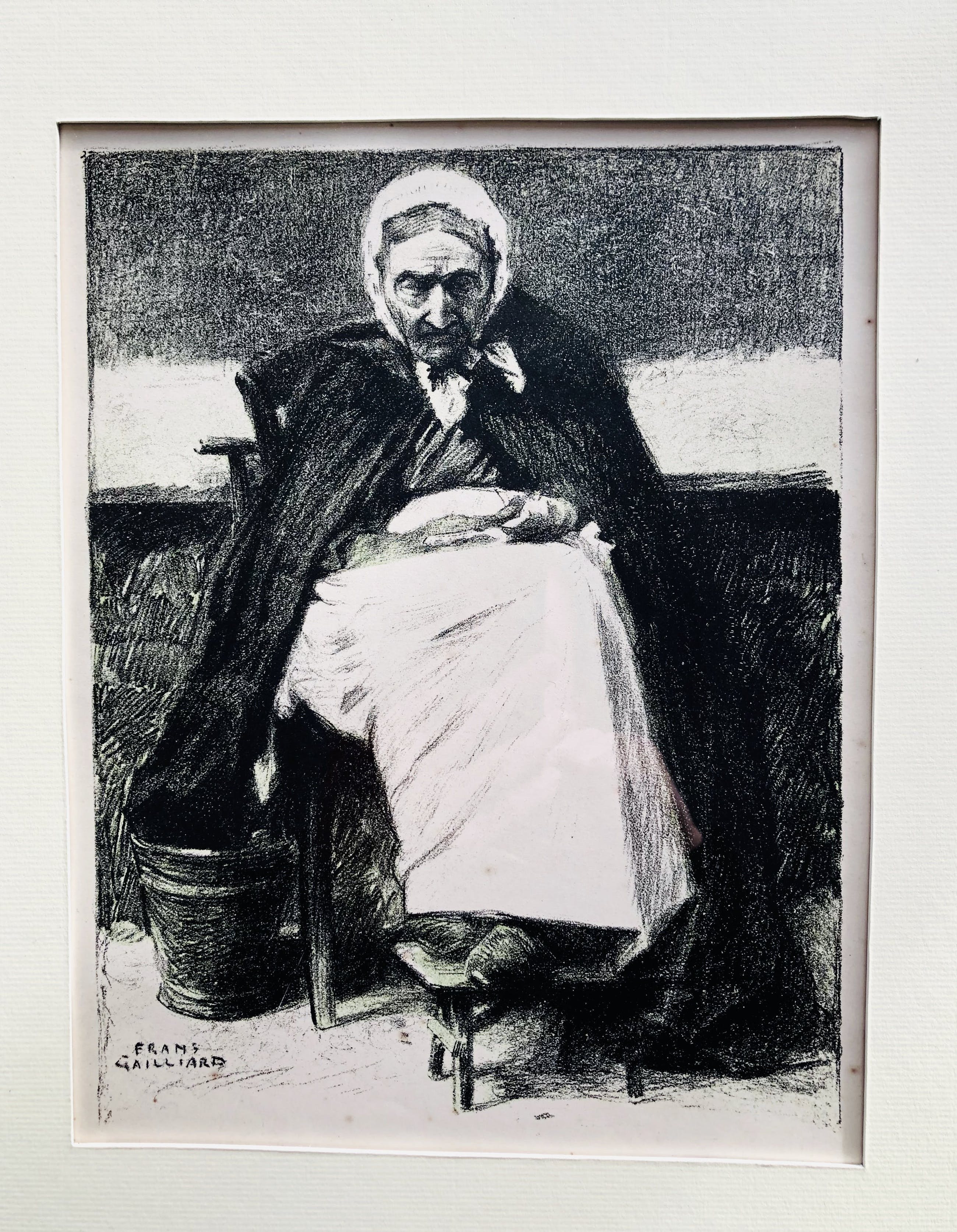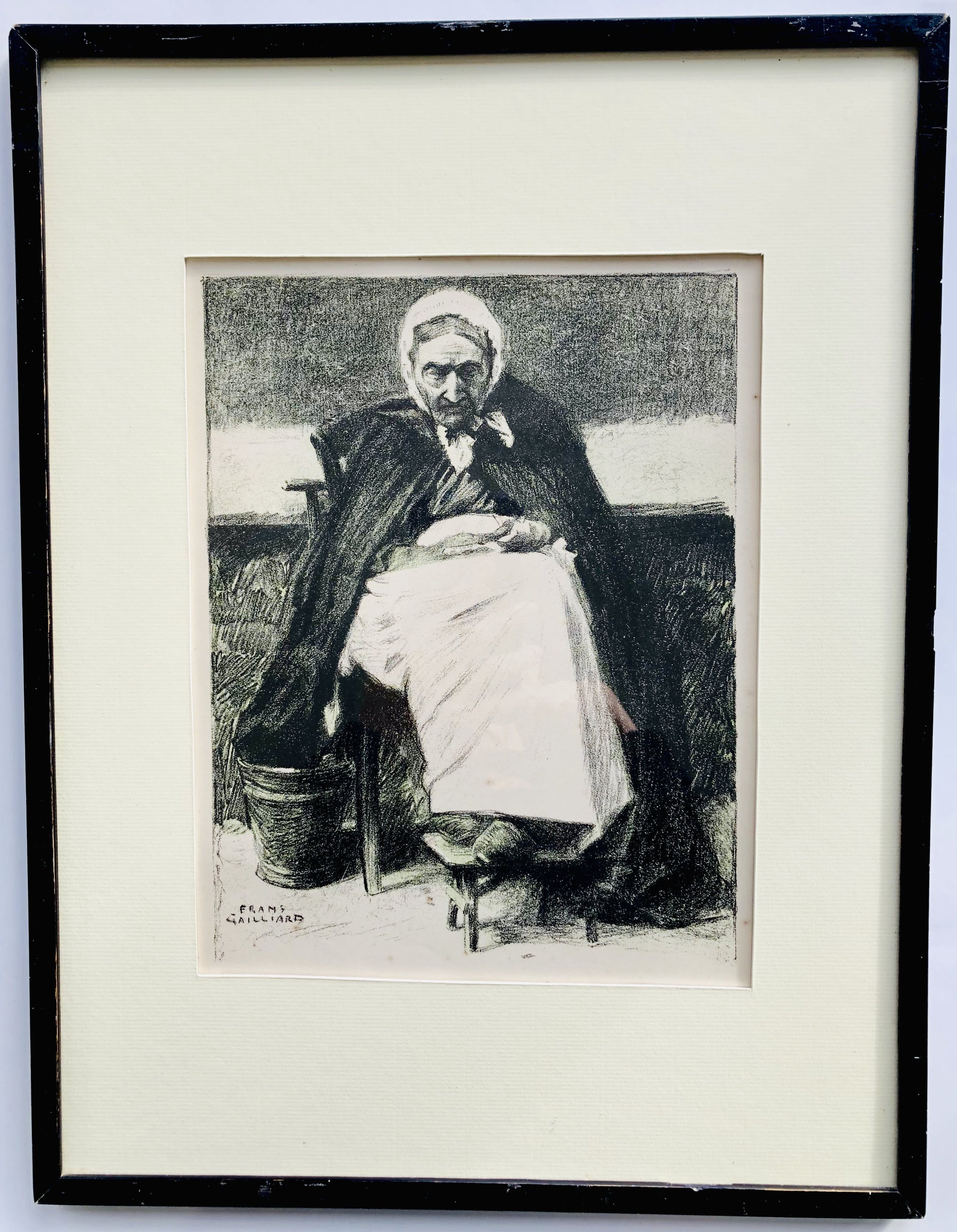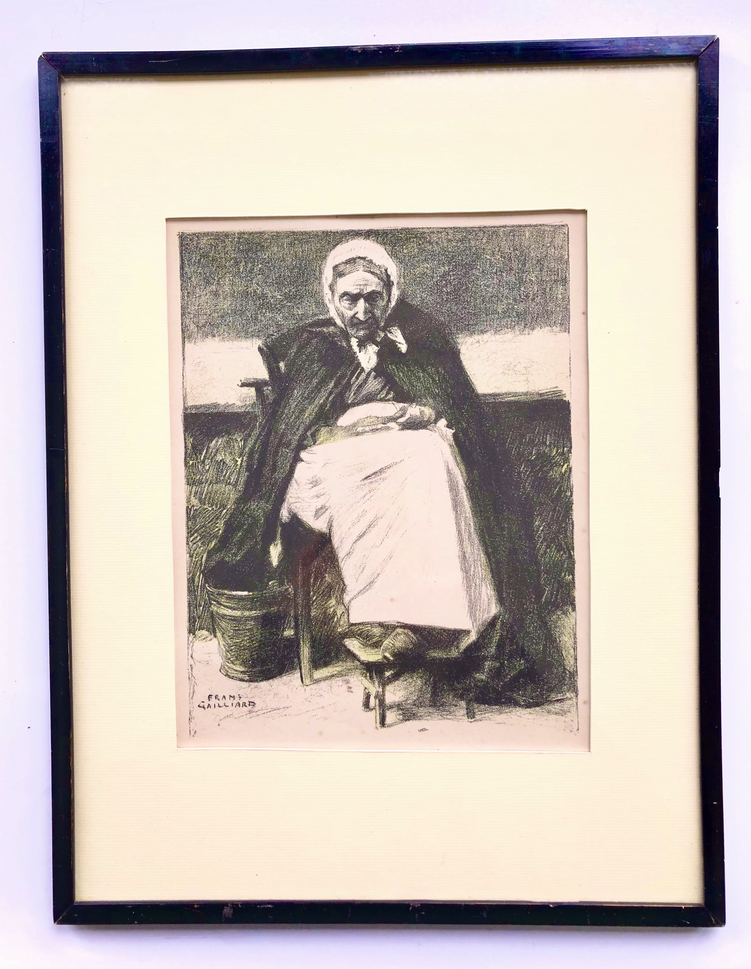 Lithografie van het bekende werk OUD OOSTENDS VROUWTJE, ook wel 'Vrouw uit Oostende' genoemd, van Belgisch schilder en tekenaar FRANZ GAILLIARD (1861-1932).