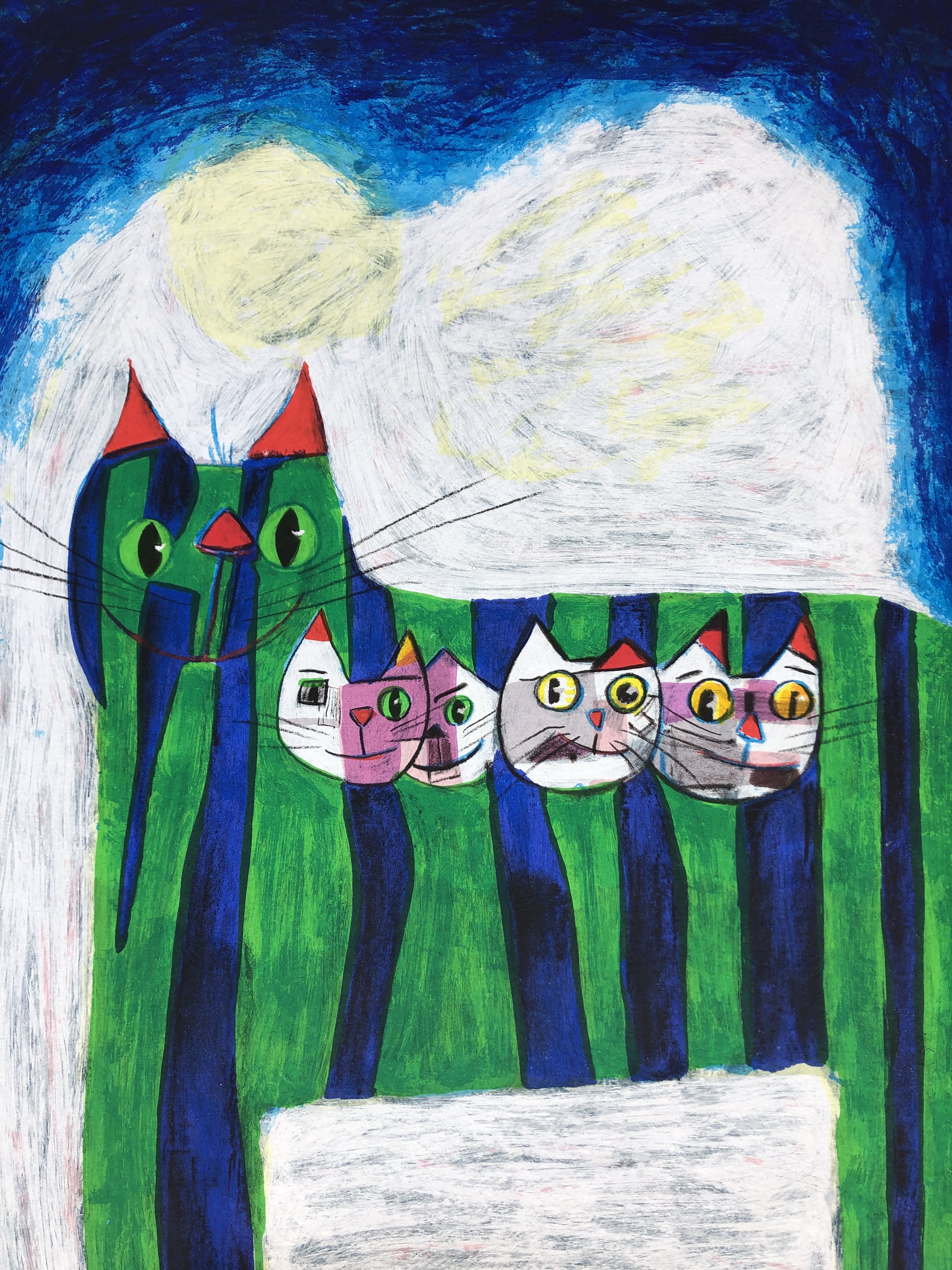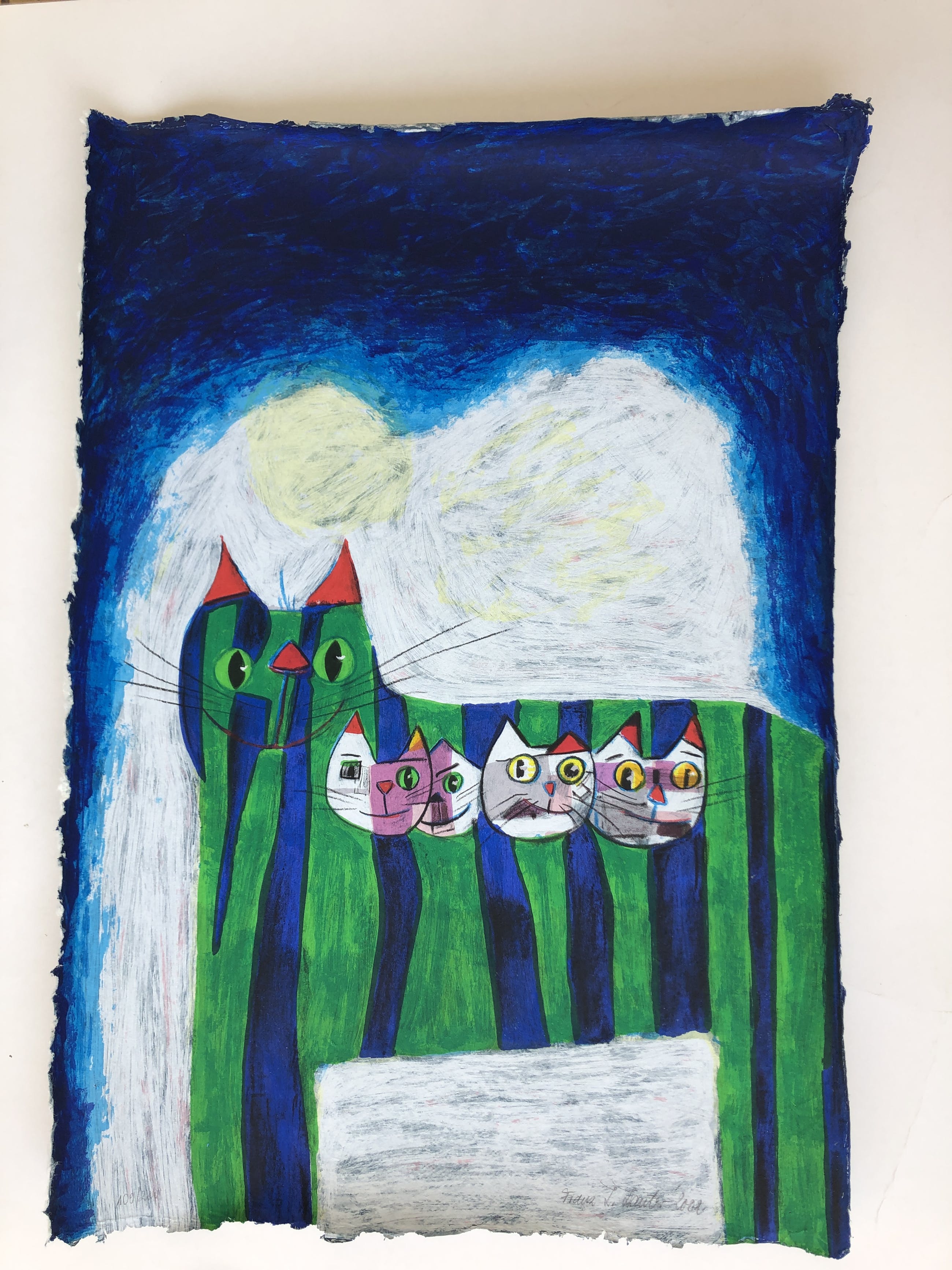 Groot en kleurrijk werk van Lauter! Het werk verdient het om ingelijst te worden. Door de geschepte papierranden leent dit werk zich erg goed om 'zwevend 'ingelijst te worden, waardoor de papierranden in beeld blijven. U mag het vooraf komen beoordelen in de schatkamer van galerie Rotor in Gorinchem.
