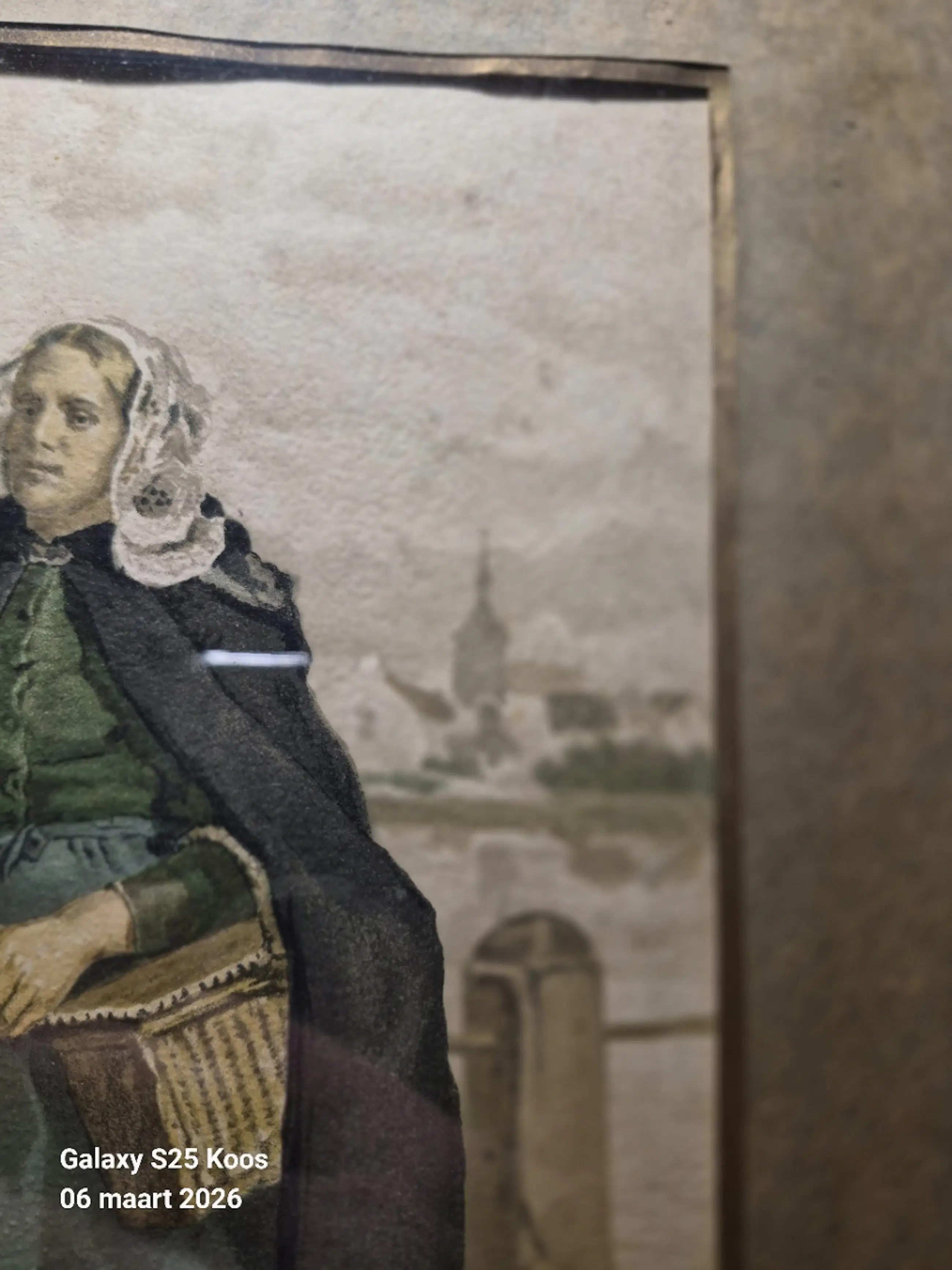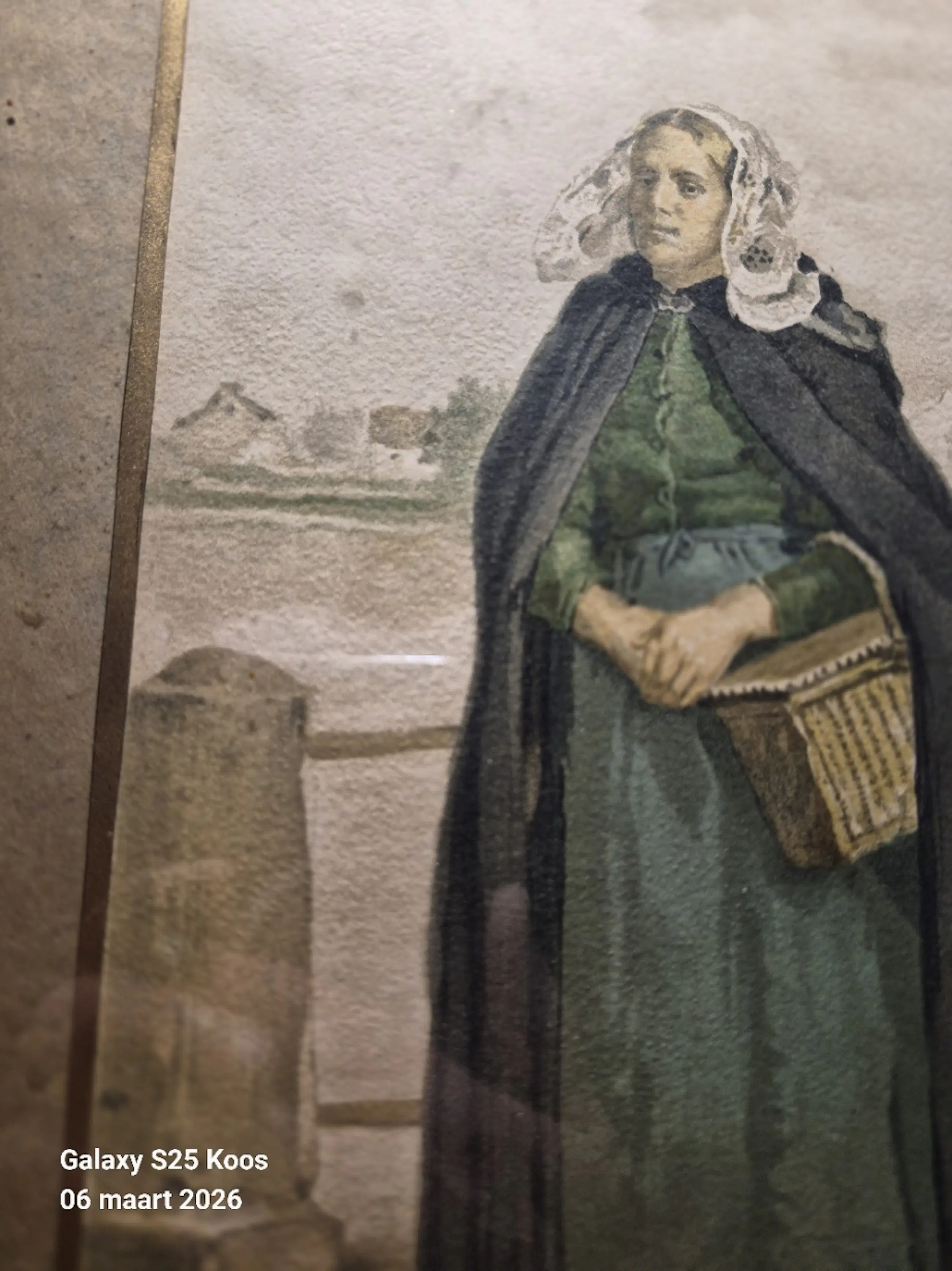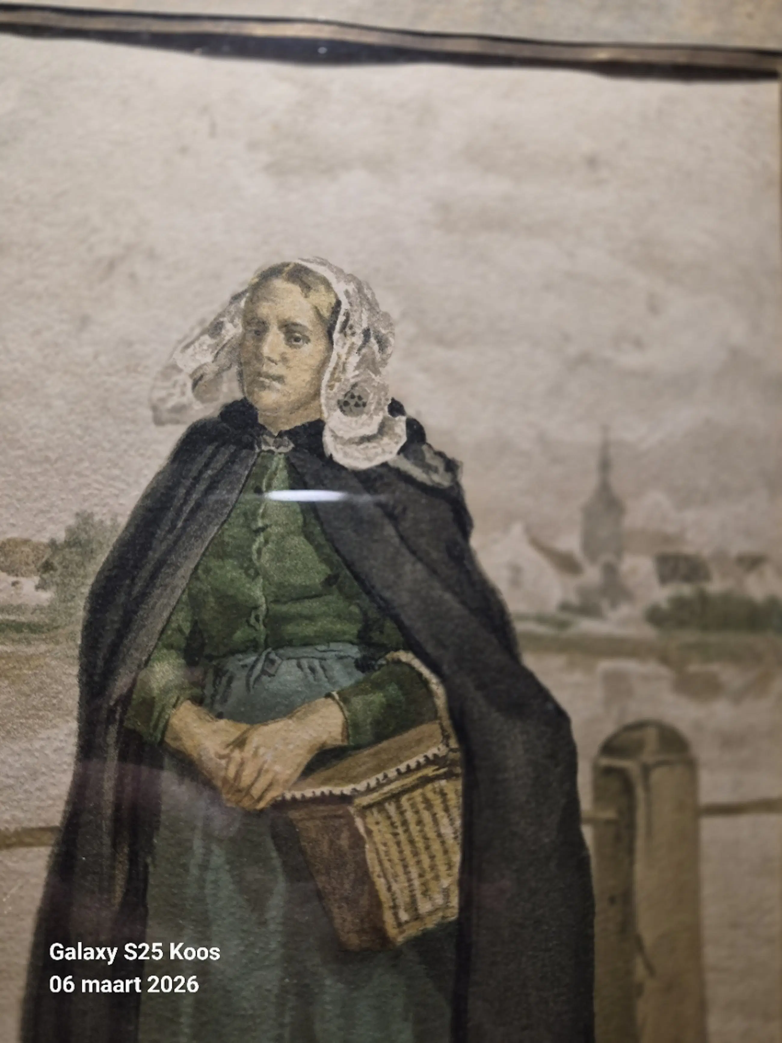 Een zeer fraaie aquarel van een (visser)vrouw met een kanten muts . Muts is zeer fraai afgewerkt. Op de achtergrond is vaag een kerk en wat huizen te zien. De vrouw is vermoedelijk uit Scheveningen of uit Zeeland; Zij draagt een mand . Het werk is in goede staat en duidelijk gesigneerd door de kunstenaar;