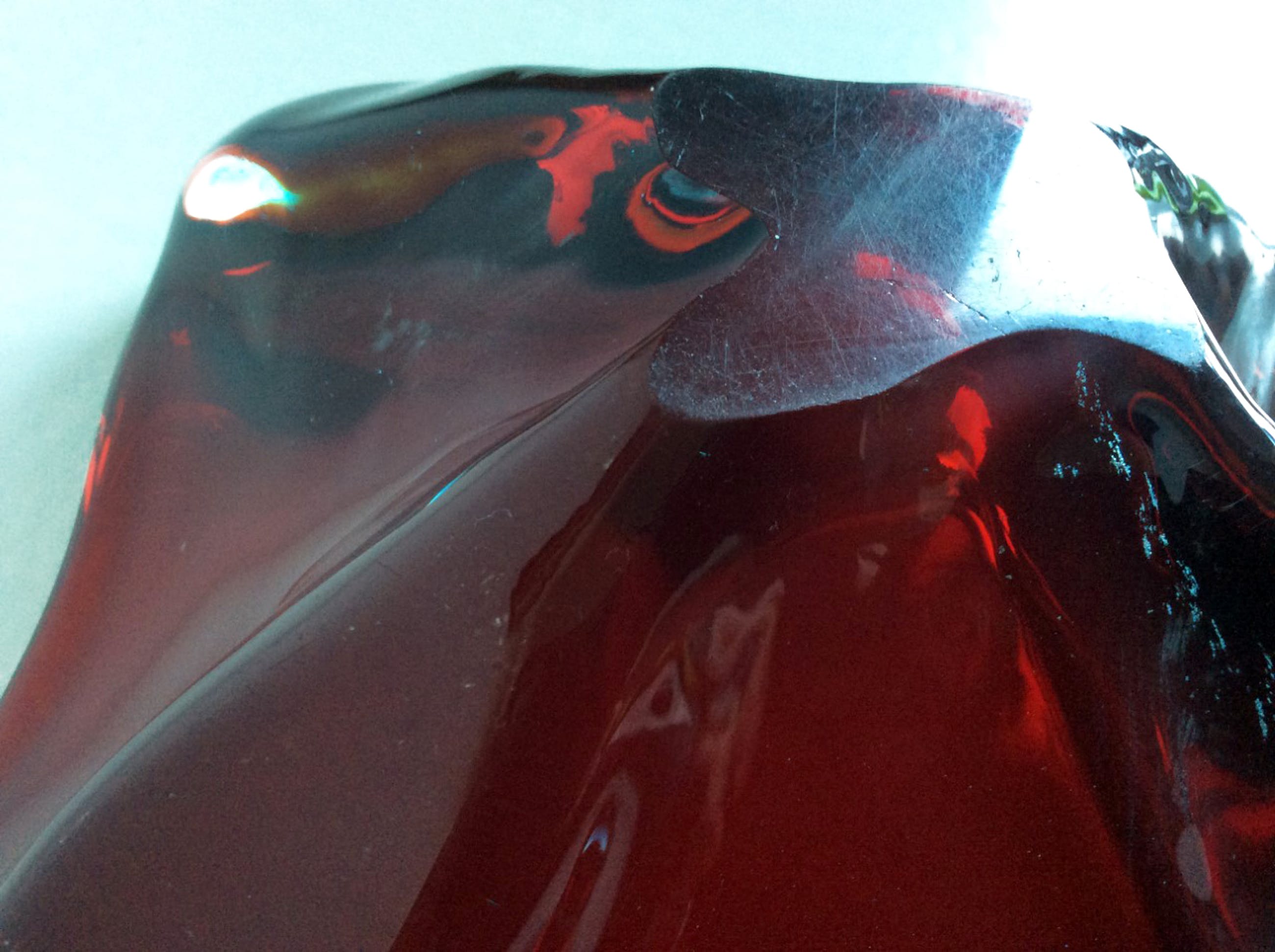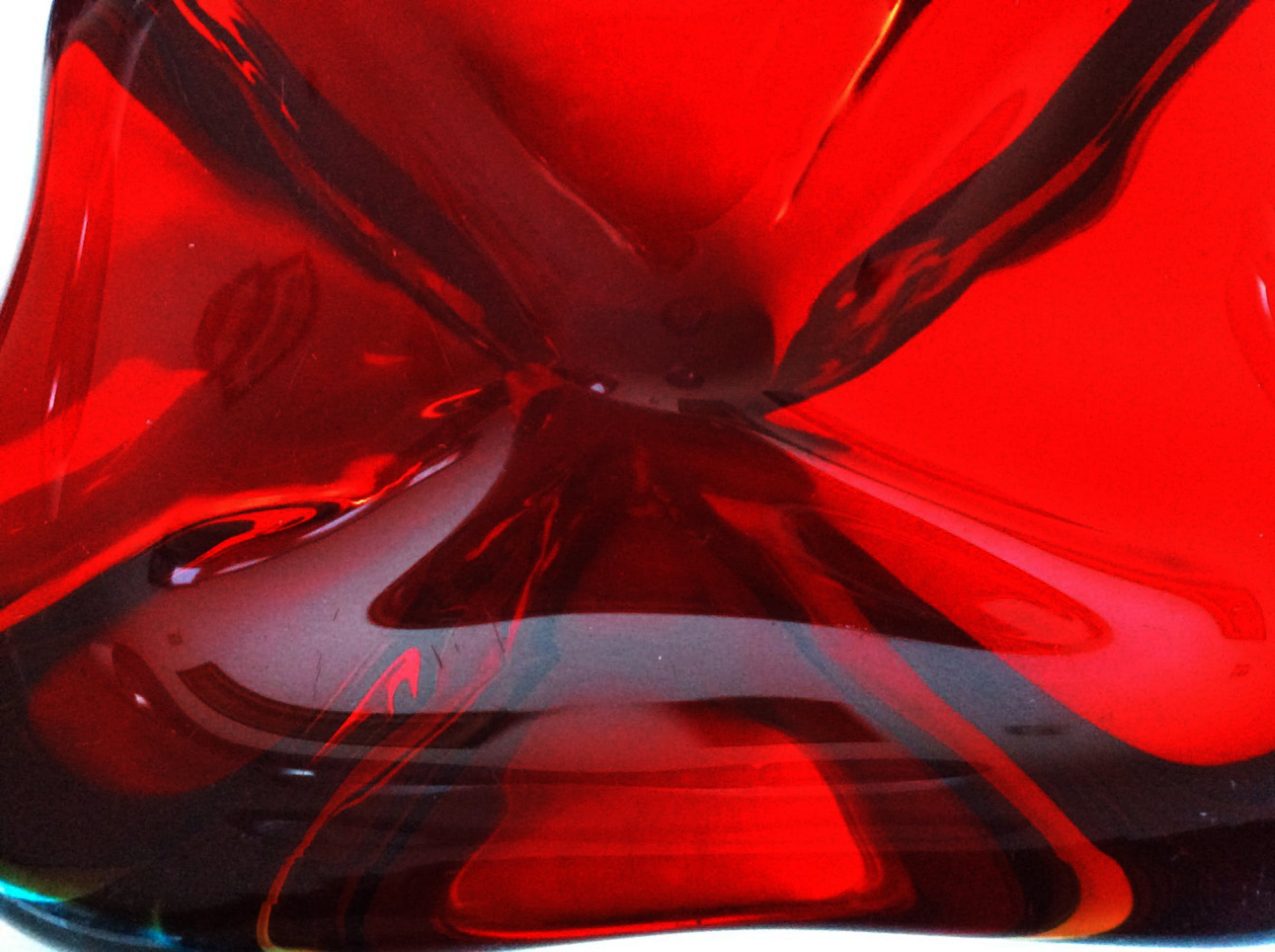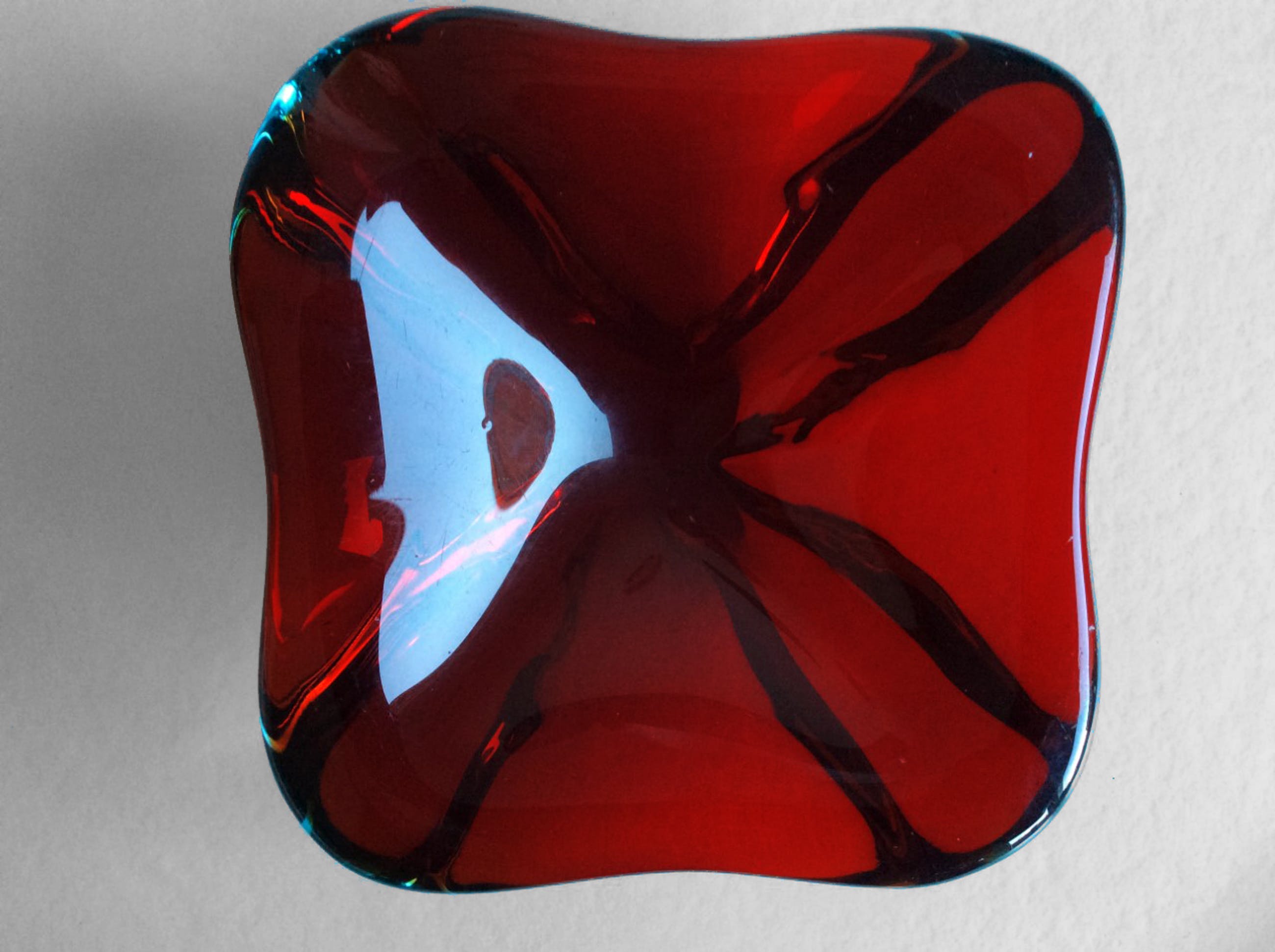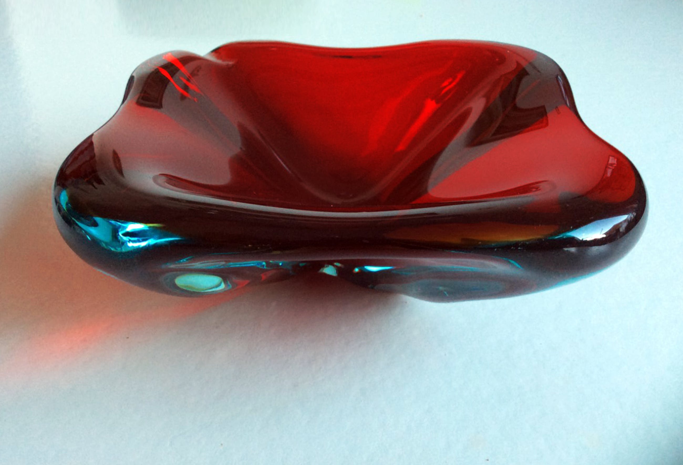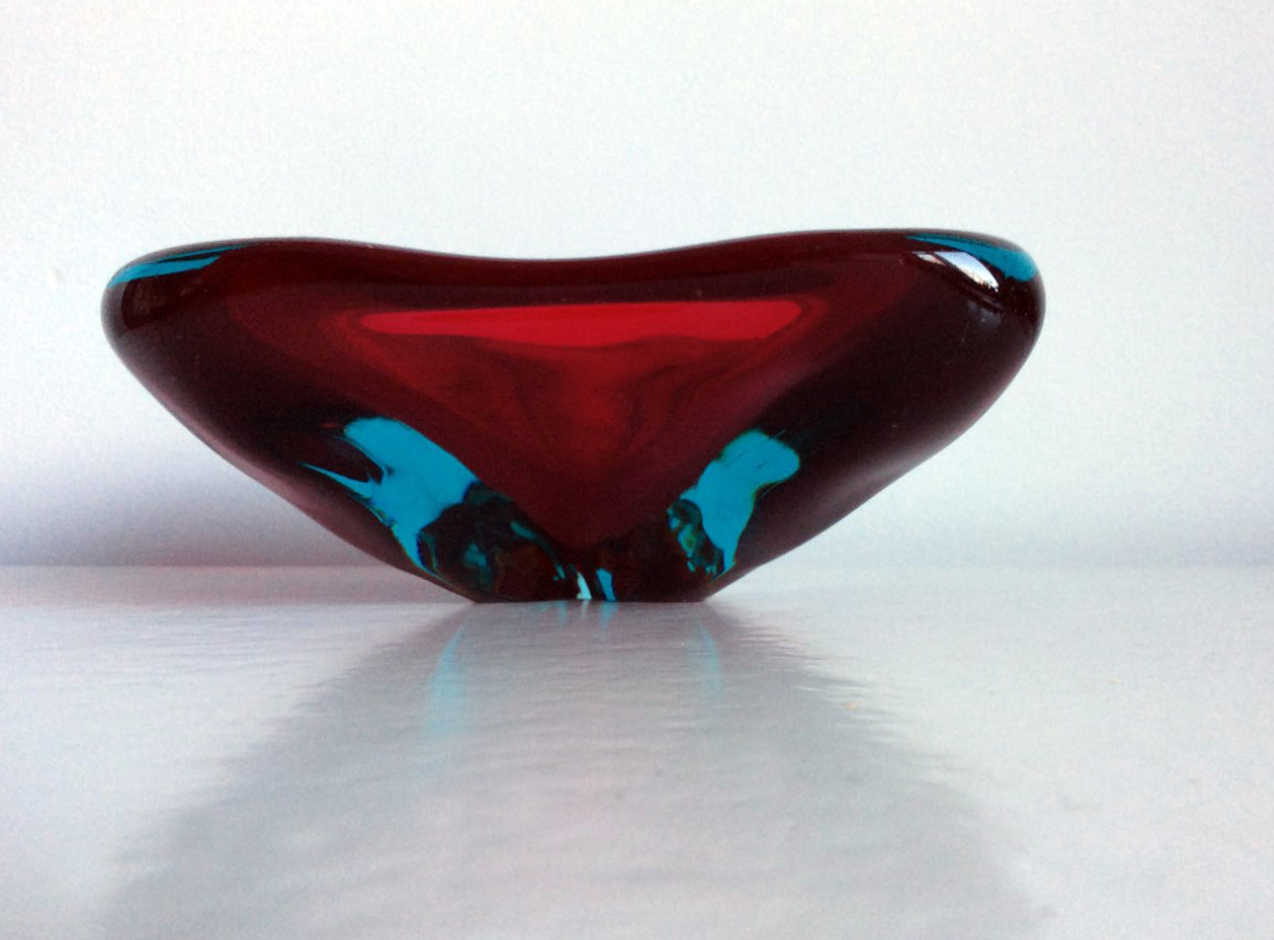 Murano massief glasobject in de kleuren robijnrood en turquoise blauw.Afm. 18 cm breedte en 7 cm hoogte. Gewicht 1774 gram.Italië, ca. 1950.Lichte gebruikssporen, geen defecten.