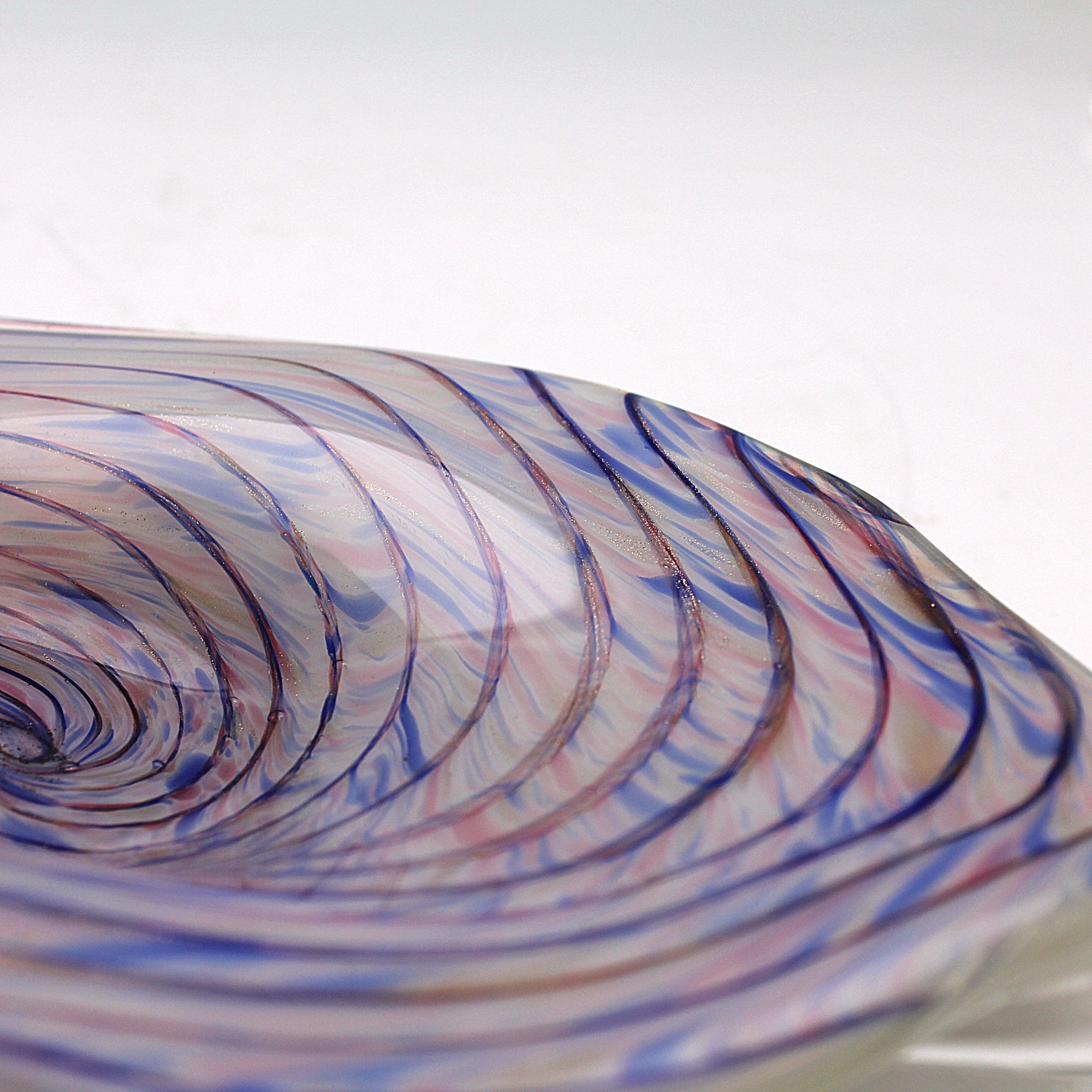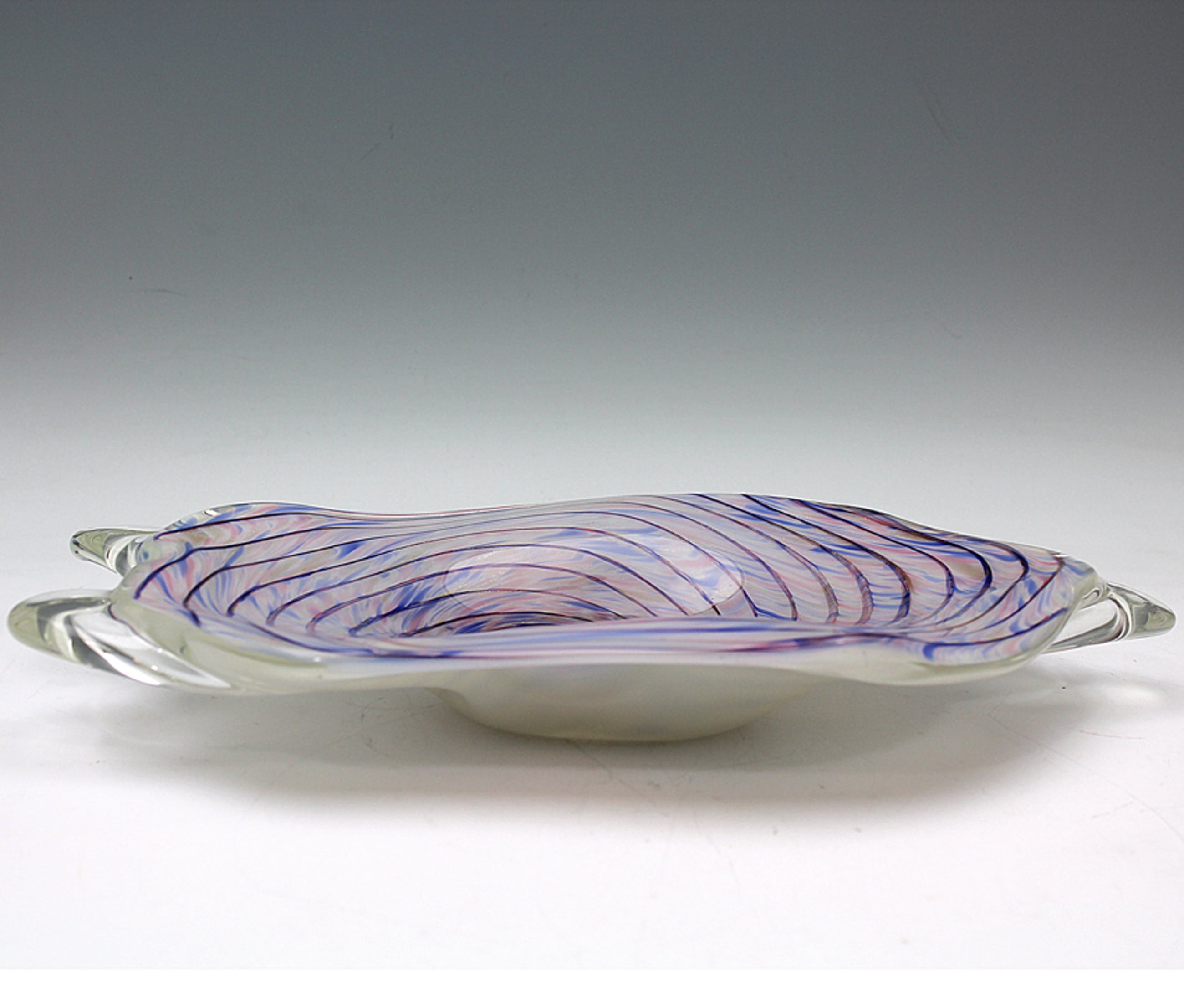 Een blank glazen Murano schaal met een kleur palet van wit, roze, blauw en goud.Gemerkt met sticker zie foto. Wordt aangetekend verstuurd.Ophalen in overleg mogelijk.