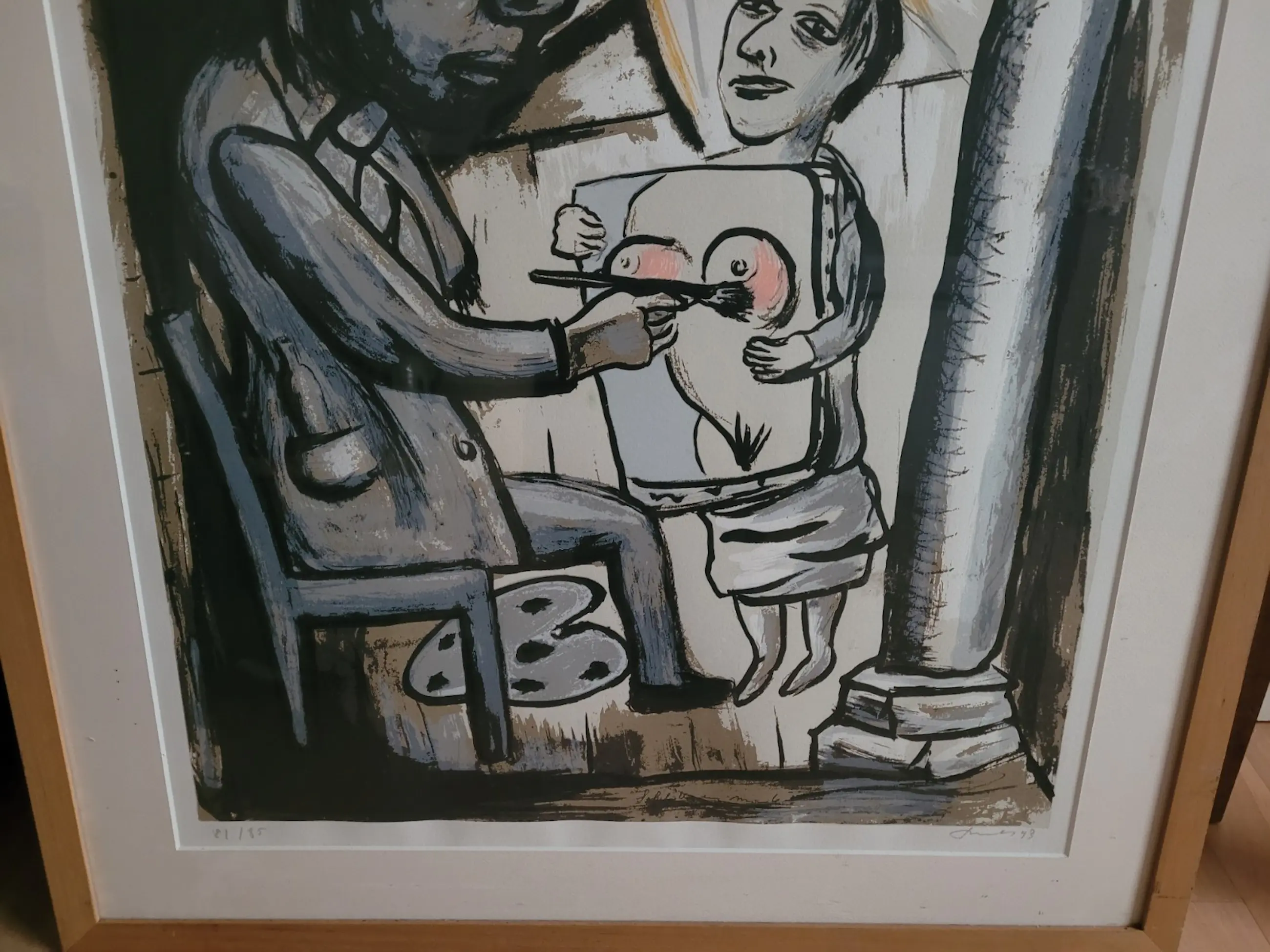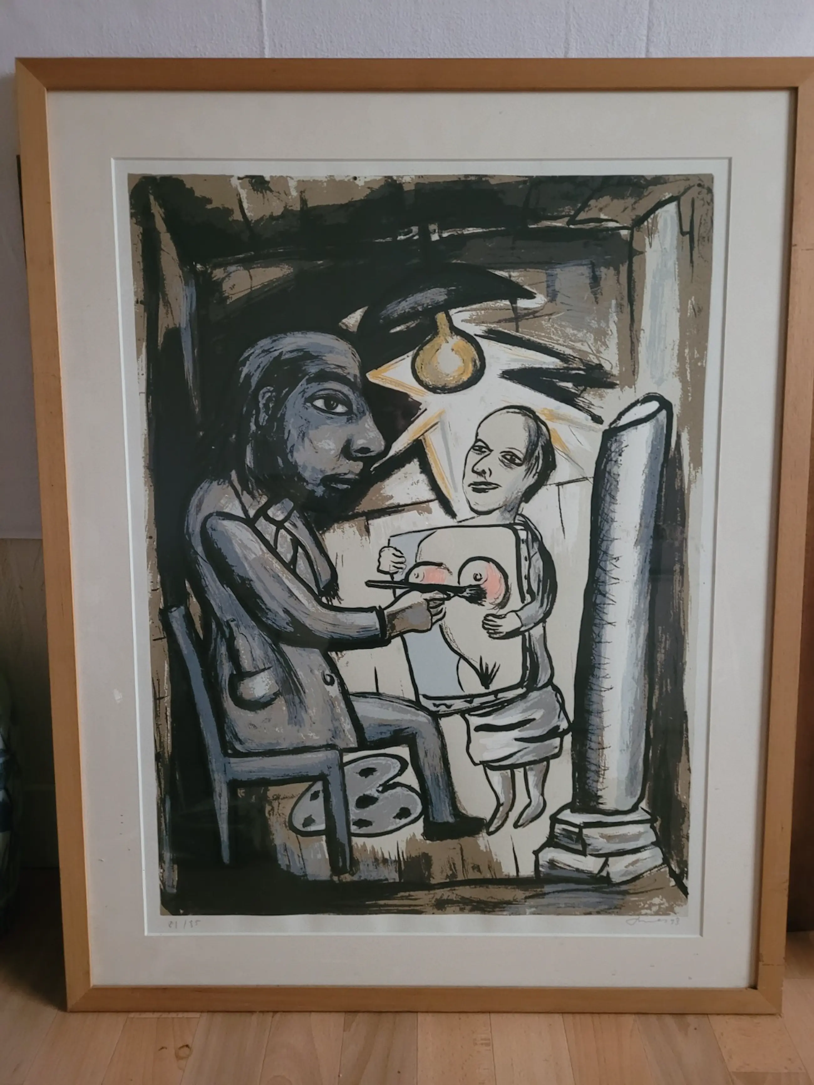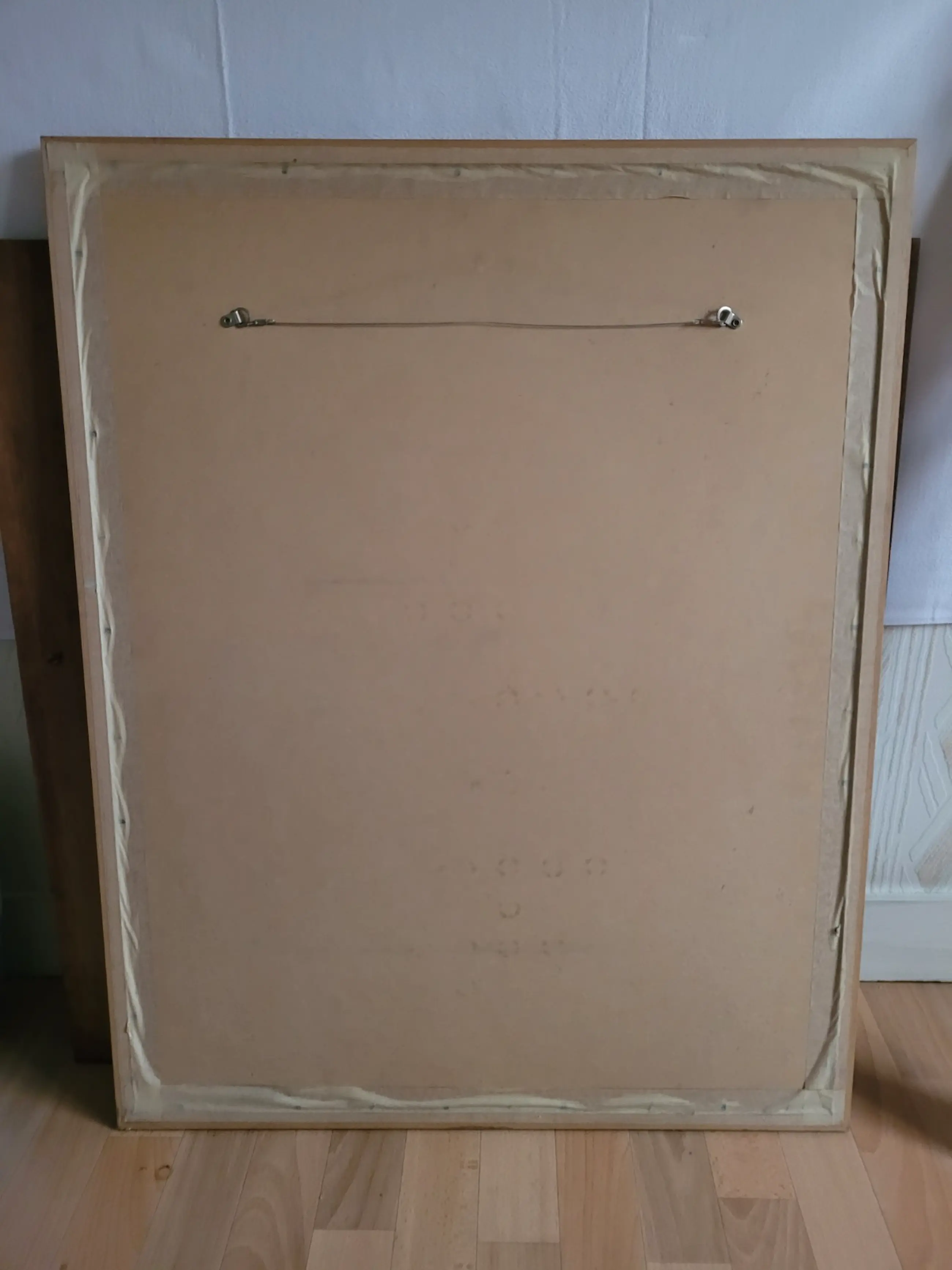 werk in perfecte staat, ingelijst met glas; de lijst vertoont een paar gebruikerssporen aan de linkerkant, zie foto's. verzending binnen België kan besproken worden, buiten België te groot voor reguliere pakketpost. Onderaan in het midden staat vermoedelijk de naam van het werk, maar kan het niet ontcijferen.