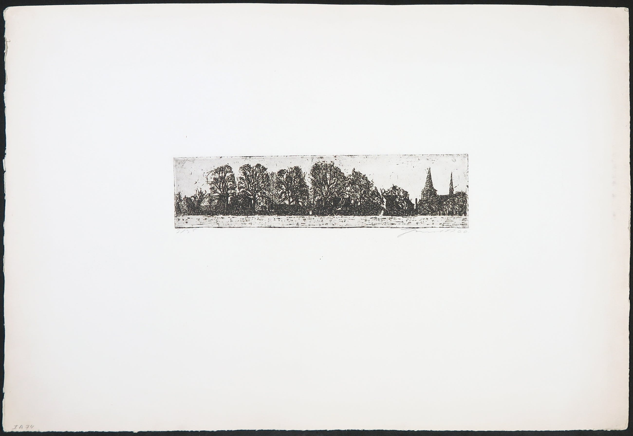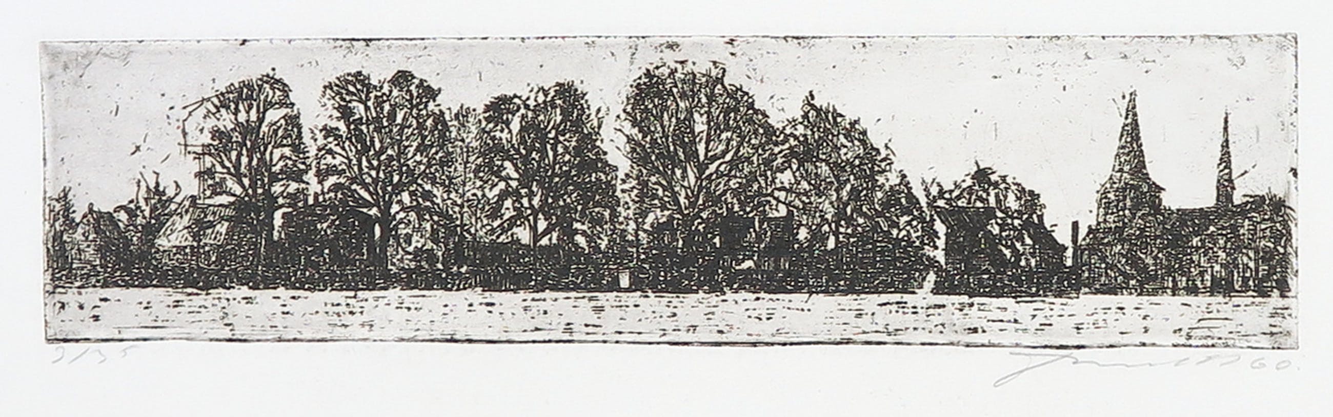 Afmetingen dorpsgezicht: blad: 38 x 56 cm. Beeld: 6.5 x 26 cm.