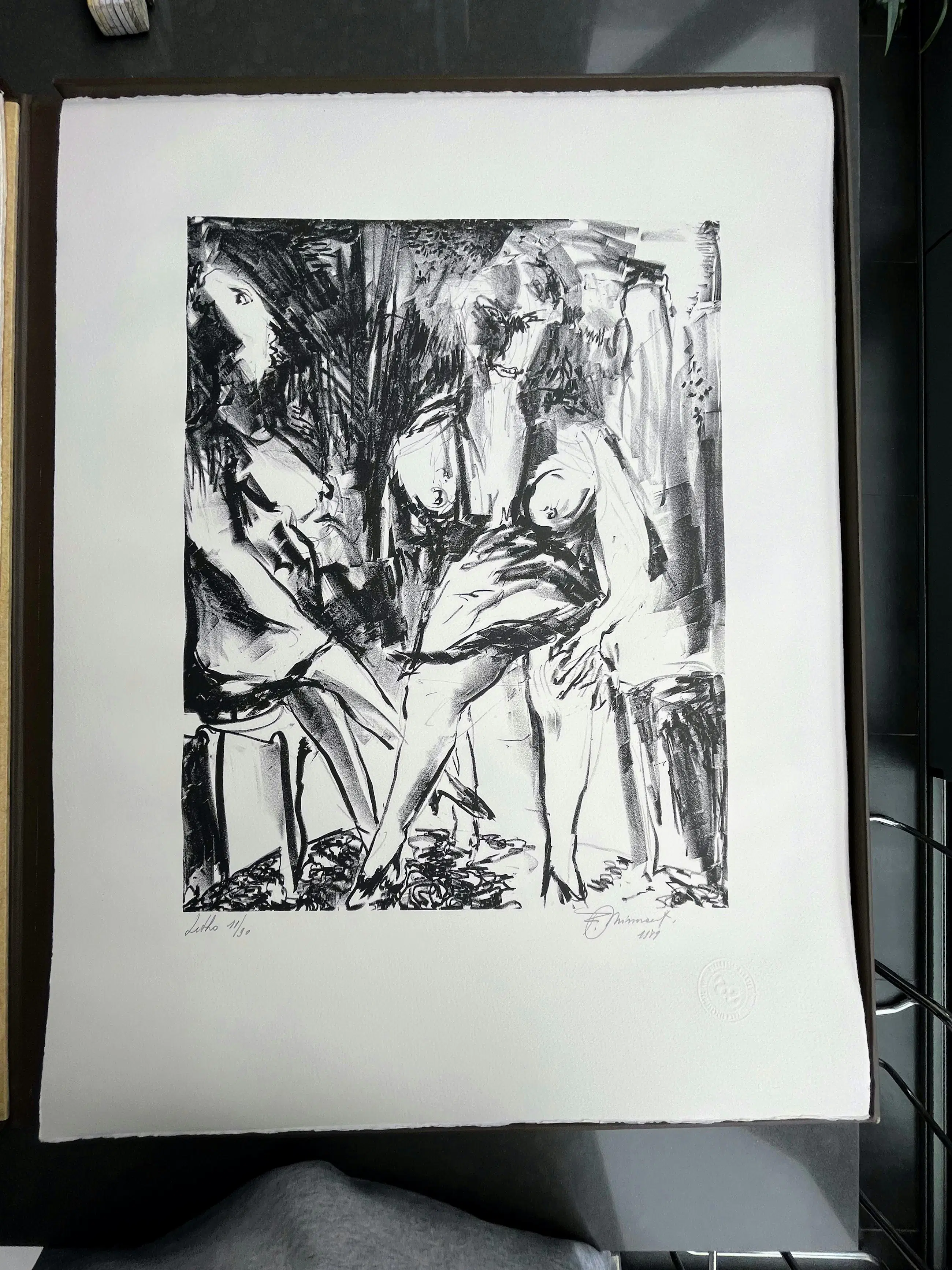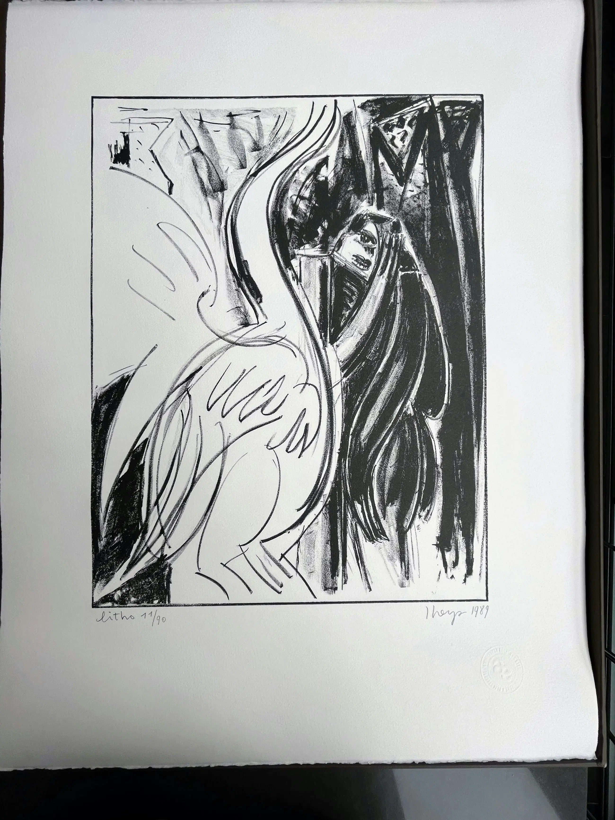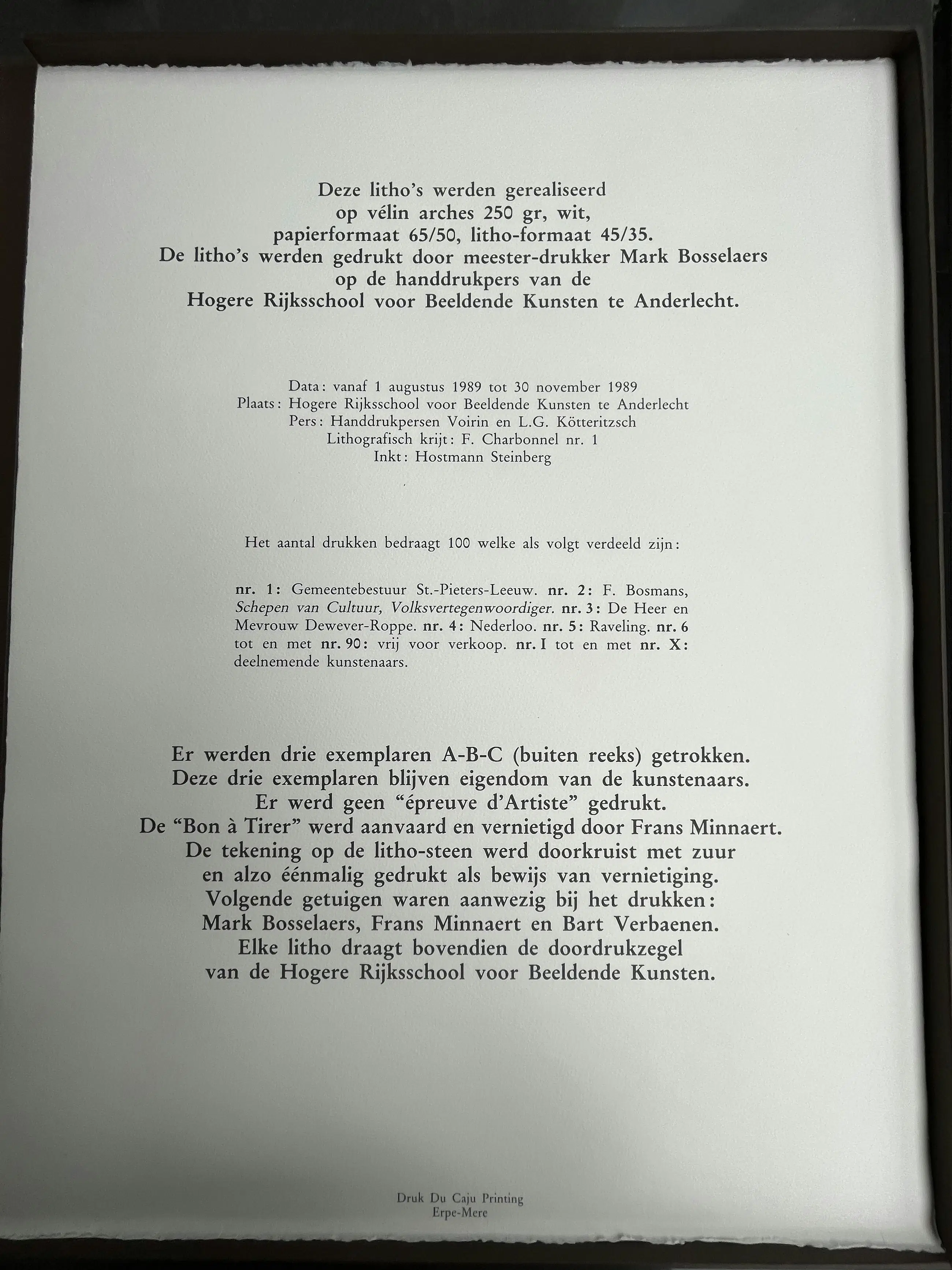 Map met 10 litho's, gerealiseerd op vélin arches 250 gr wit, papierformaat 65/50, litho-formaat 45/35. De litho's werden gedrukt door meester-drukker Mark Bosselaers op de handdrukpers van de Hogere Rijksschool voor Beeldende Kunsten te Anderlecht. Handdrukpersen Voirin en L.G. Kötteritzsch Lithografisch krijt: F. Charbonnel nr. 1 Inkt: Hostmann Steinberg