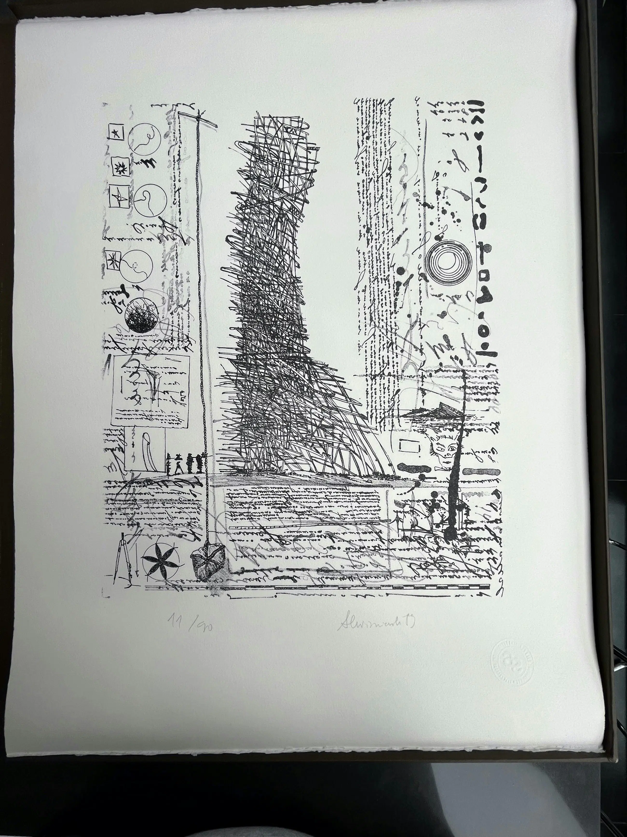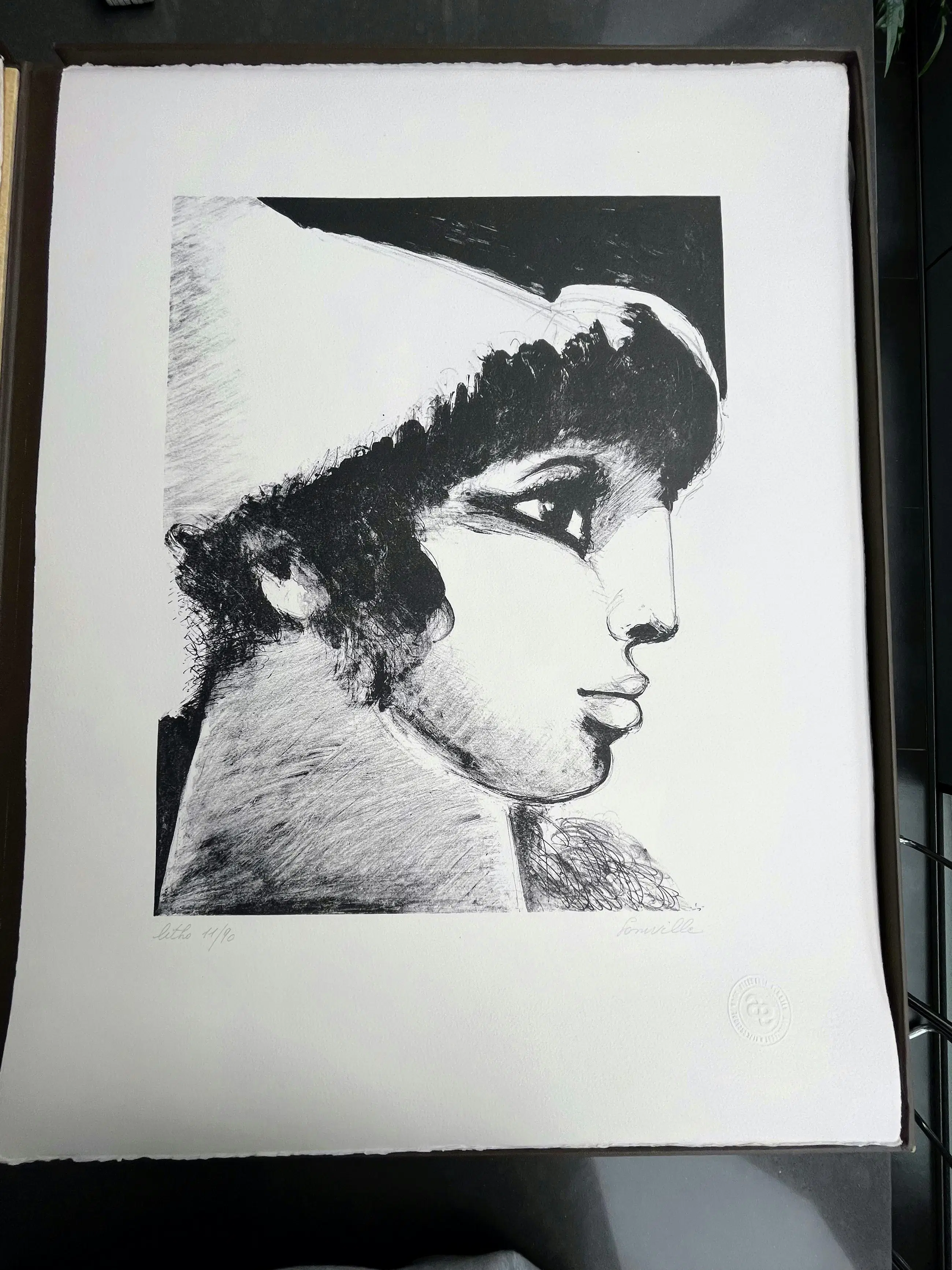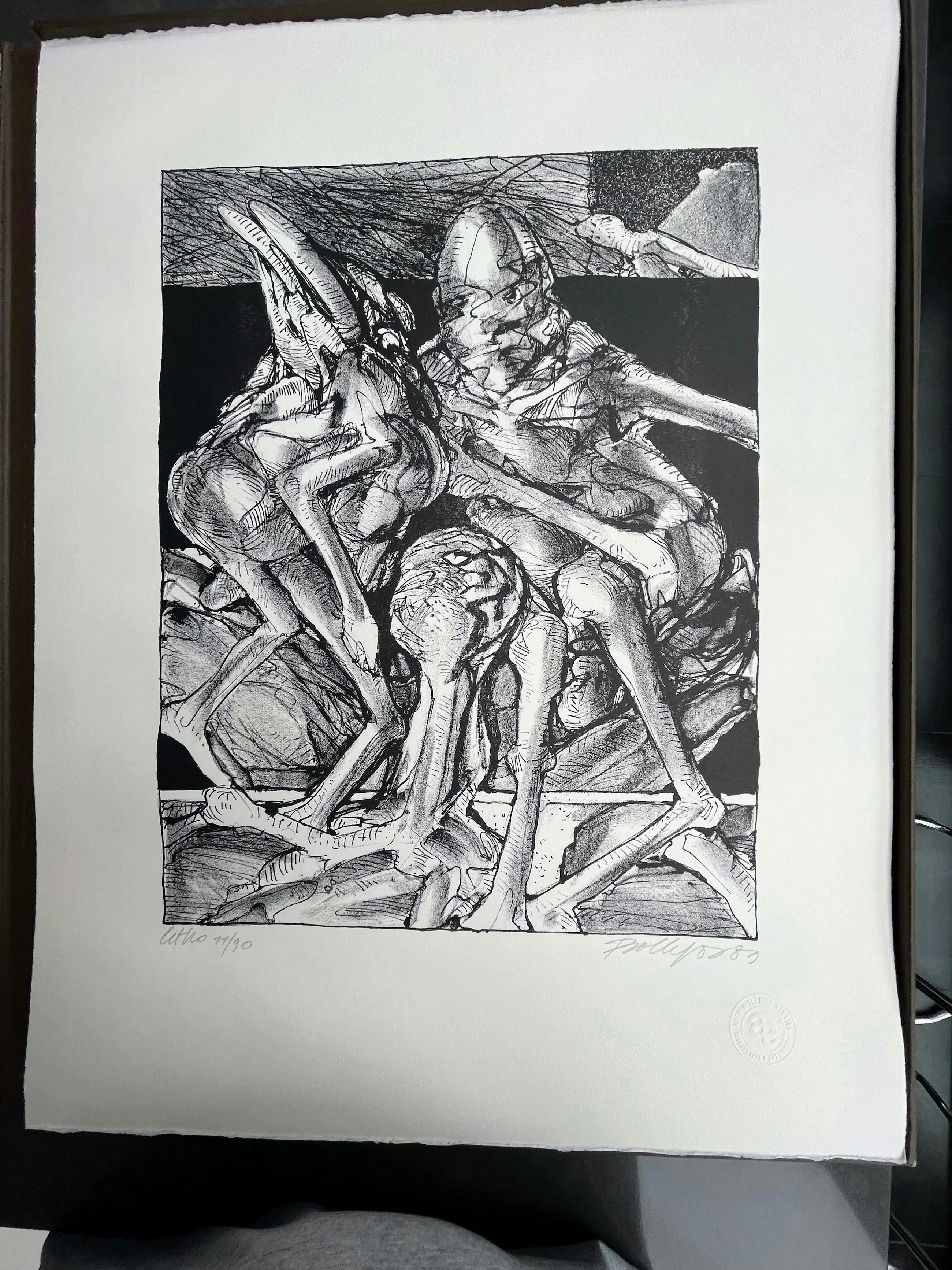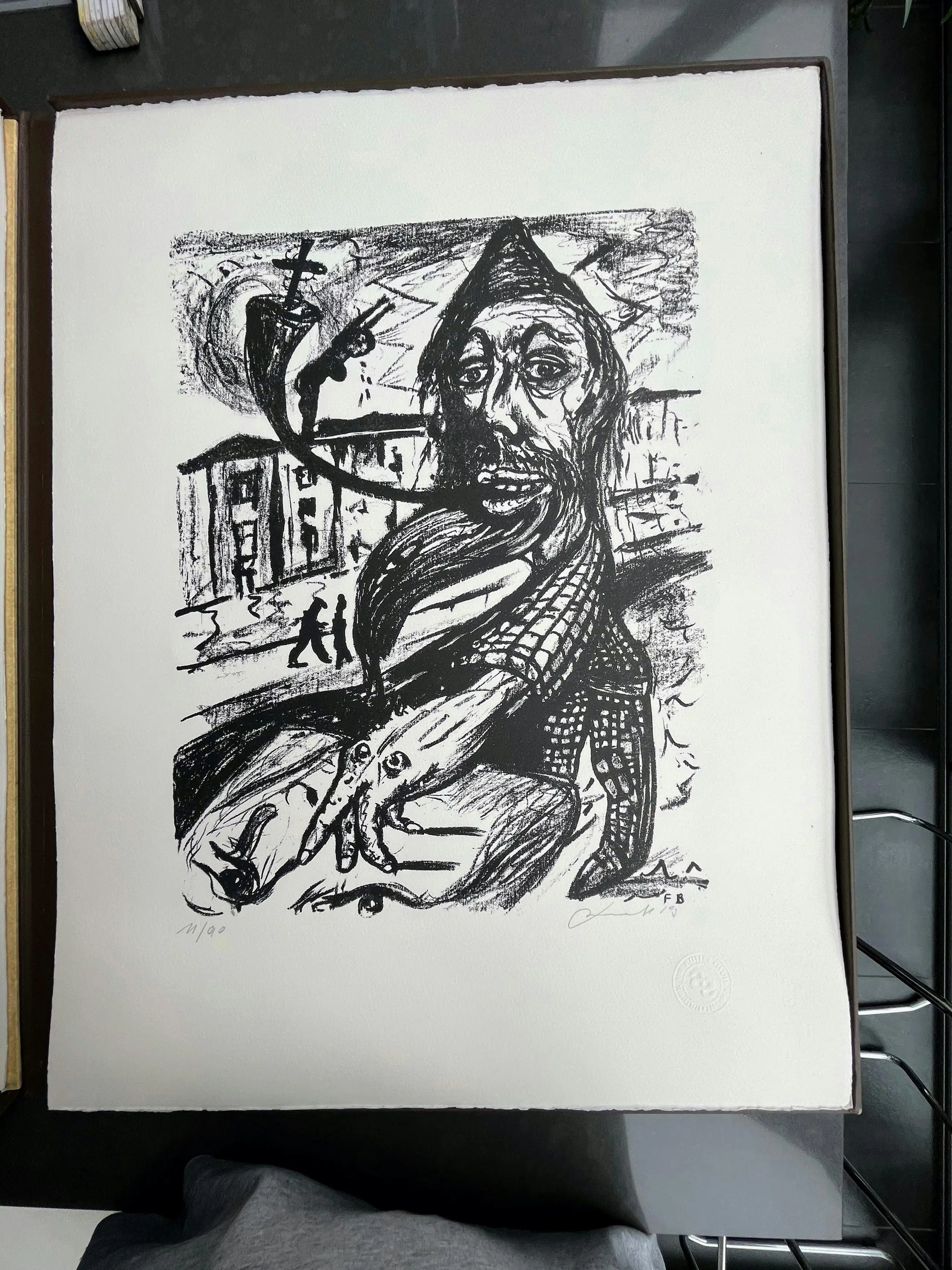 Map met 10 litho's, gerealiseerd op vélin arches 250 gr wit, papierformaat 65/50, litho-formaat 45/35. De litho's werden gedrukt door meester-drukker Mark Bosselaers op de handdrukpers van de Hogere Rijksschool voor Beeldende Kunsten te Anderlecht. Handdrukpersen Voirin en L.G. Kötteritzsch Lithografisch krijt: F. Charbonnel nr. 1 Inkt: Hostmann Steinberg