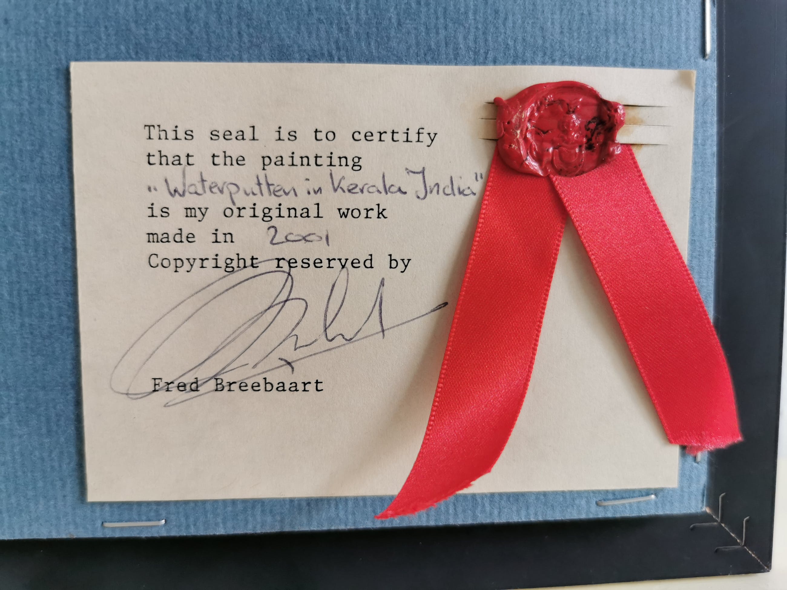 Mooi kleurrijk tafereel van Fred Breebaart, genaamd "Waterputten in Kerala India". Het schilderij is in zeer goed staat. Op de lijst zijn enkele lichte gebruikssporen zichtbaar.
