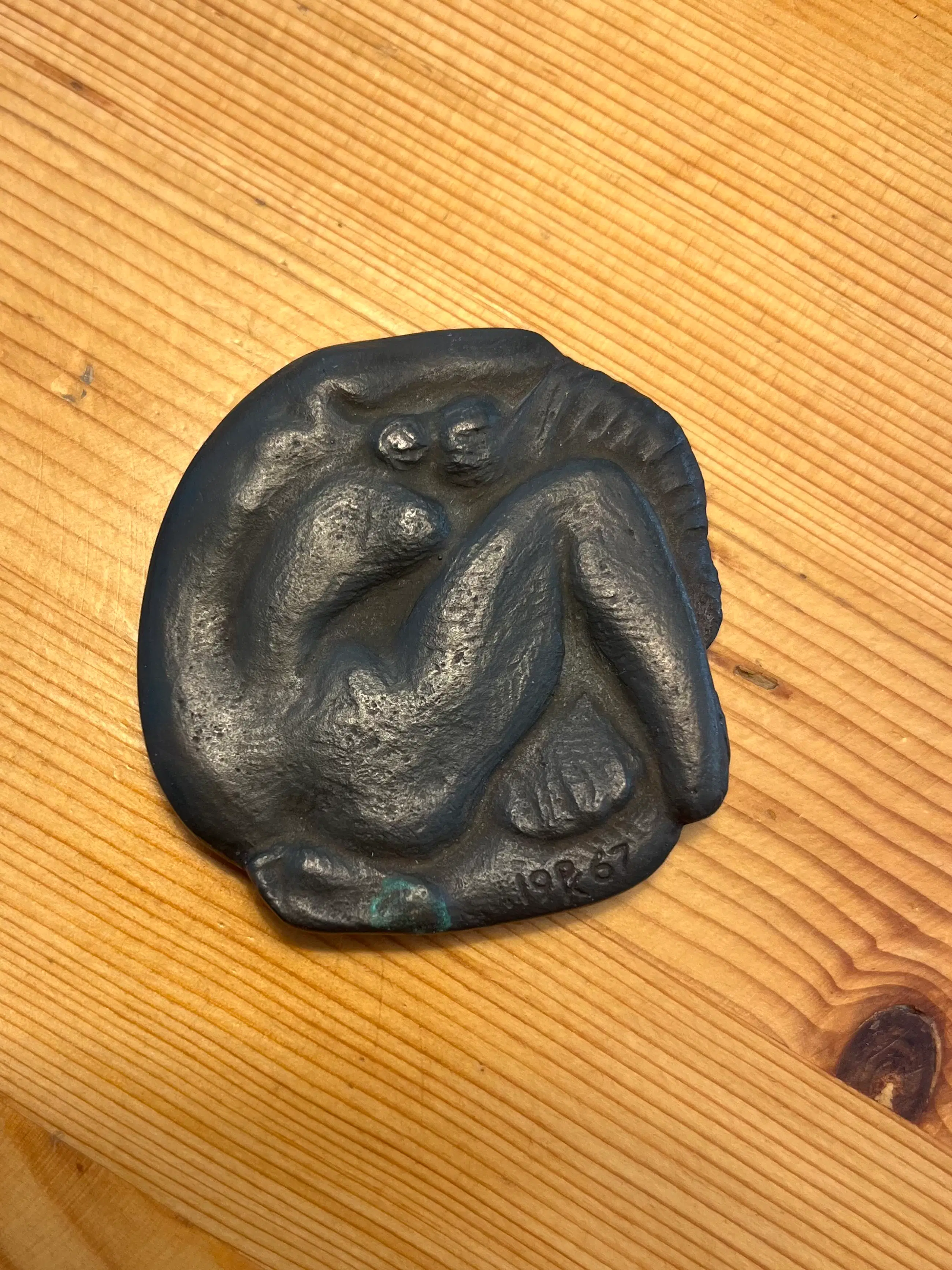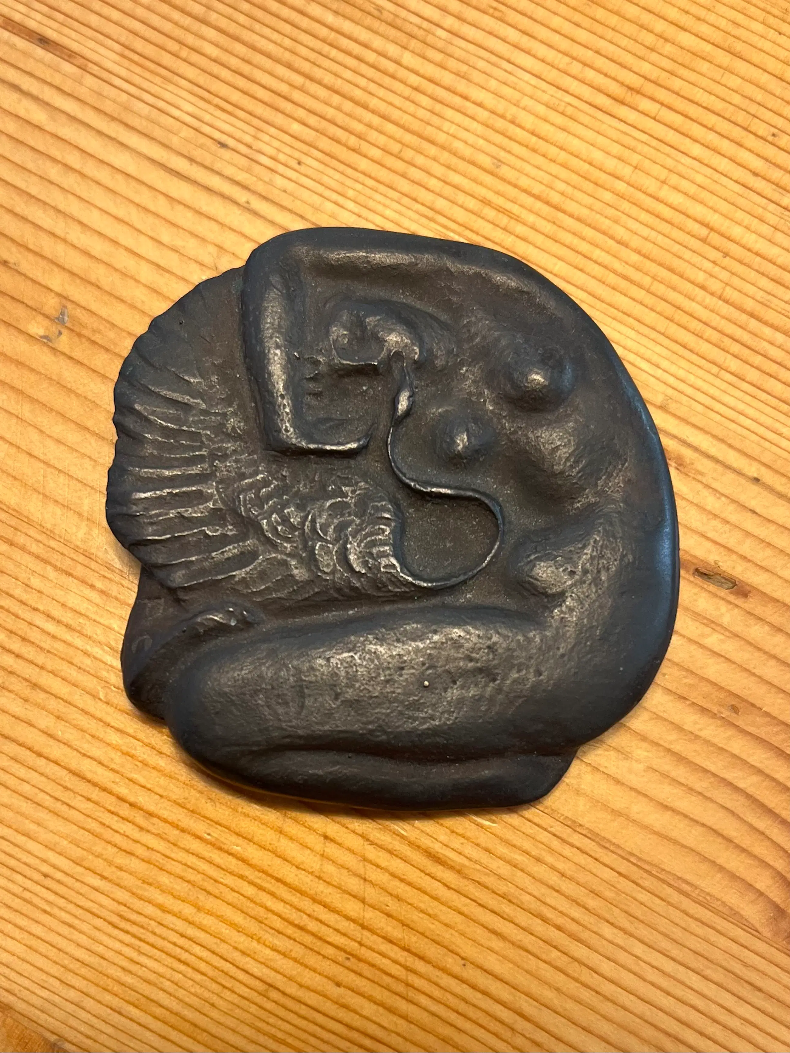 Deze penning werd in 1967 ontworpen door beeldhouwer Fred Carasso (1899–1969) voor de Vereniging voor Penningkunst. Carasso koos voor het mythologische motief van Leda en de zwaan, een thema dat aansluit bij zijn mediterrane achtergrond en zijn grote belangstelling voor klassieke beeldtradities. Het reliëf toont een gehurkte vrouwelijke figuur in innige omstrengeling met de zwaan, waarbij de voorstelling doorloopt van de voor- naar de keerzijde. Daarmee doorbreekt Carasso de traditionele opvatting van de penning en creëert hij een sculpturale vorm binnen de cirkel. Het werk laat zien hoe Carasso de grenzen tussen beeldhouwkunst en penningkunst op subtiele wijze wist te verbinden.