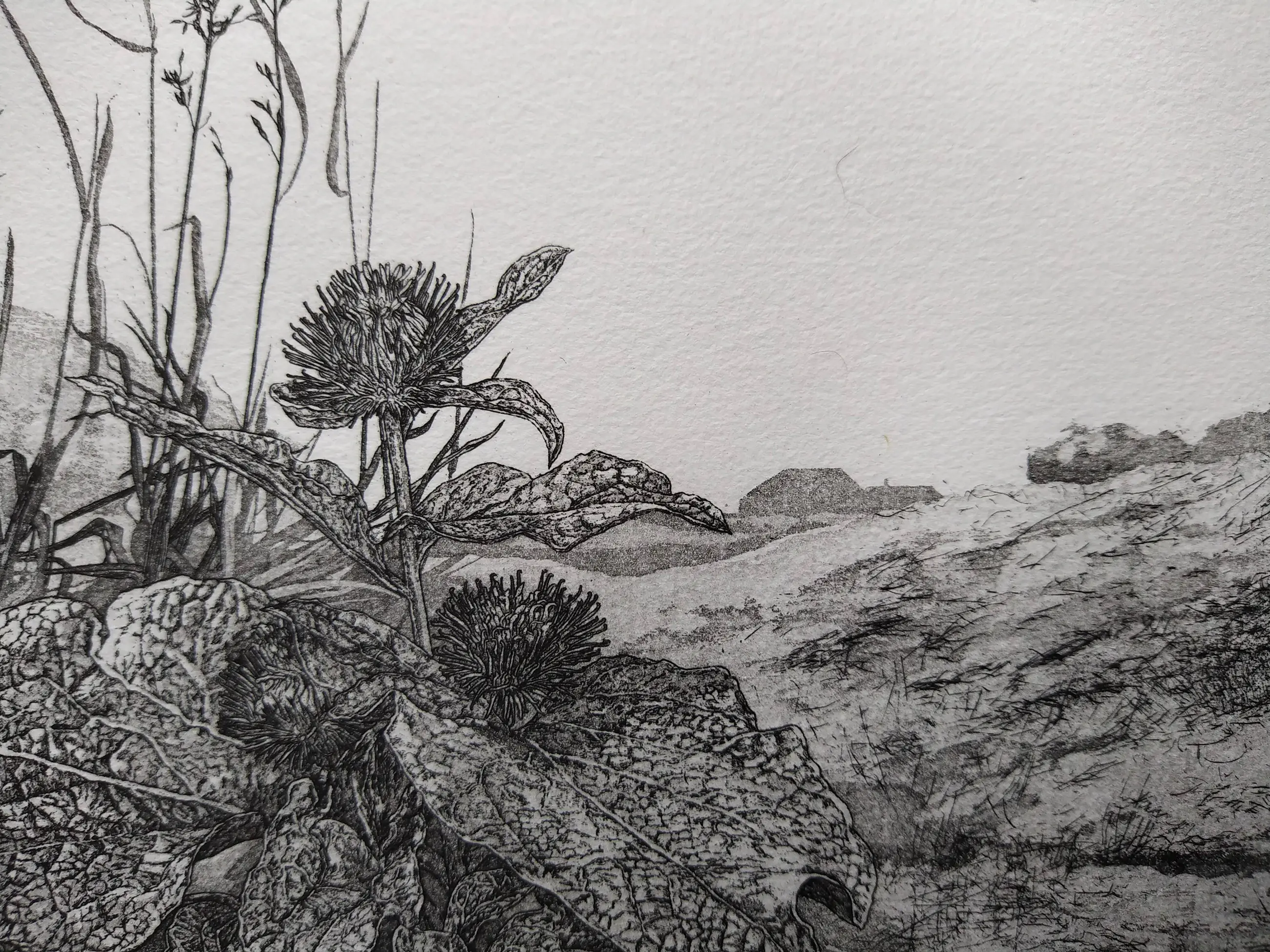 Mooie ets van een landschap met planten duidelijk op de voorgrond.