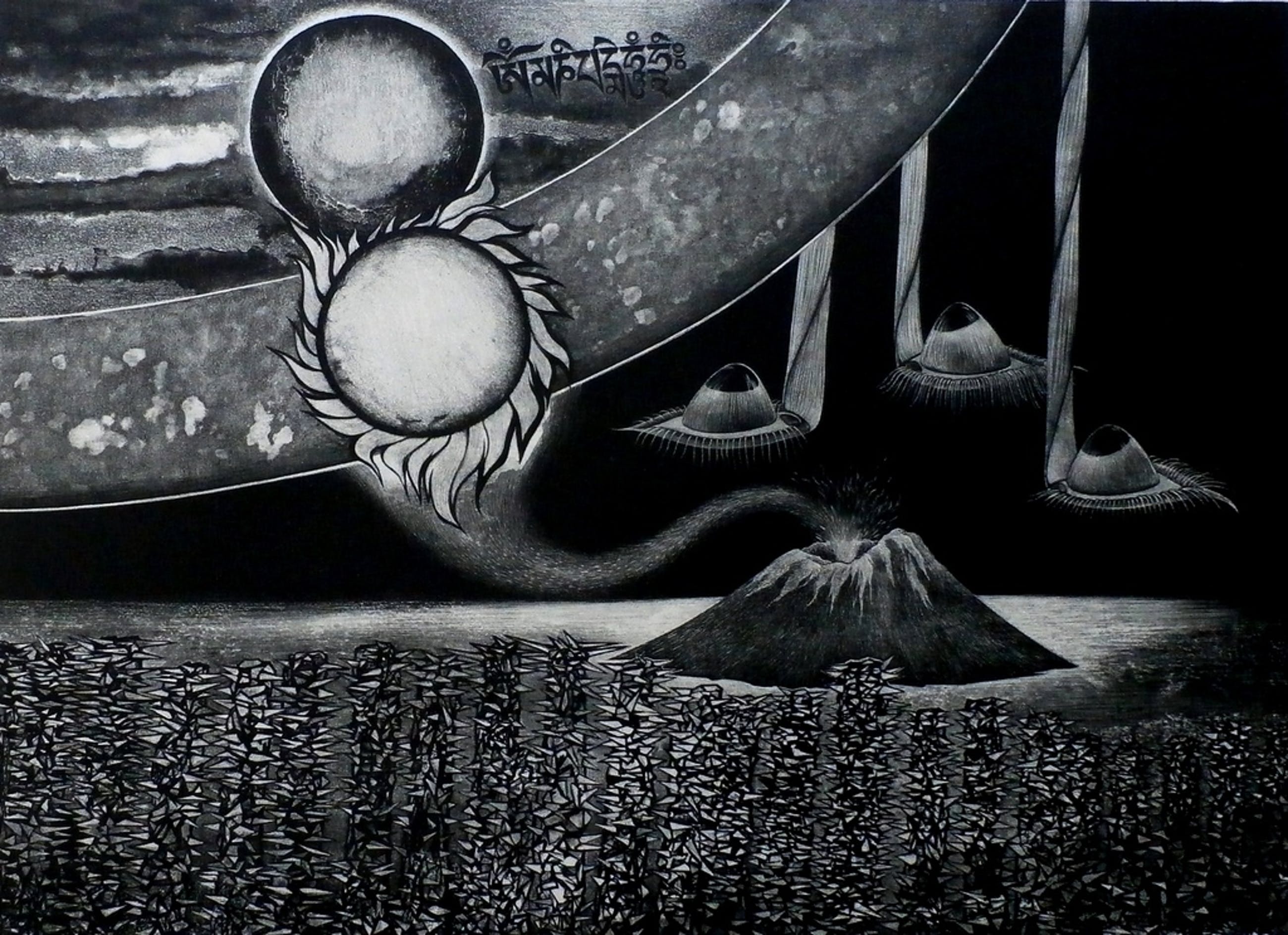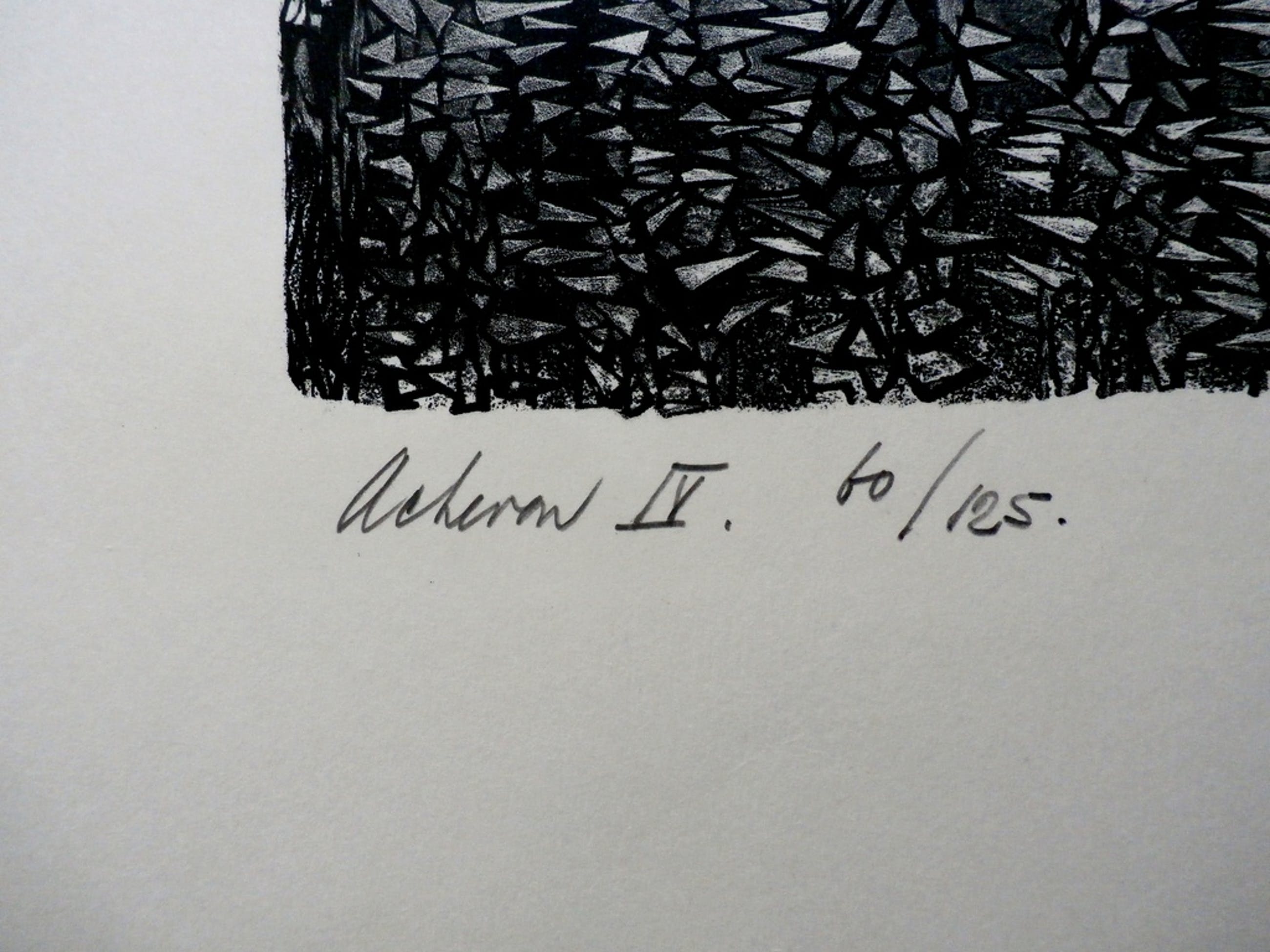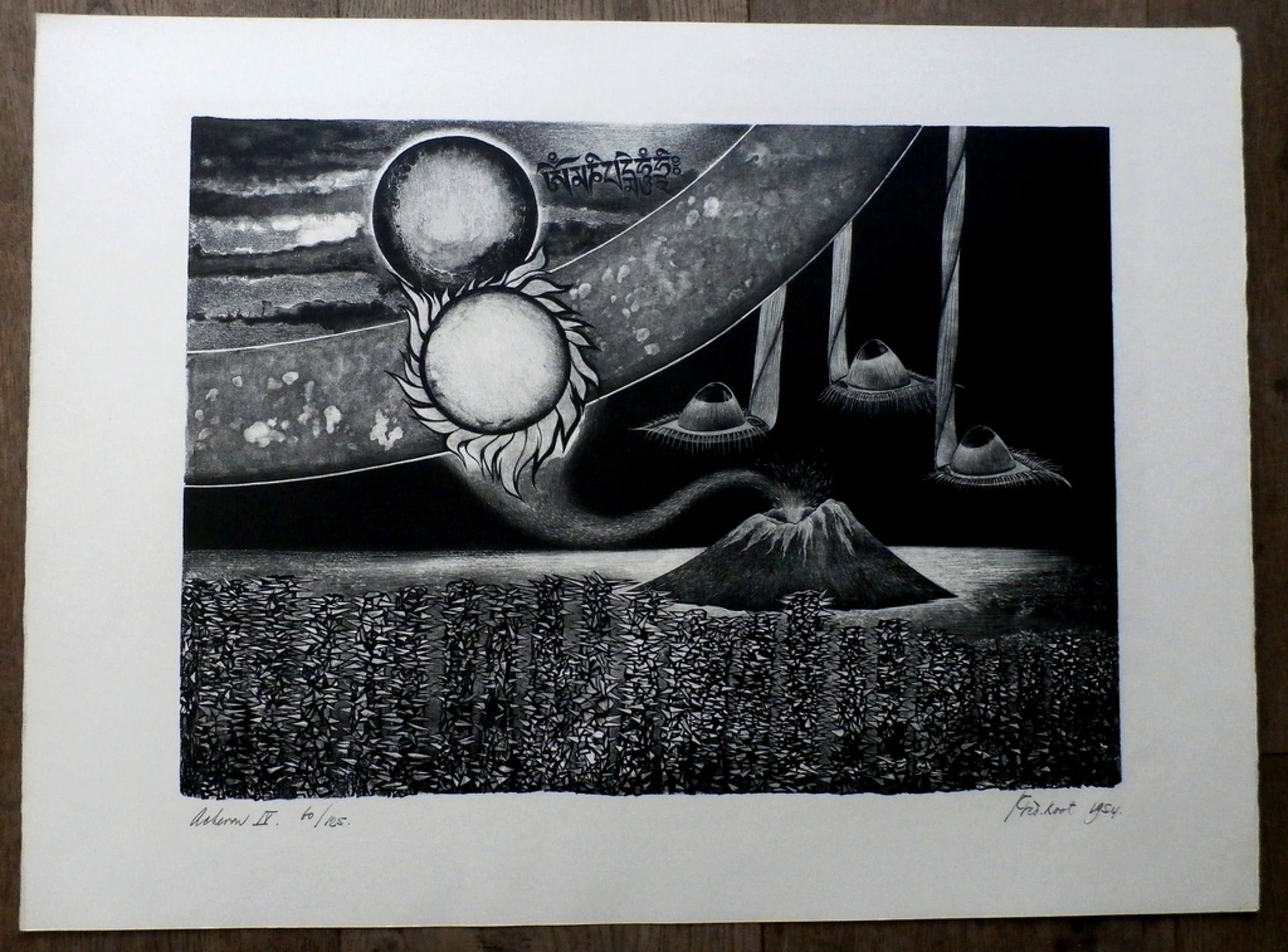 Erg mooie litho van Fred Koot uit de Saturnusreeks. Hoge kwaliteit! Titel: Archeron IV (Surrealistisch landschap). Nummer: 60/125. Jaar: 1954. Afmetingen: H48 x b64 cm.