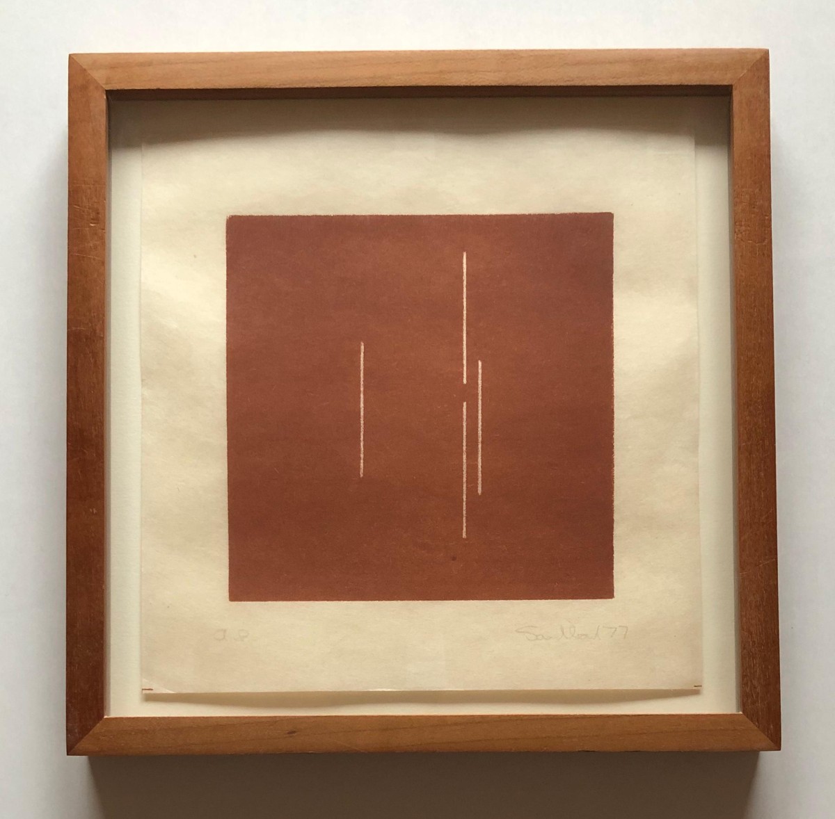 Fred Sandback (1943-2003), Untitled (from an untitled portfolio), Plate #7, 1977, Lithograph on handmade paper with cut edge, Hand-signed, dated and inscribed 'A.P.'; Edition, of 30 + 10AP, 7.5 x 7.5 in / 19,1 x 19,1 cm, Published by Edition Heiner Friedrich, Munich, Germany, Gallery framed