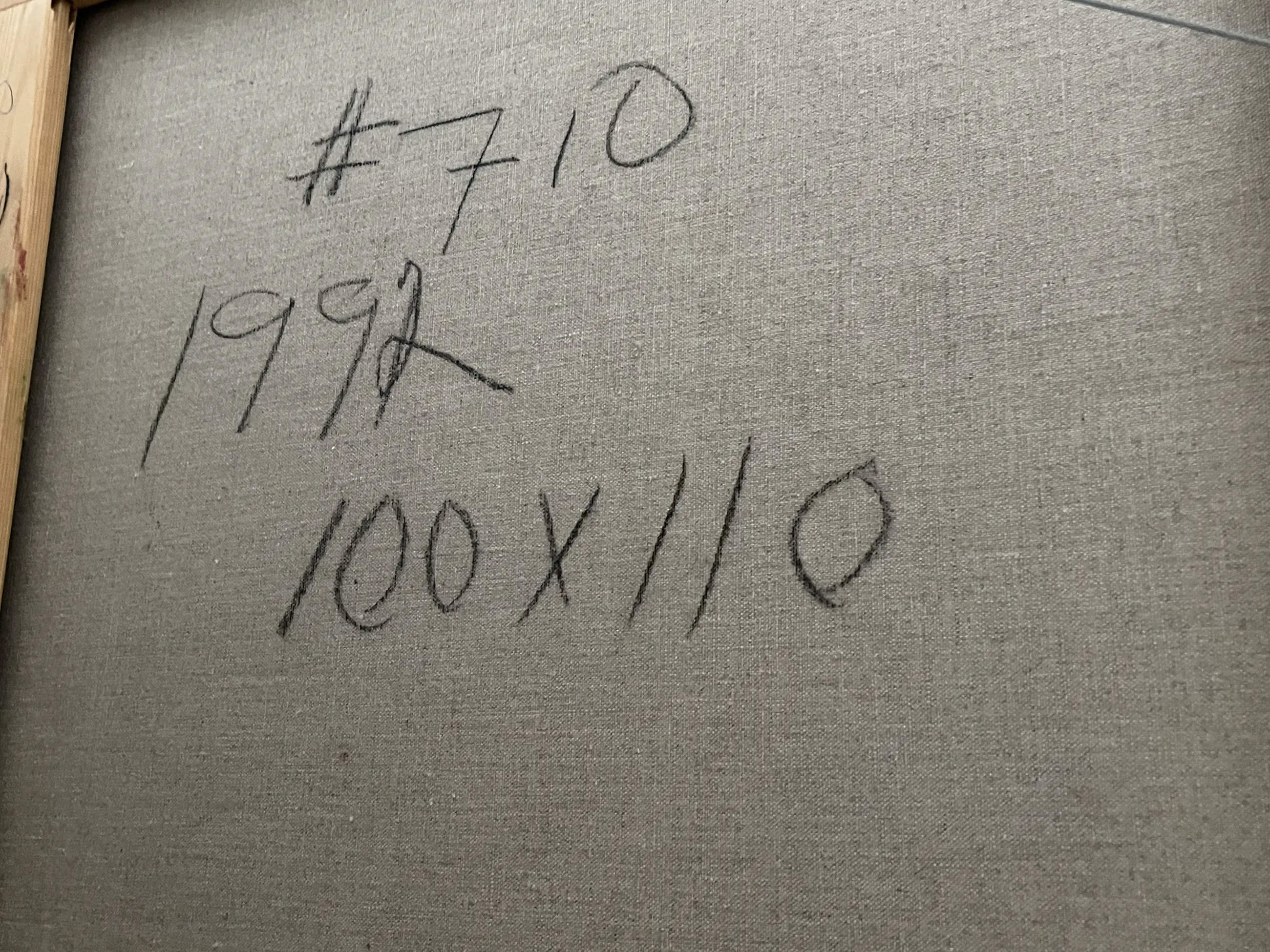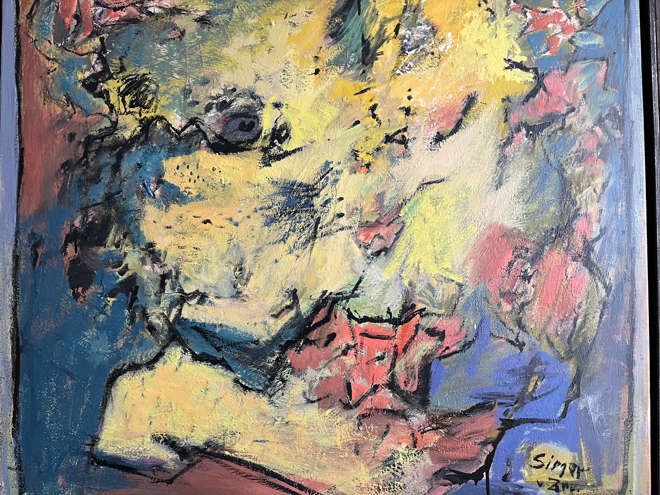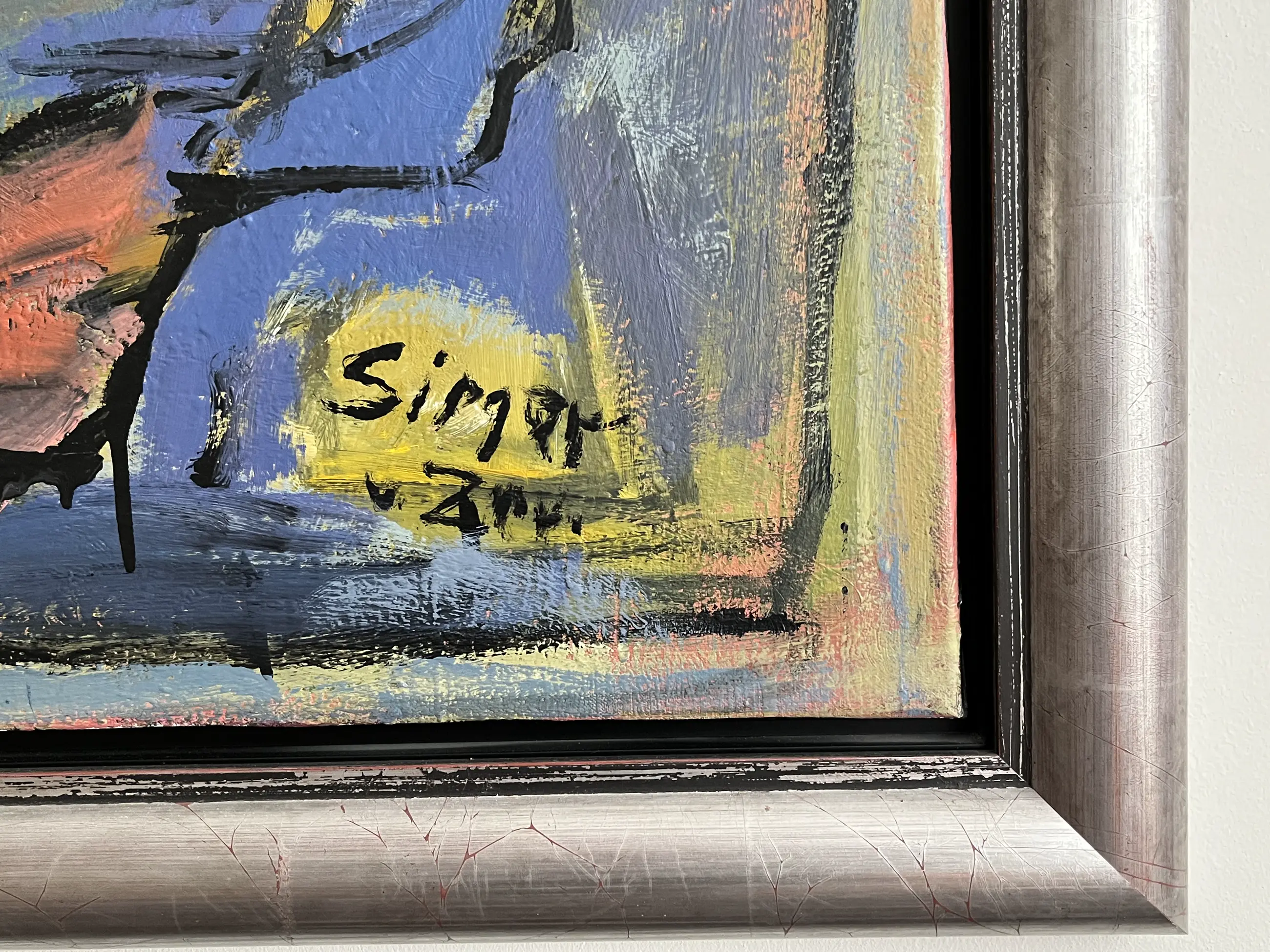 Fraai werk, kan zo aan de muur. Afmeting inclusief zilverkleurige lijst 115 x 125 cm.