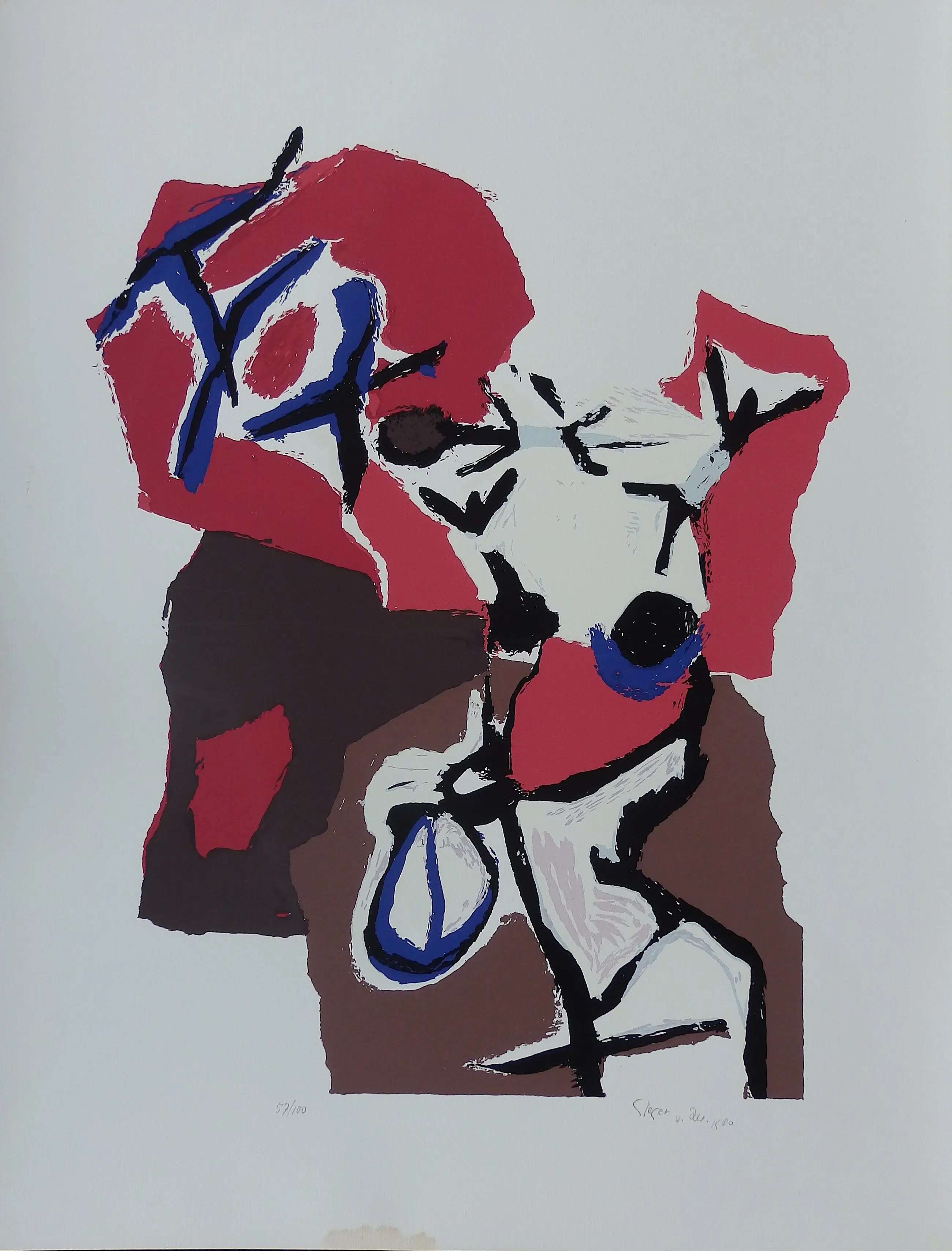 Zeefdruk, met de afmeting: 50 x 65 cm. Gesigneerd en gedateerd 1980 r.o. en genummerd 57/100 l.o.