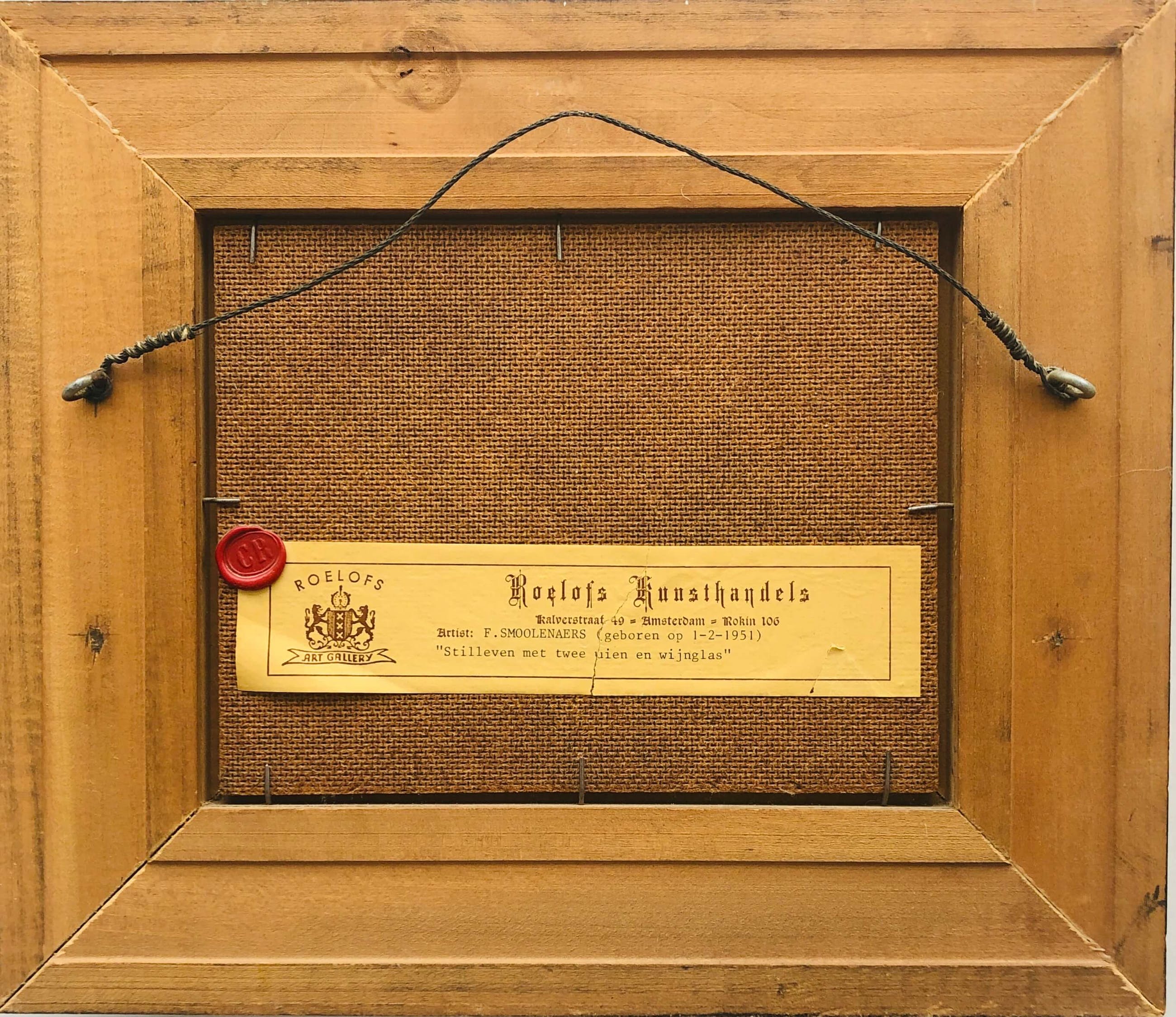 Een prachtig gedetailleerd schilderij van Fred Smoolenaers uit 1980. De twee uien zijn perfect weergegeven en het wijnglas schittert. Destijds in 1980 verkocht door 'Roelofs Kunsthandels Amsterdam' met aan de achterzijde een etiket met een rode zegel van deze kunsthandel waarop ook de titel vermeld staat. Tevens als echtheidscertificaat te zien. Het kleurgebruik is ingetogen waardoor het schilderij een chique uitstraling heeft. Links onder gesigneerd en rechtsonder gedateerd.