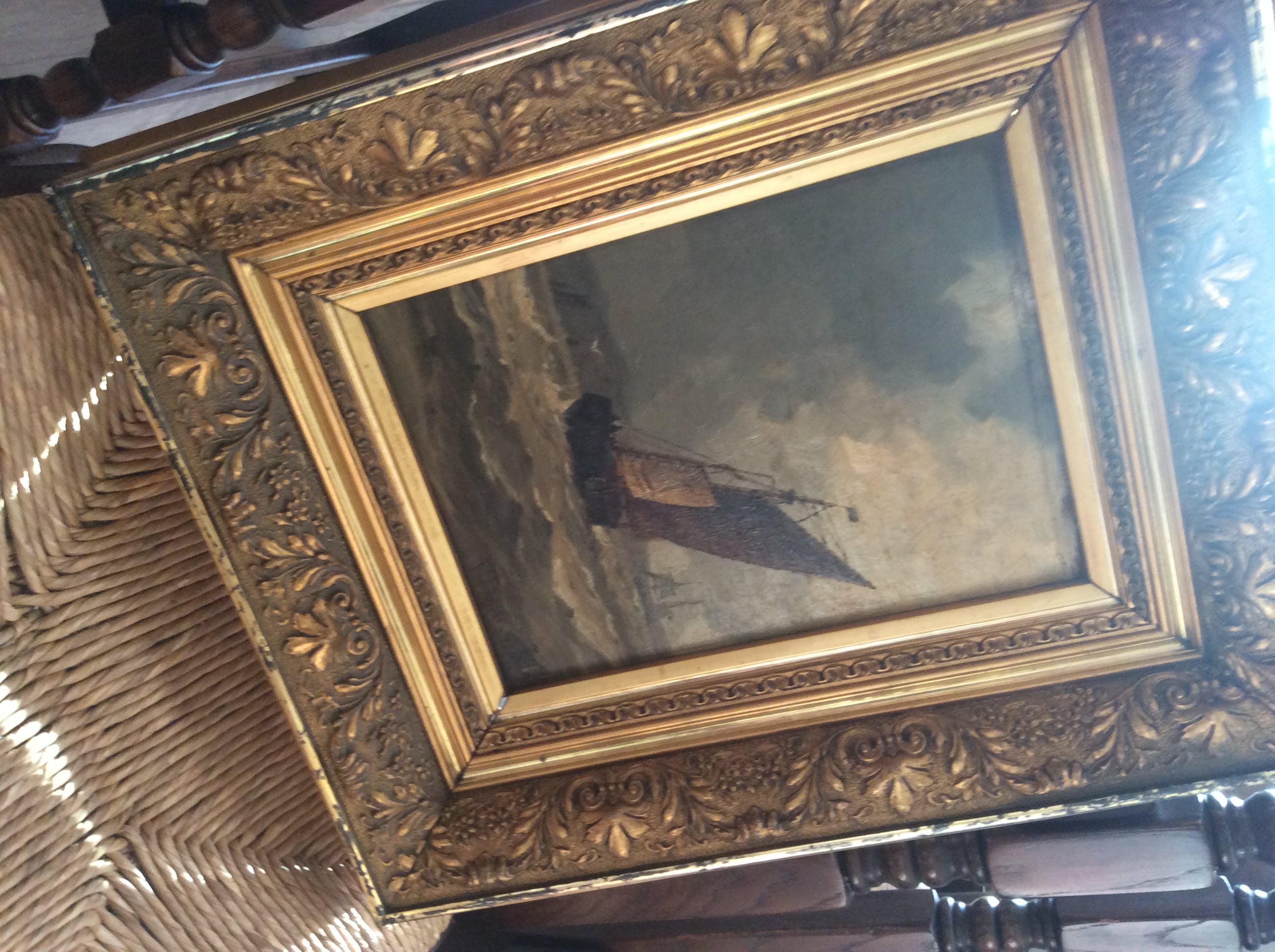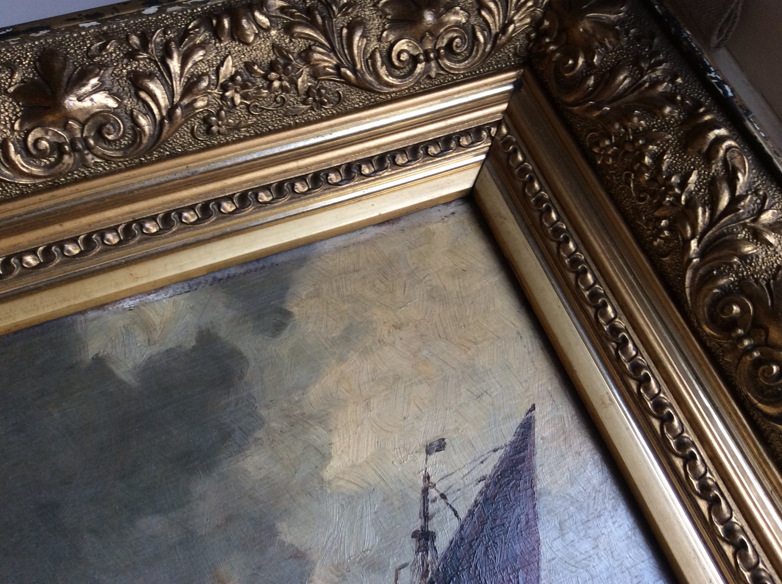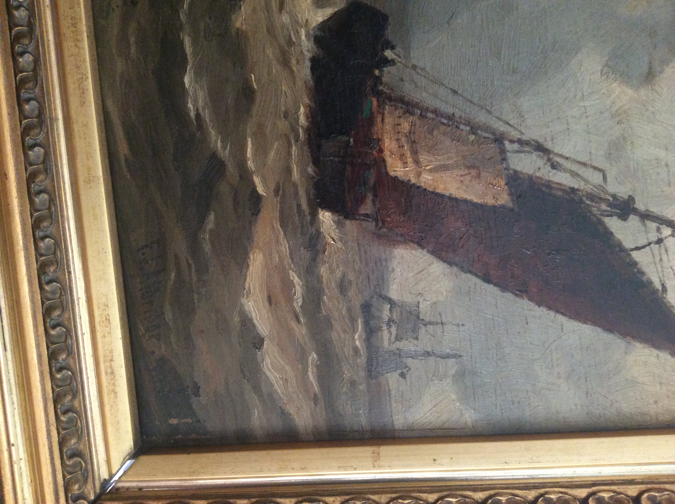 Olieverf-tafereeltje op houten paneel: zeilboot op zee van Frederick James Aldridge, een Brits schilder bekend om zijn zeegezichten en schepen, die leefde en werkte in Worthing en daar ook een galerie had (1850-1933). Drie van zijn werken zijn tentoongesteld door de Royal Academy.