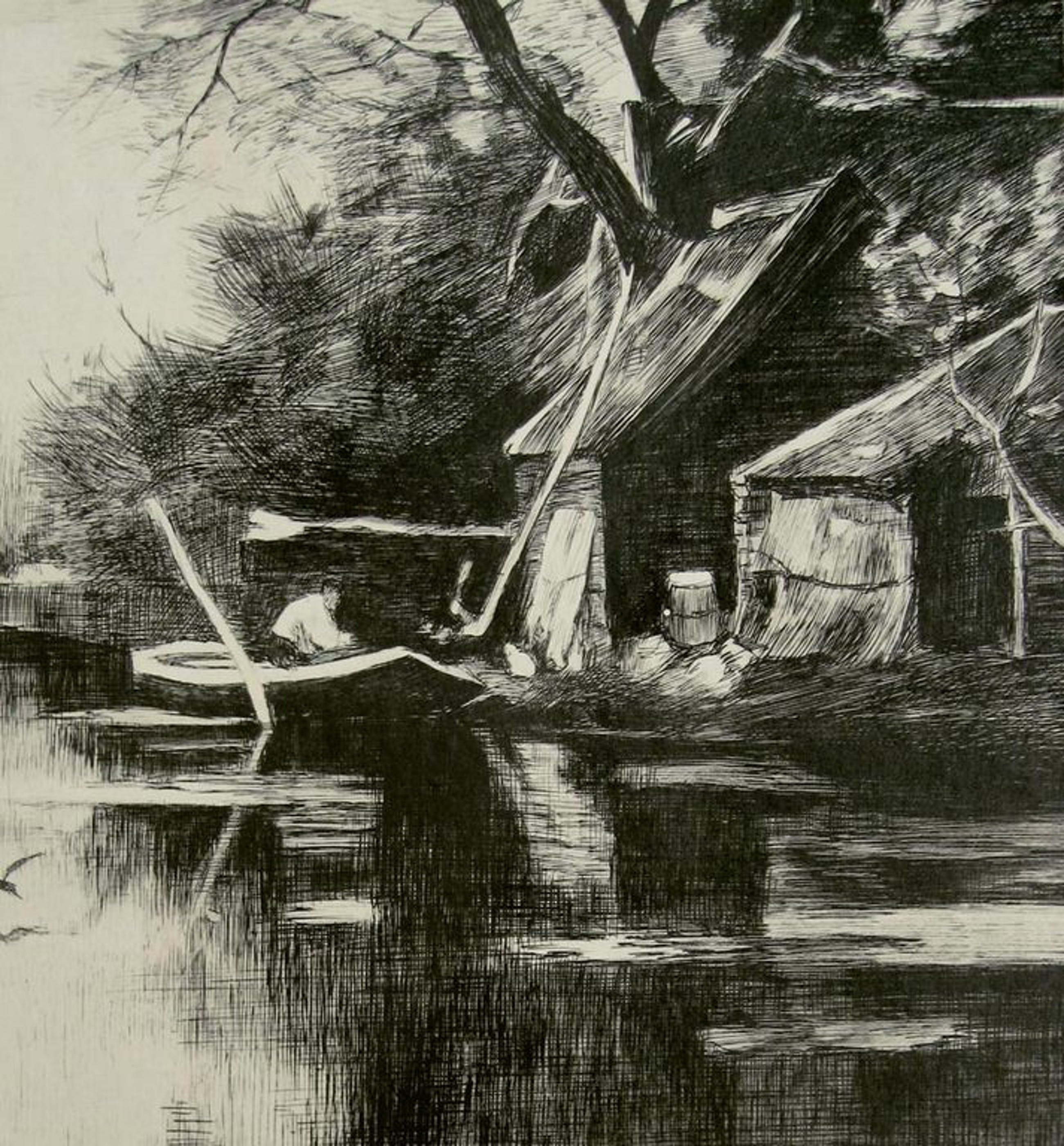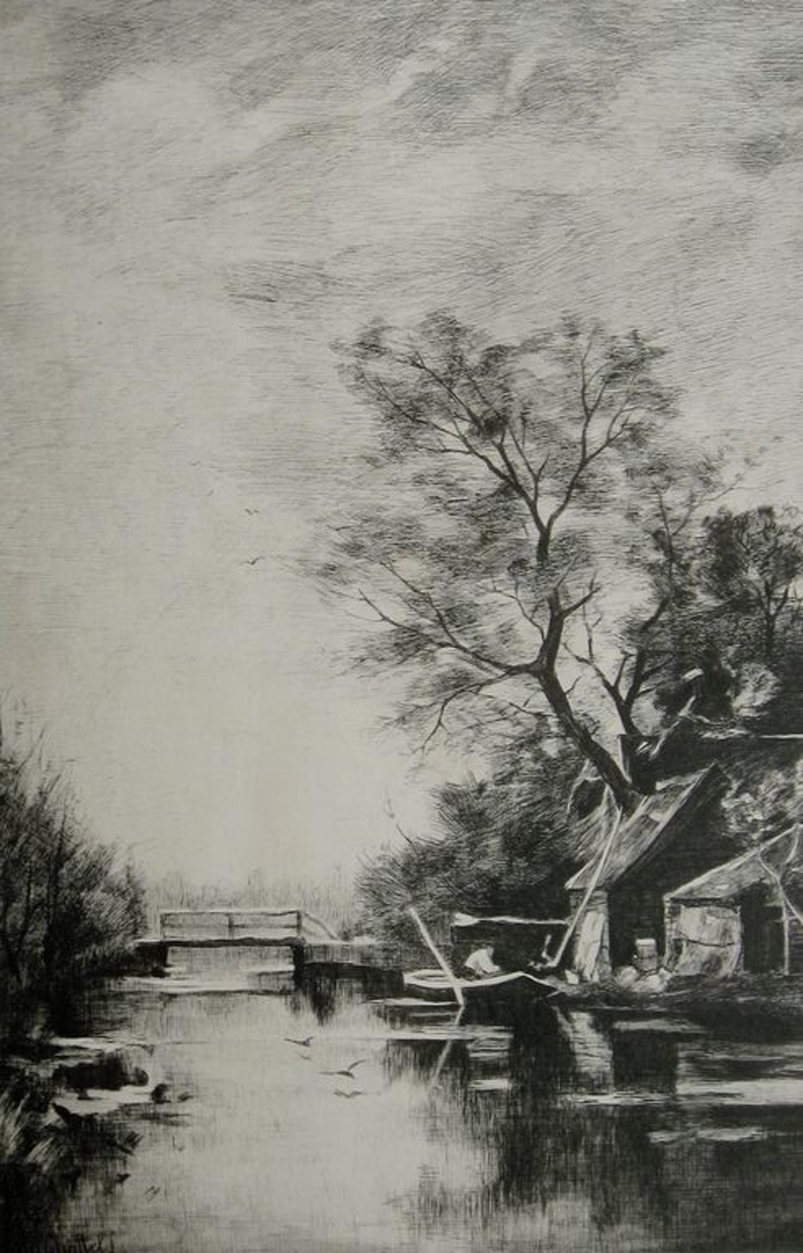 IN HET LAAGLAND - Grote gravure naar Du Chattel's bekende landschappen aan de Vecht. Gelijmd op karton, zoals begin 20e eeuw vaker gebeurde bij grafiek. Gesigneerd in de druk linksonder en r.o. door de graveur. Afm. blad: 36 x 58 cm, beeldgrootte: 33 x 55 cm. Verzending NL 10 euro, Belgie 15 euro.