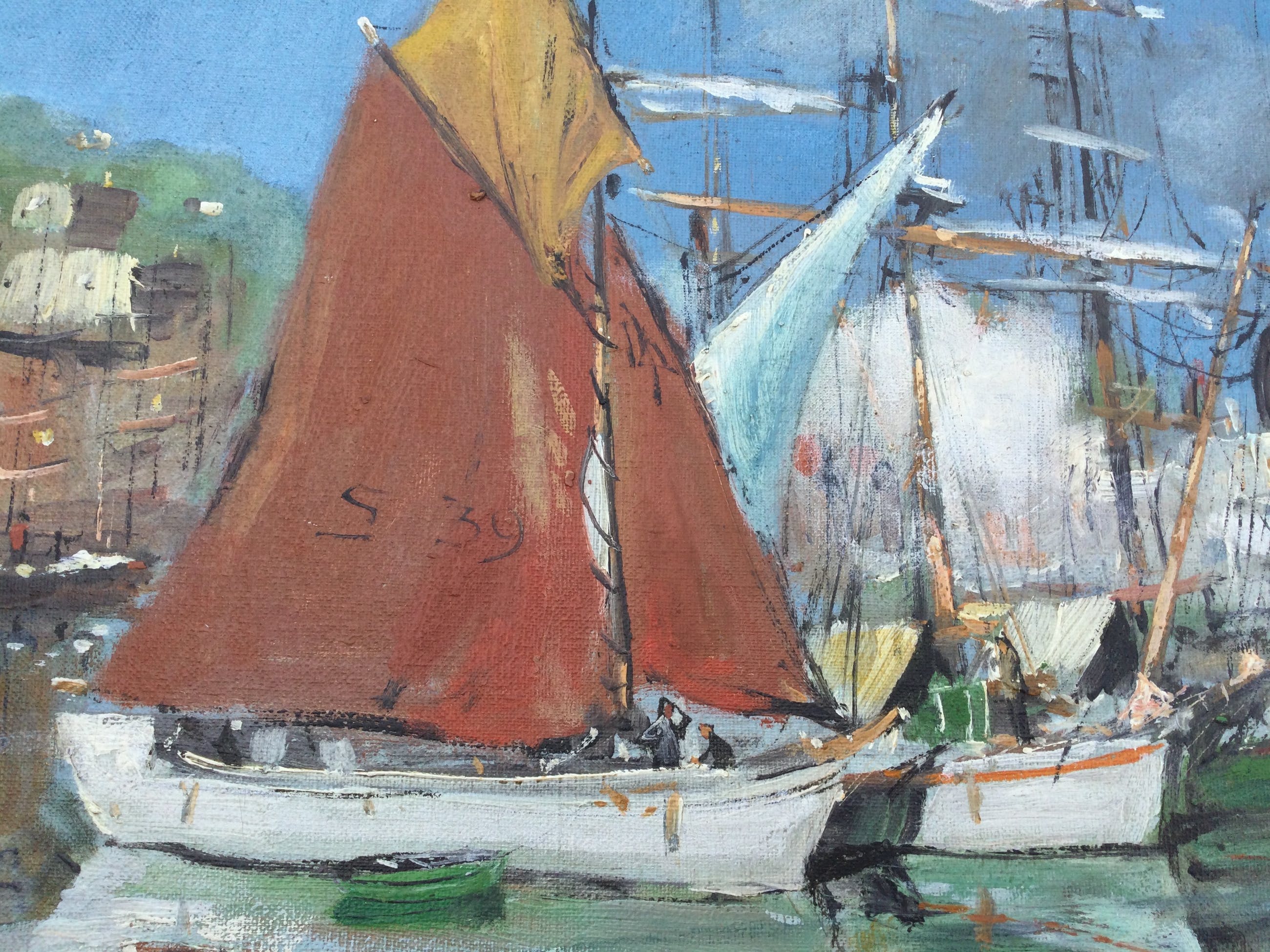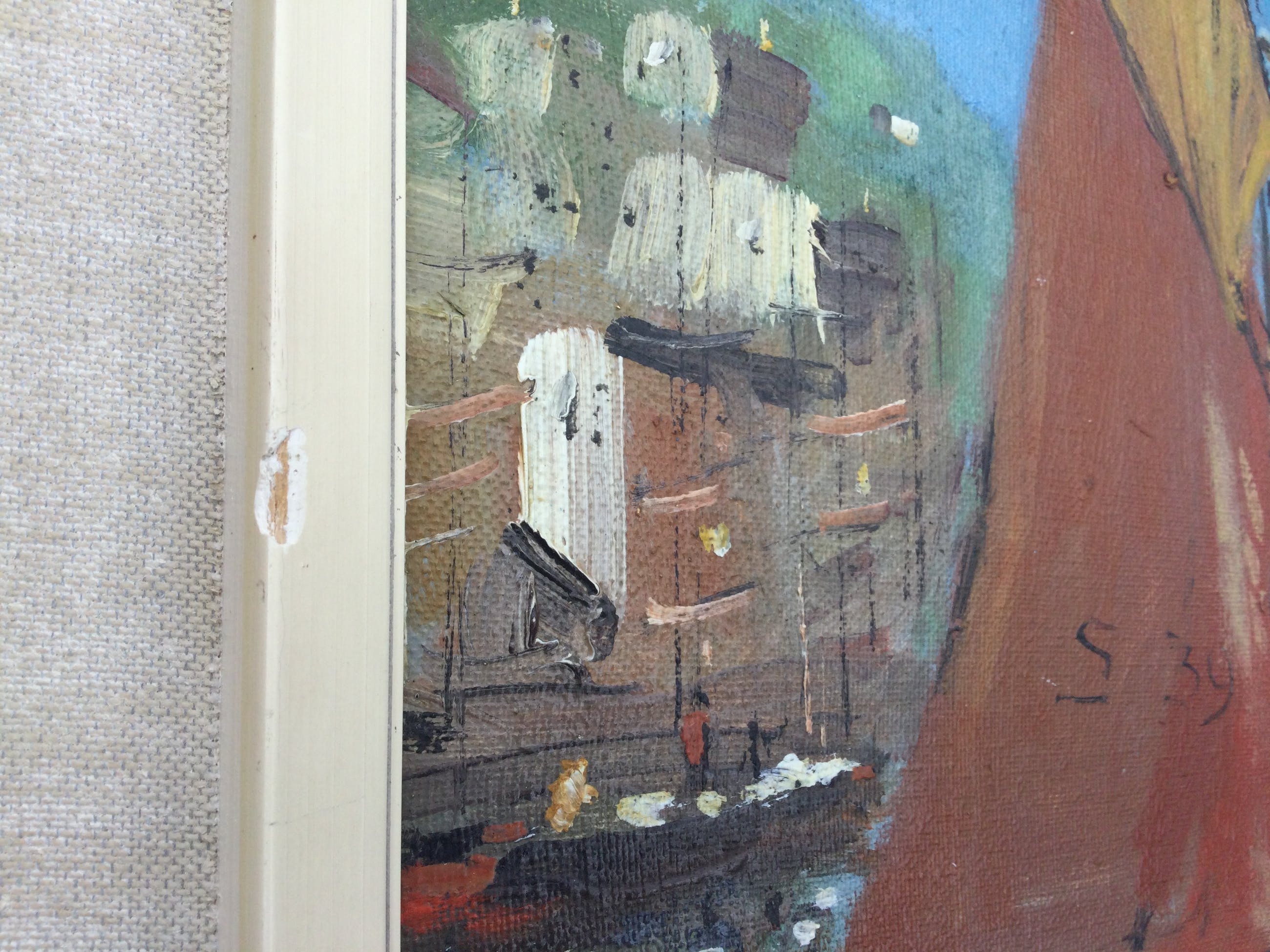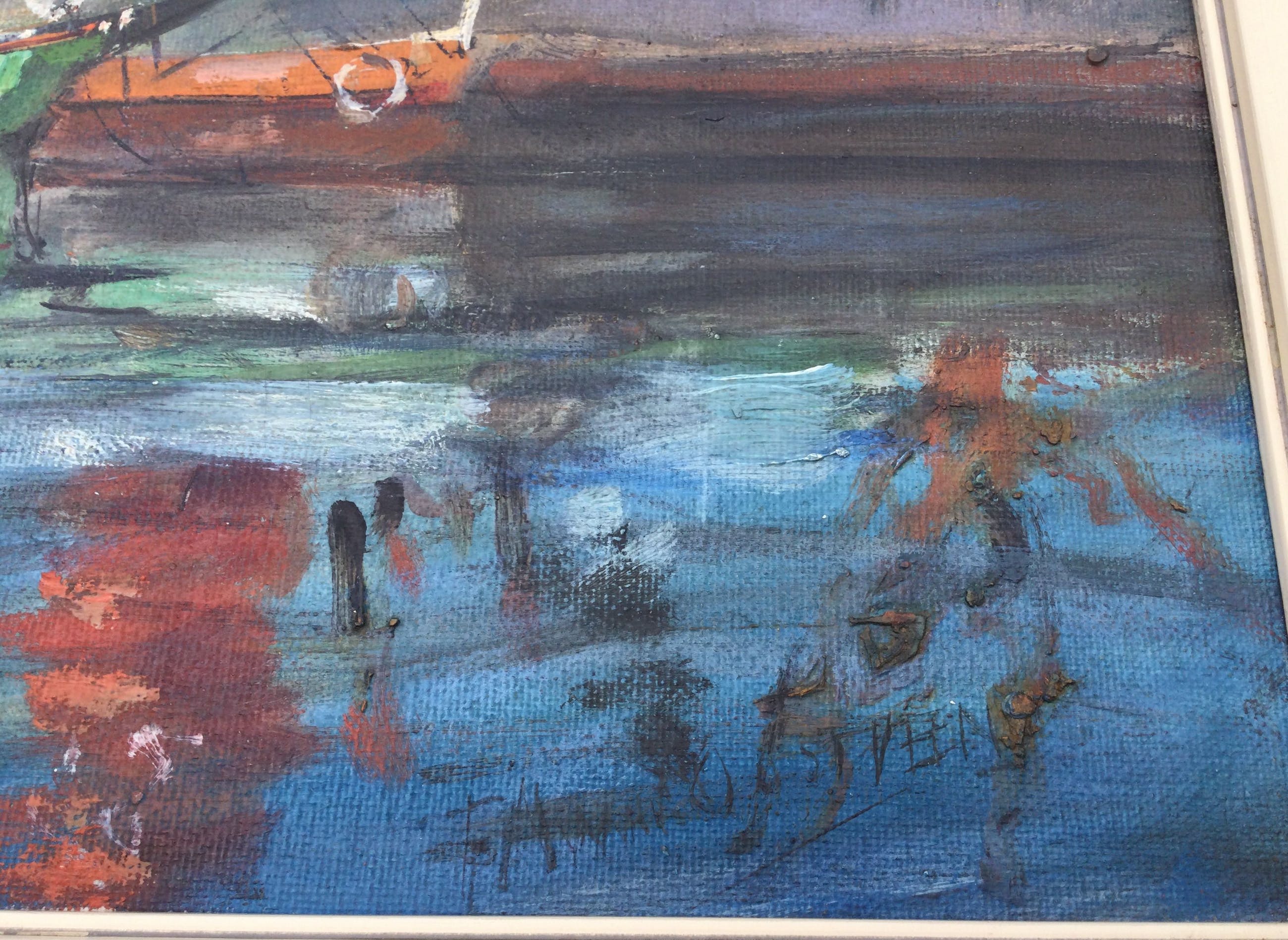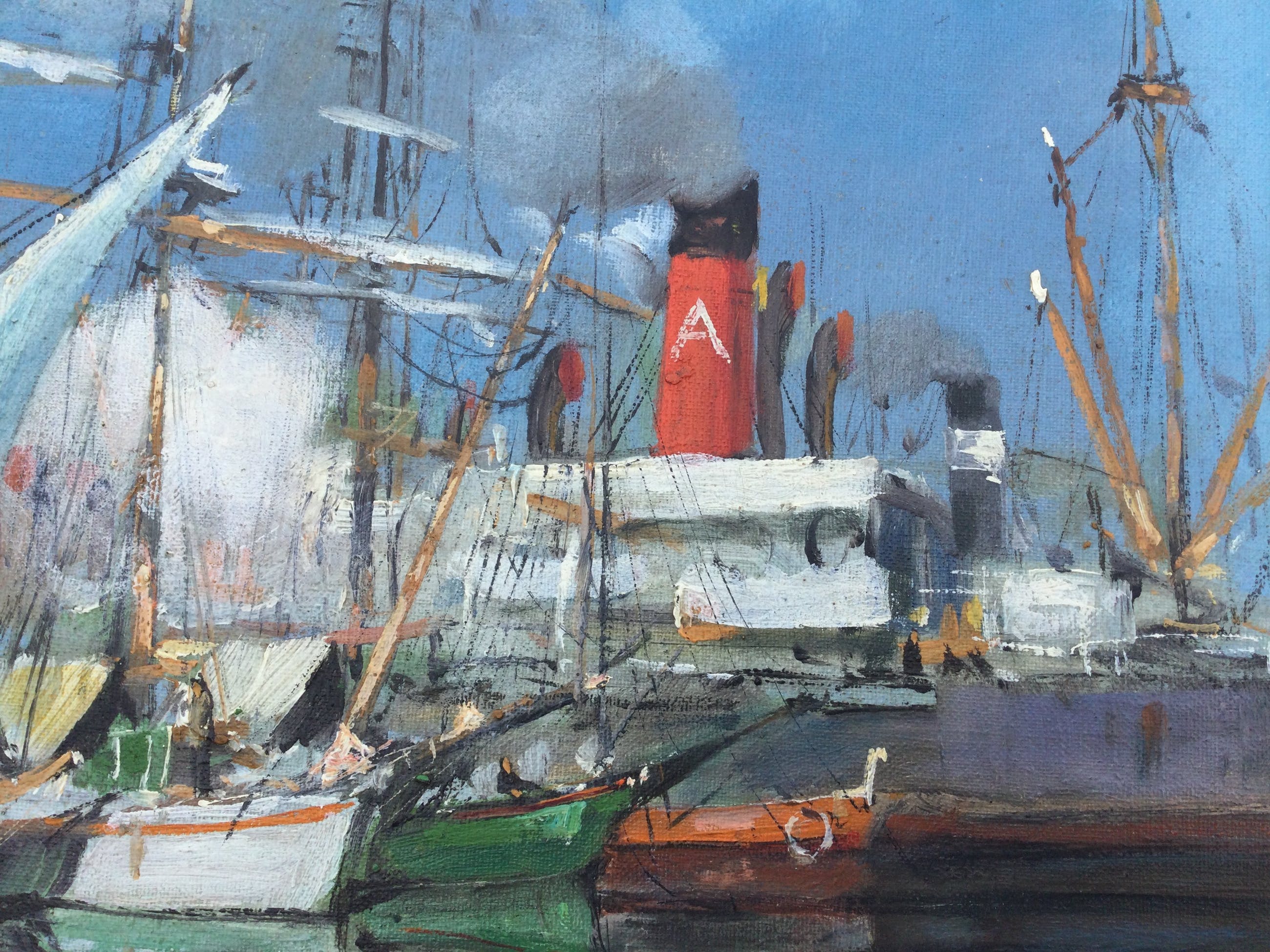 Dit bijzonder fraaie schilderij van F.A. Van Oostveen (1885-1979) is ongedateerd. Maar gezien de lijst en het haven tafereel lijkt het aannemelijk dat dit werk is gemaakt in de periode 1920-1950.