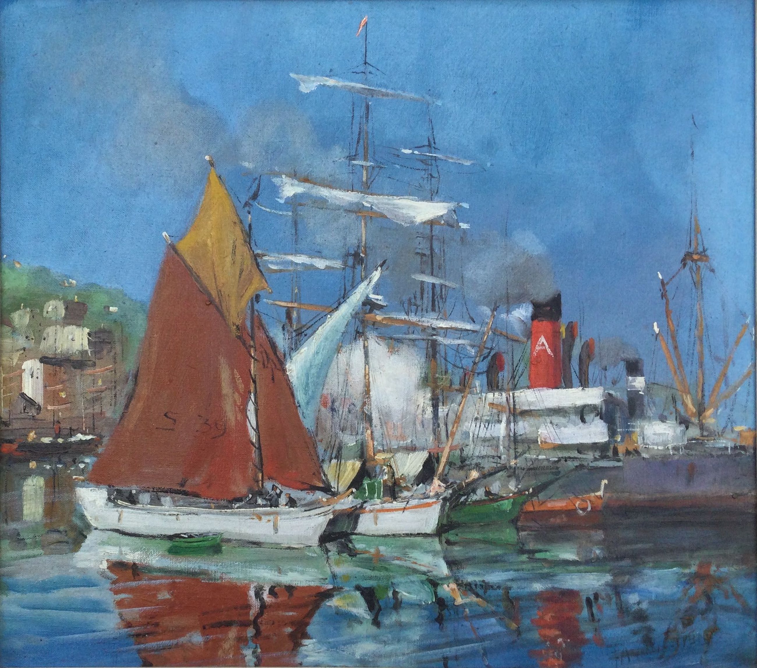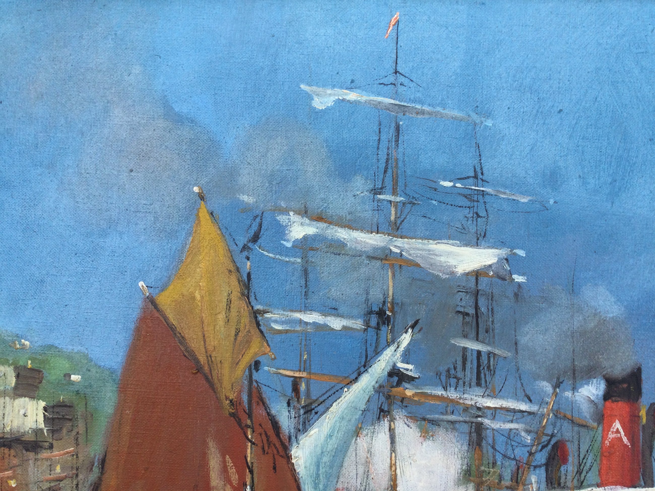 Hoewel bekend van zijn Rotterdamse havengezichten, geeft dit havenbeeld de indruk gemaakt te zijn in Denemarken. Een zeilschip (midden) lijkt de Deense vlag te voeren; de lettercodes op het zeil op de voorgrond en het stoomschip kunnen op Skagen, respectievelijk Aalborg duiden.