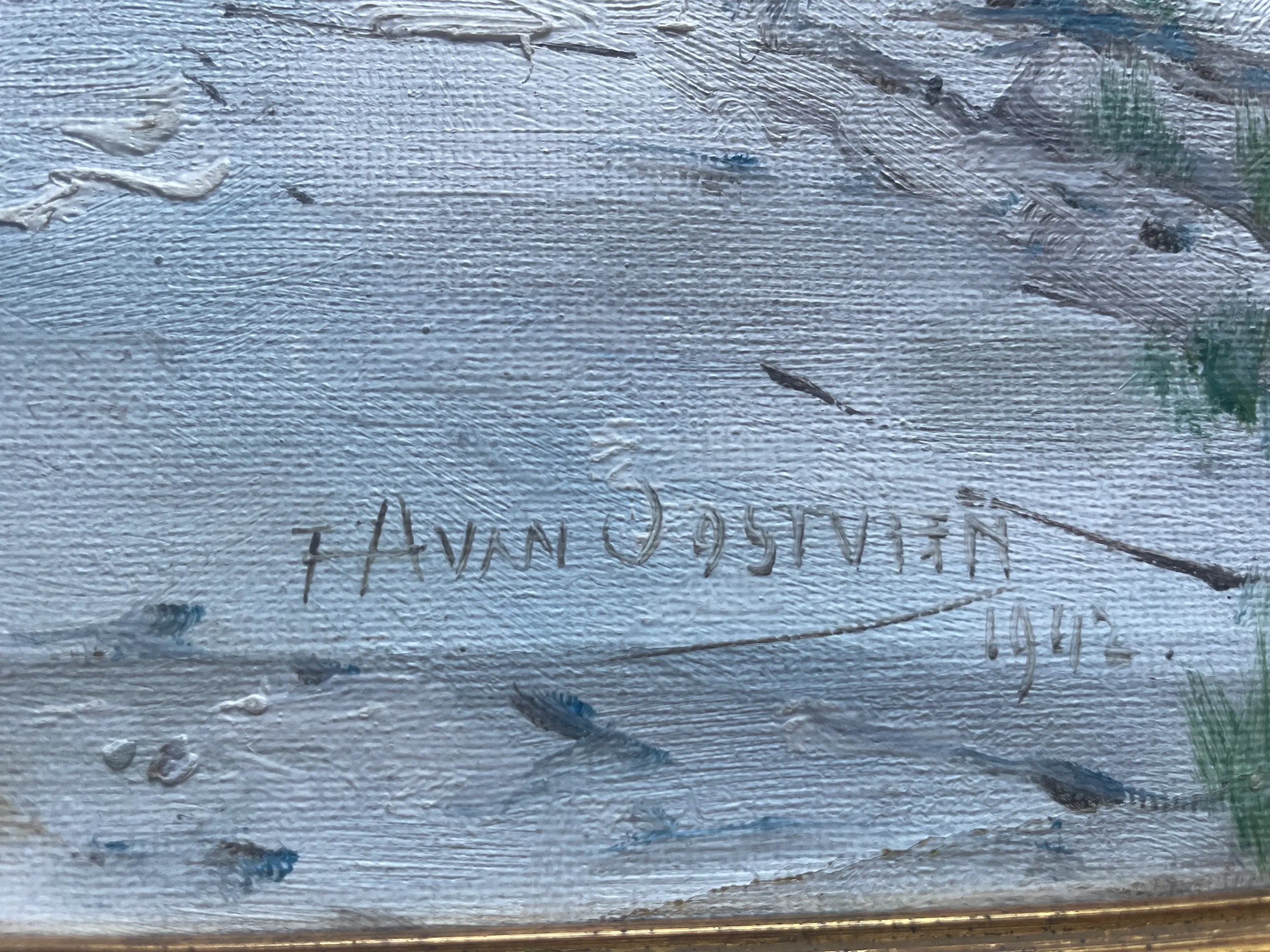 Sfeervol winterlandschap van de Nederlandse schilder Frederik Amalius van Oostveen (1885–1979). Het werk toont een besneeuwd dorpsgezicht met boerderijen, kale bomen en een zachte winterzon aan de horizon. De losse penseelvoering en het subtiele kleurgebruik zorgen voor een kalme en verstilde sfeer. Van Oostveen schilderde in een realistische stijl met lichte impressionistische invloeden, en had een voorliefde voor traditionele Hollandse taferelen.