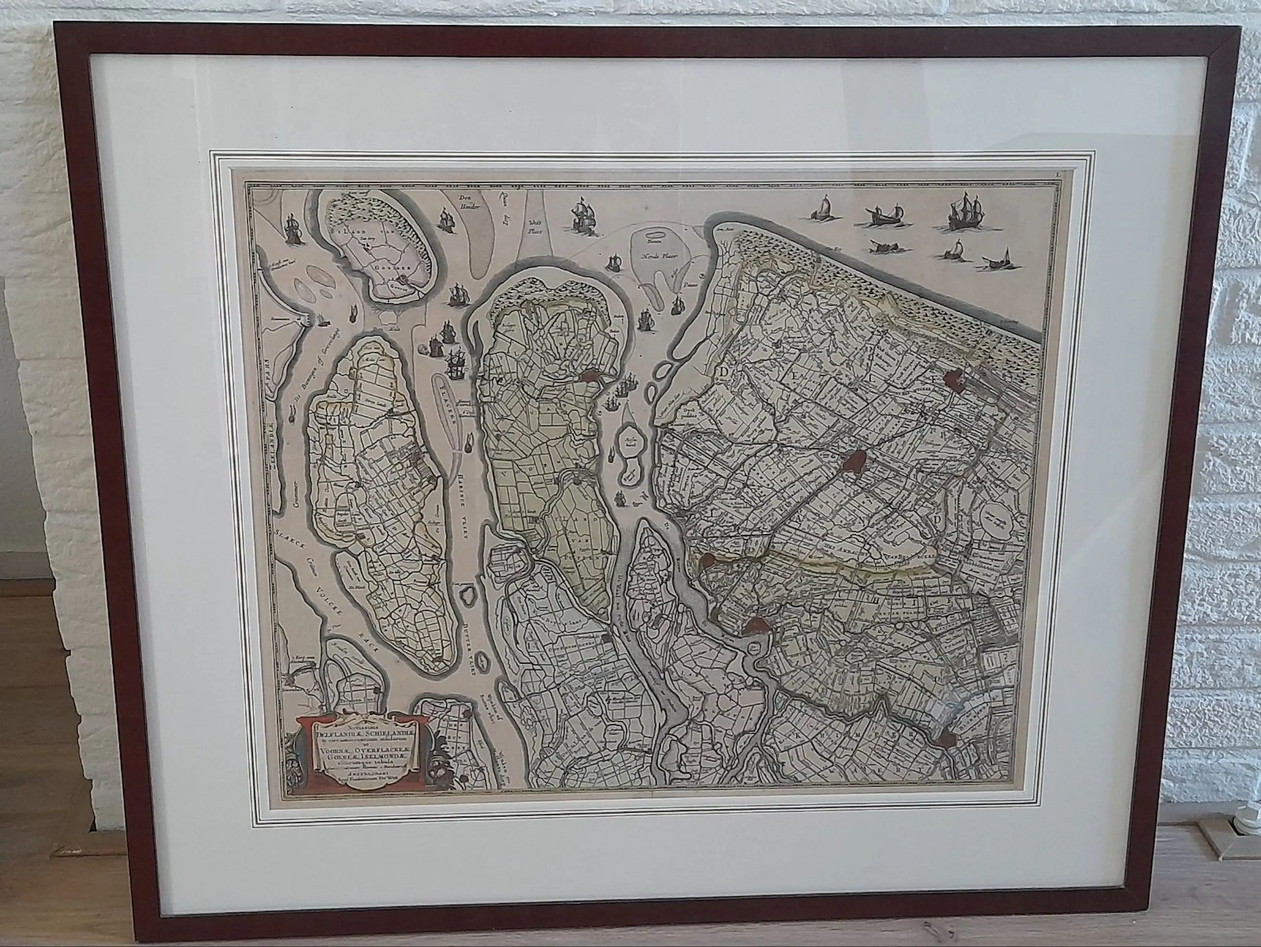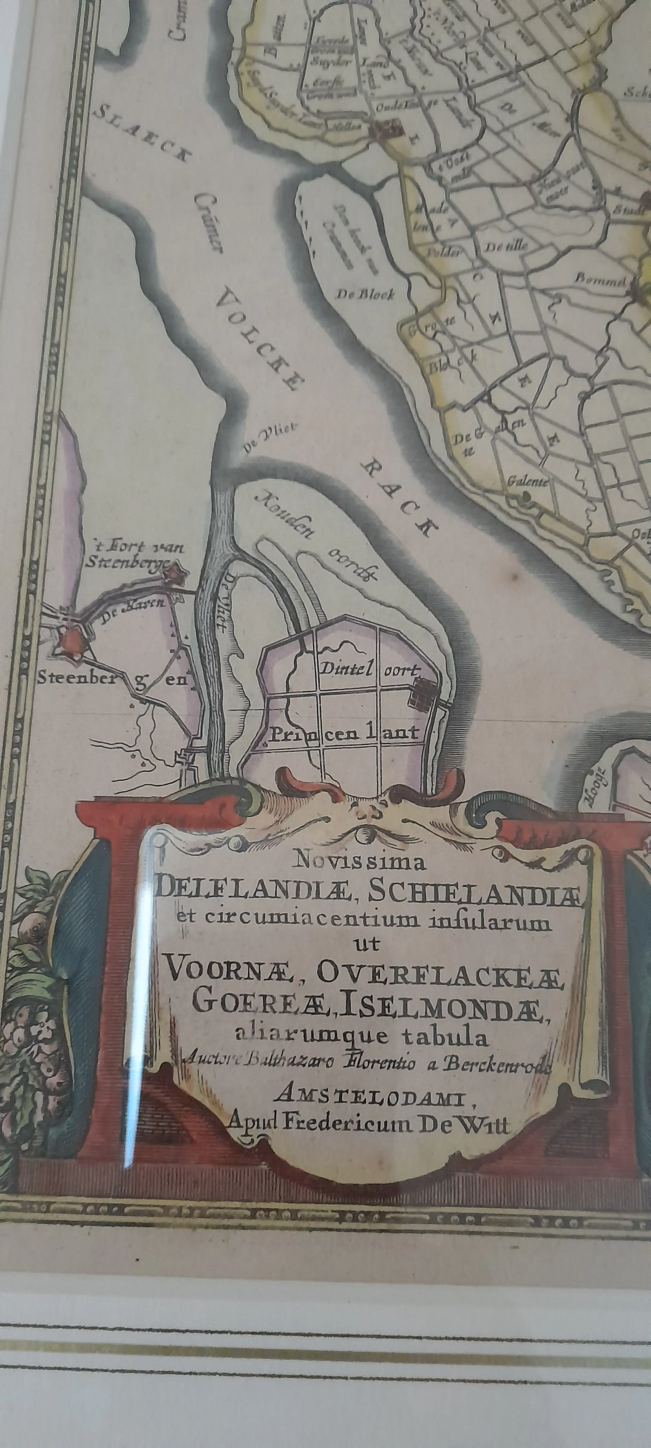 Originele ingelijste historische kaart van Delfland, Schieland en de Zuid-Hollandse eilanden. Novissima Delflandiae, Schielandiae et circumiacentium insularum ut Voornae, Overflackeae Goereae, Iselmondae, etc.