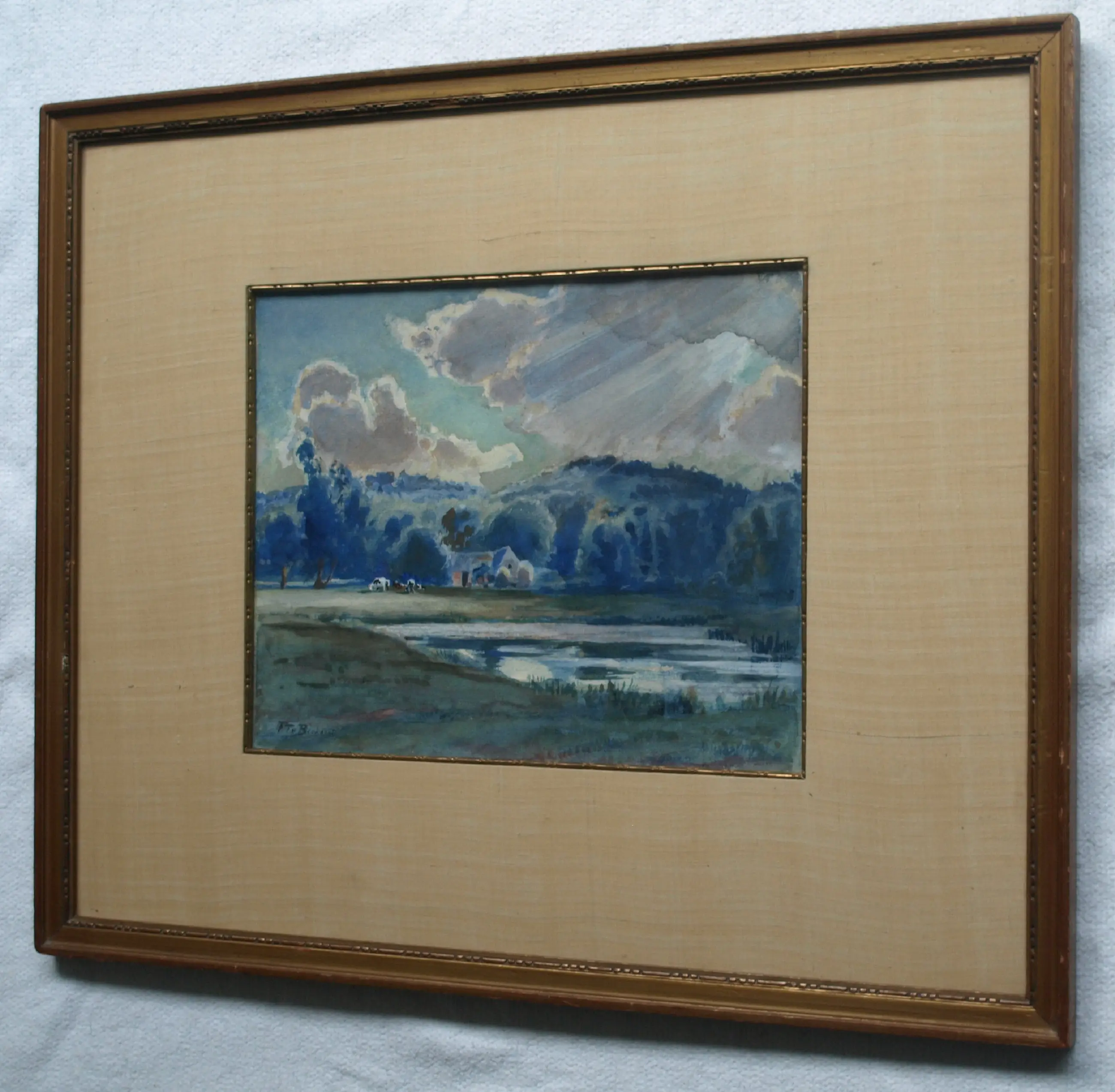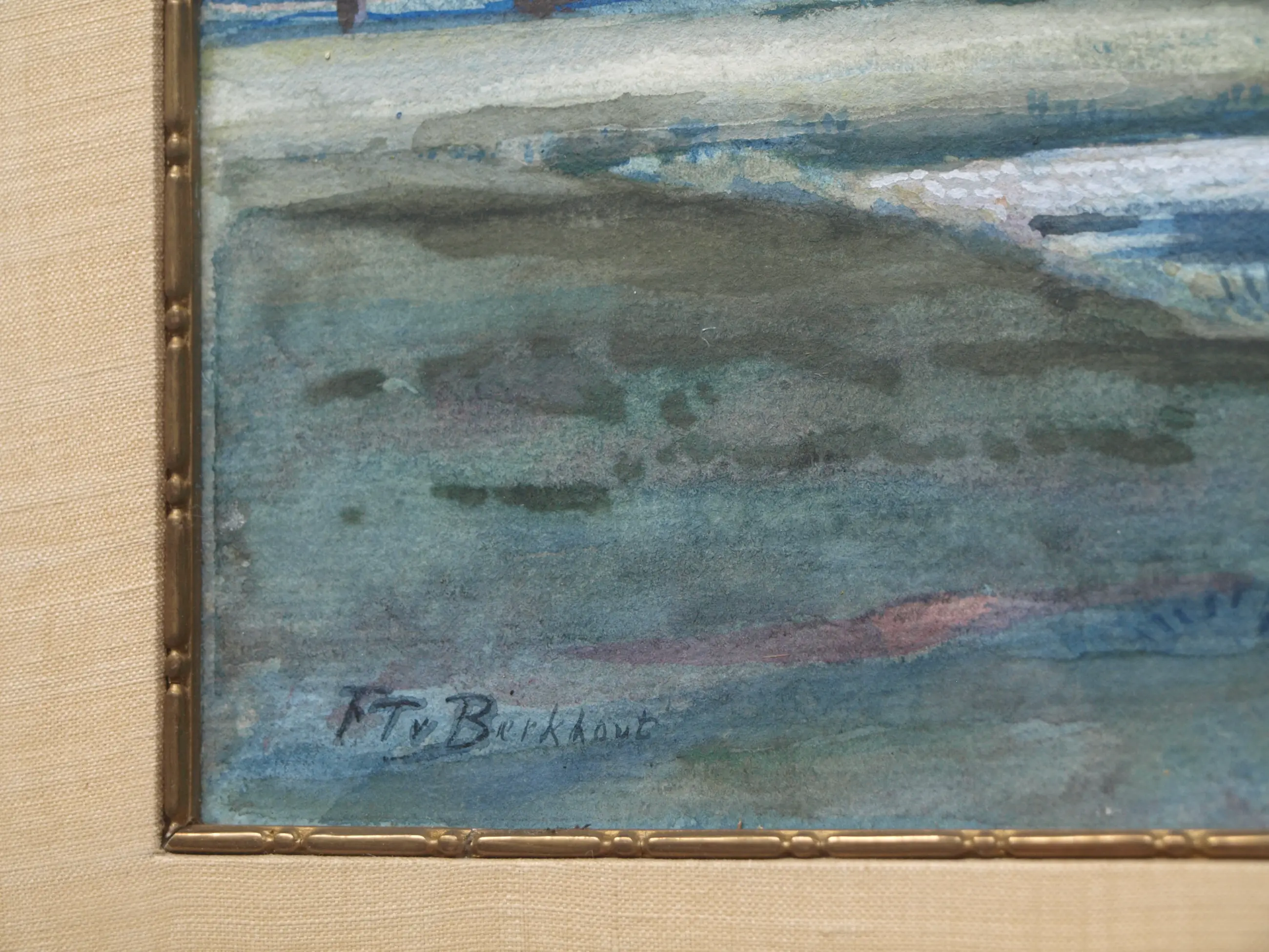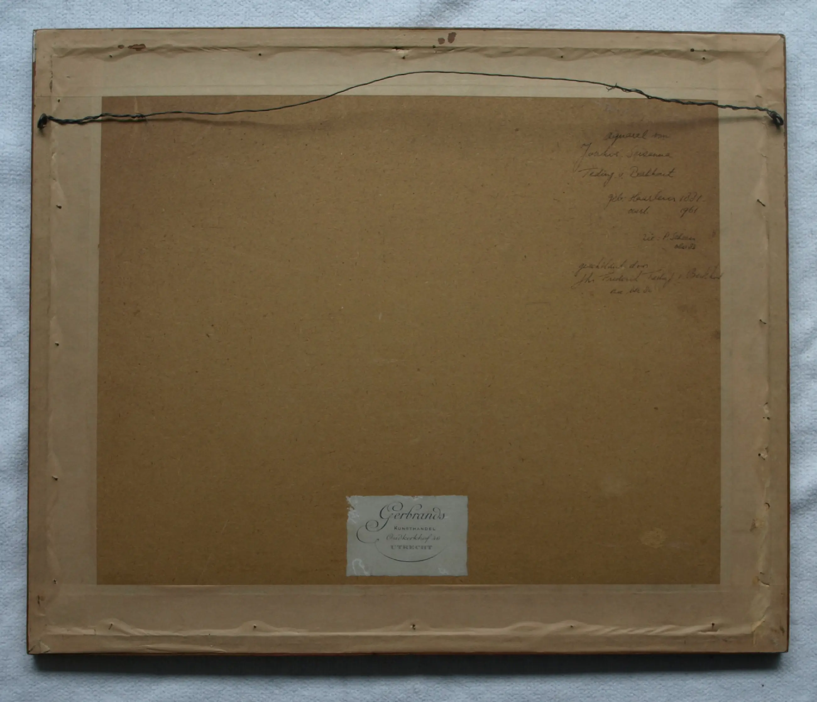 Een aquarel van de “schilderende bankdirecteur” Jonkheer Frederik Teding van Berkhout (1883-1965). -Gesigneerd linksonder. -Ingelijst in de originele houten lijst met passe-partout en glasplaat. -Afmetingen: Lijst, 44½ x 54 x 1½ cm. Beeld, 23 x 29 cm. -Herkomst: Uit een inboedel. Op de achterkant van de lijst staat geschreven dat de aquarel in het bezit was van de kunstenares Jonkvrouw Susanna Teding van Berkhout (1881-1961); zie de laatste foto. -Conditie: De aquarel is in zeer goede staat. De houten lijst heeft slijtplekjes. Zie ook de foto’s. Kan zo aan de muur.