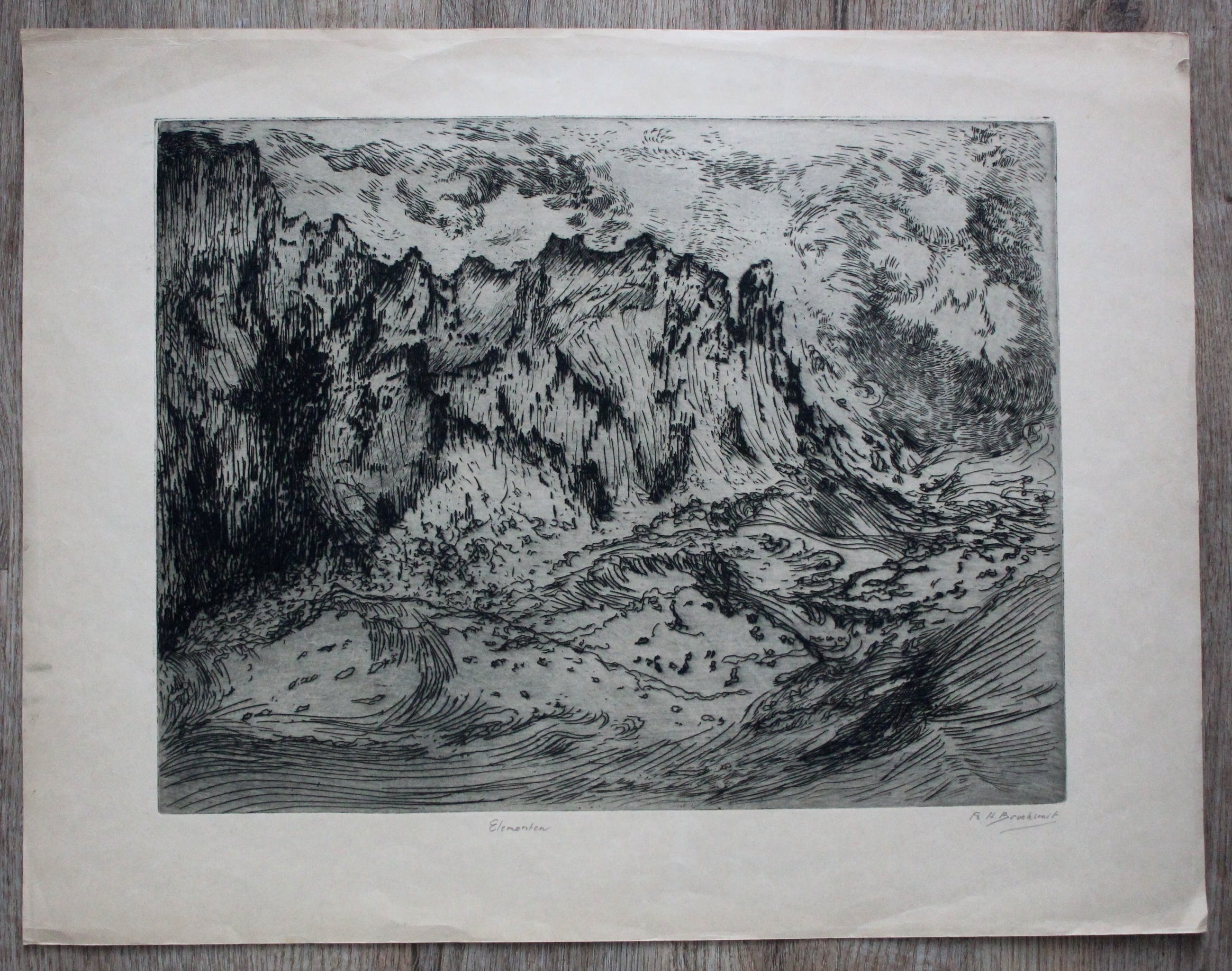 De voorstelling is in goede staat. Op de randen zitten wat kreukels en vlekjes. Goed ingelijst, valt dit onder de passepartout. | |||||||||||