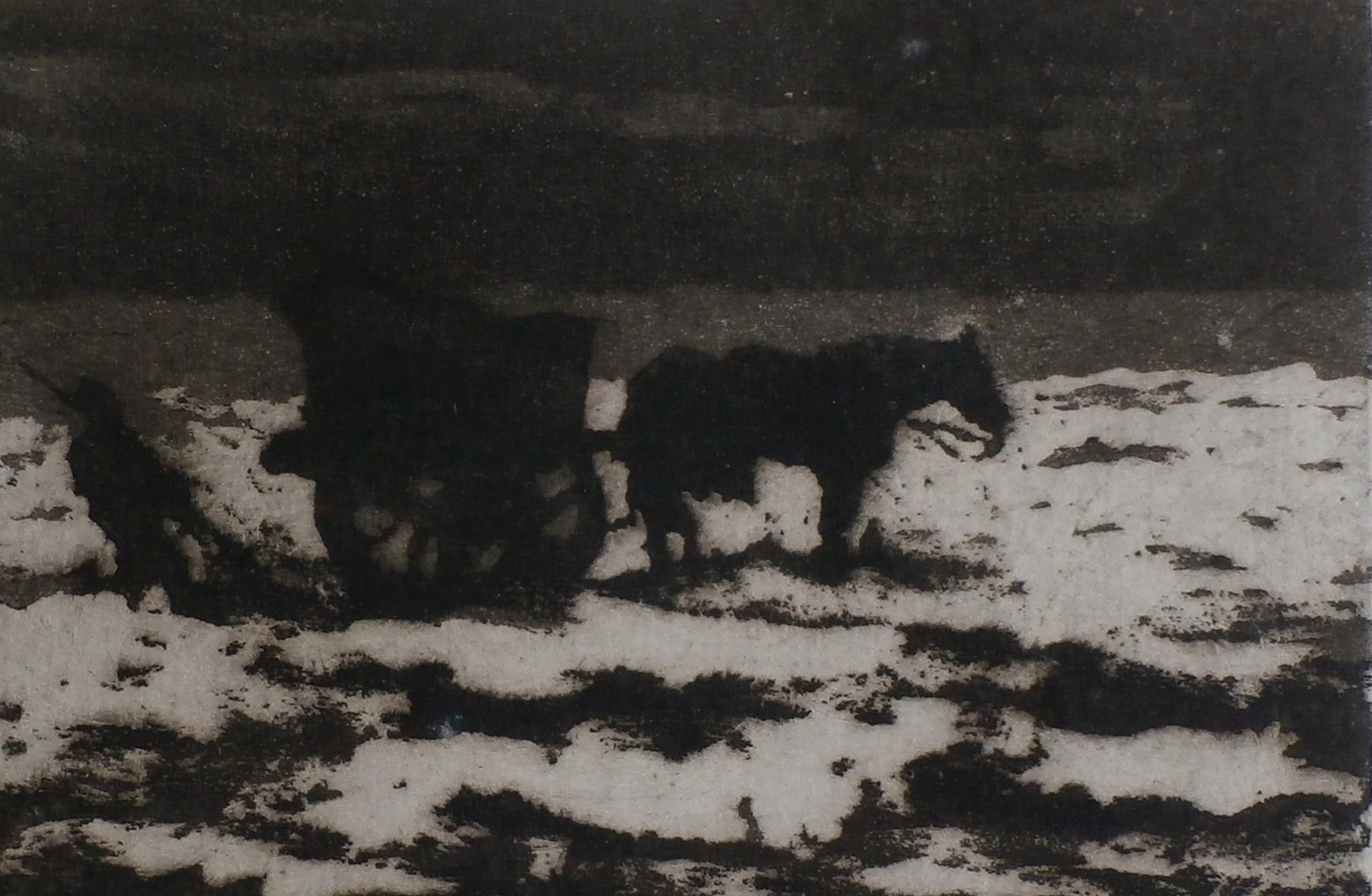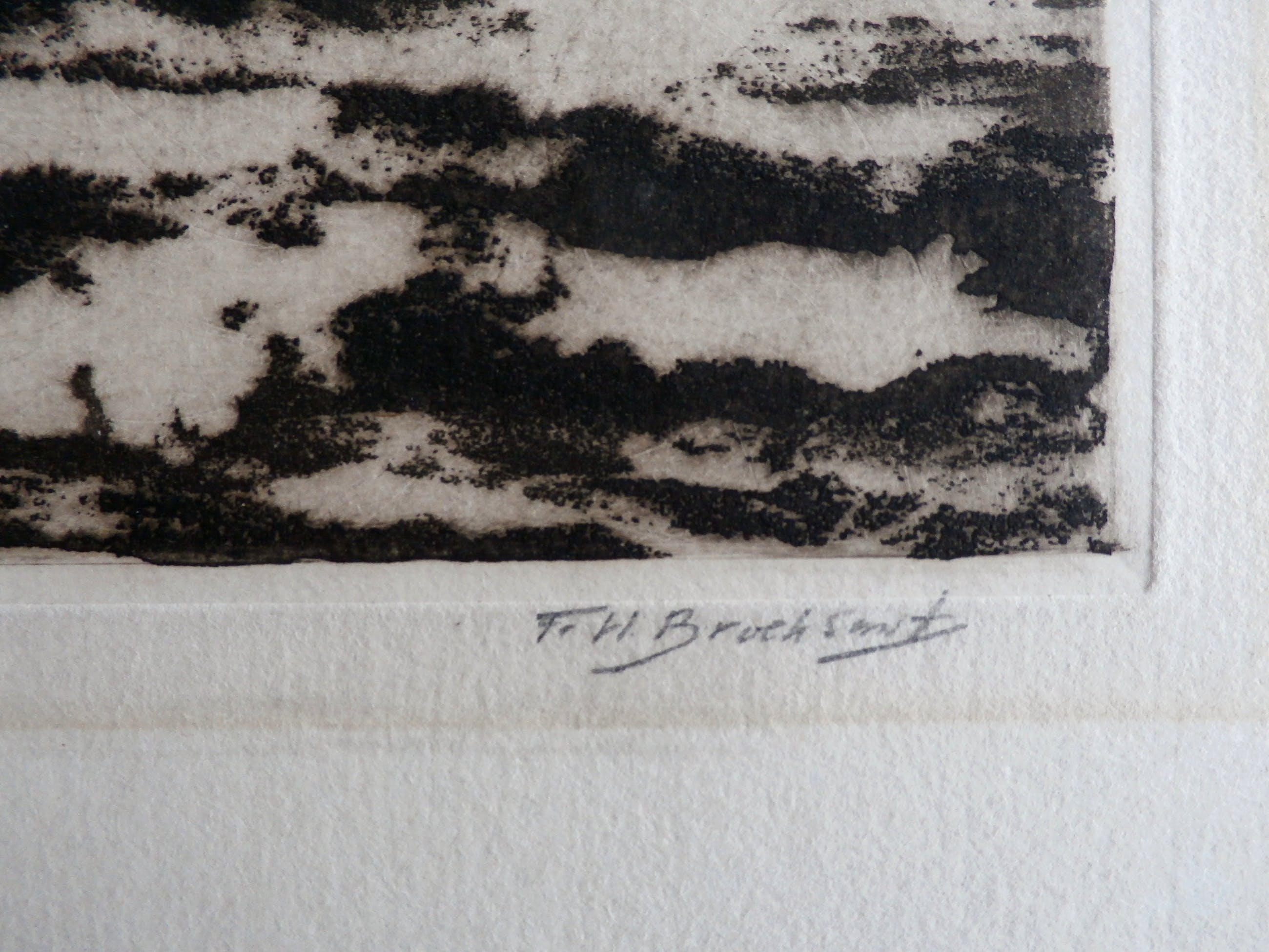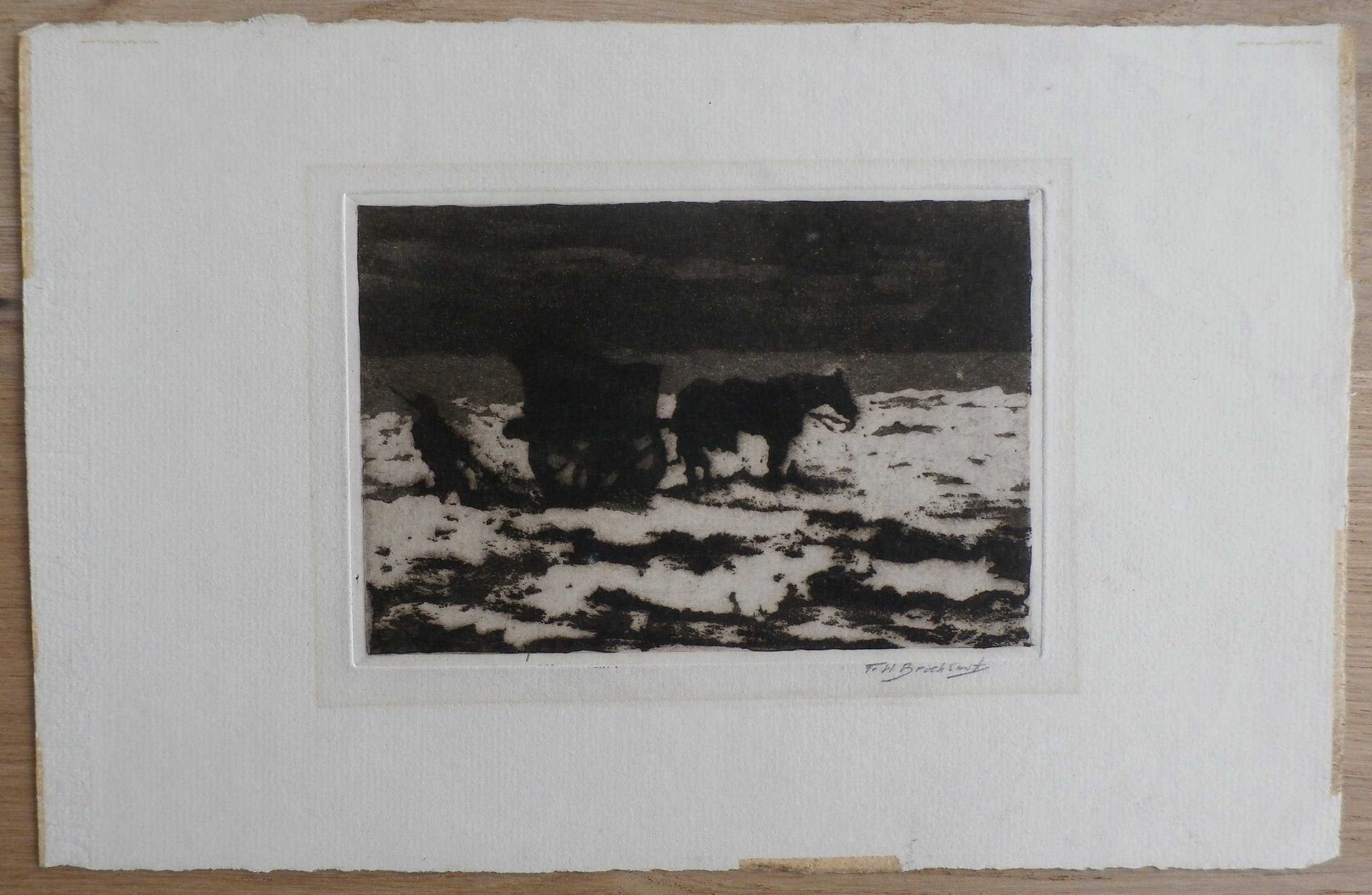 Ets van Frederika Broeksmit. Titel: Schelpenvisser. Afkomstig uit de nalatenschap van de kunstenares. Afmetingen voorstelling: H9,5 x 14 cm.