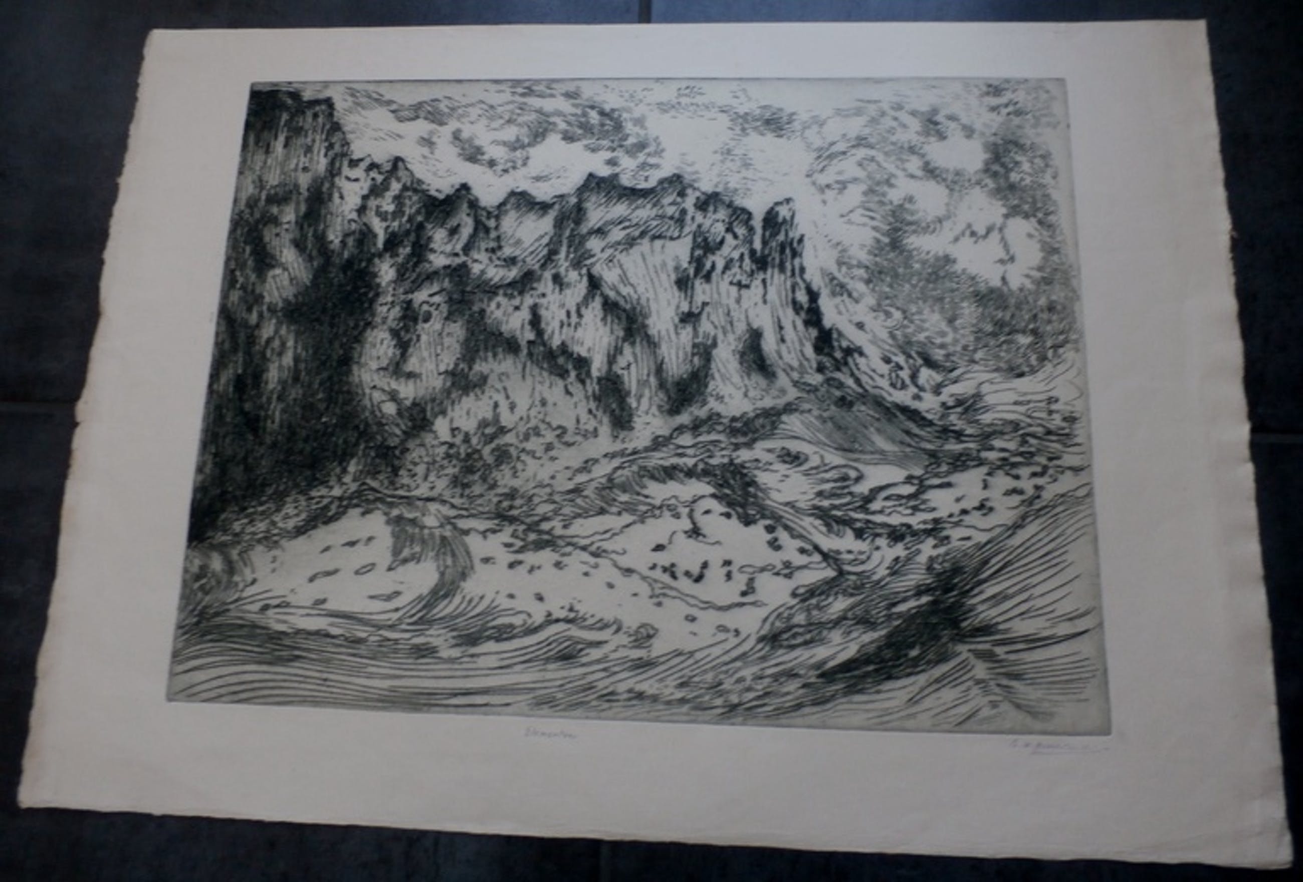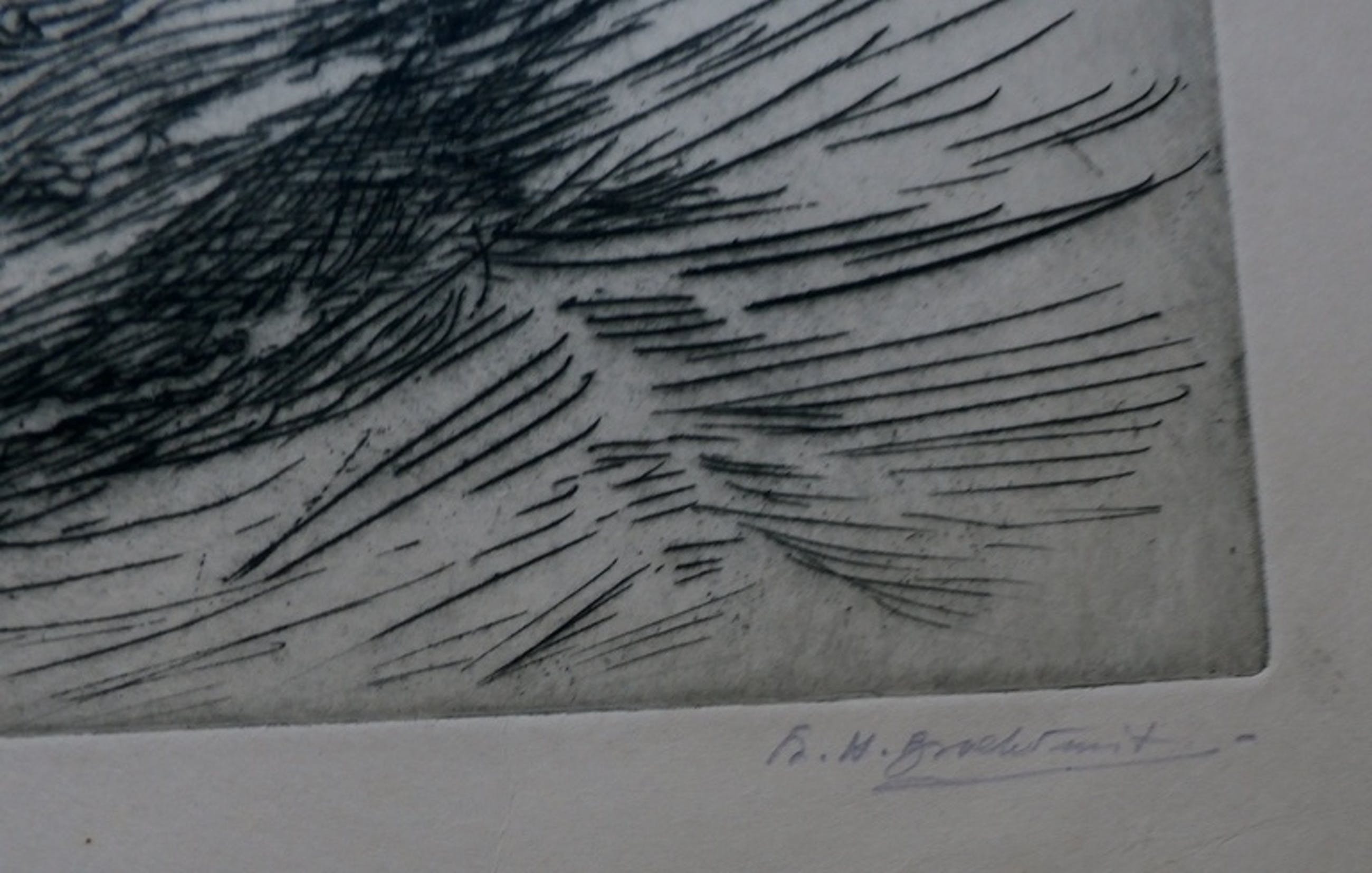 Ets van Frederika Broeksmit. Titel: Elementen. Beperkte oplage. Tweede start, licht afgedrukt. Afmetingen blad: H47 x b65 cm. Afmetingen voorstelling: H38 x b49.5 cm. Het werk is rechtsonder, met potlood, gesigneerd door de kunstenares. Herkomst: uit de nalatenschap van de kunstenares. Conditie voorstelling: In goede staat. Afgedrukt op van Gelder Zonen papier. Literatuur: De voorstelling is afgedrukt in het jaarboek van de vereniging tot bevordering van de grafische kunst, 1914. De authenticiteit van dit werk wordt volledig gegarandeerd. Een certificaat van echtheid kan, op aanvraag, worden meegeleverd.