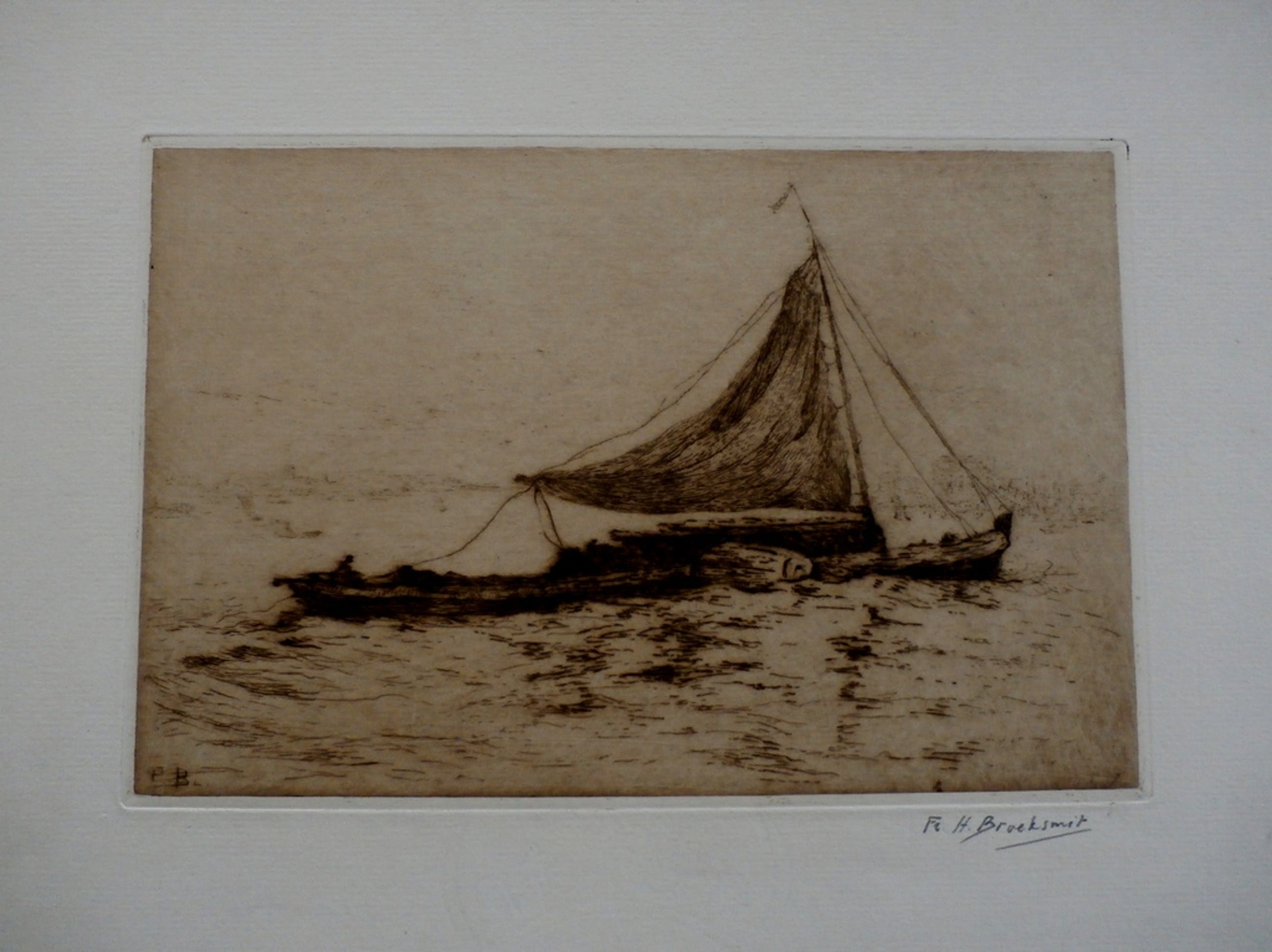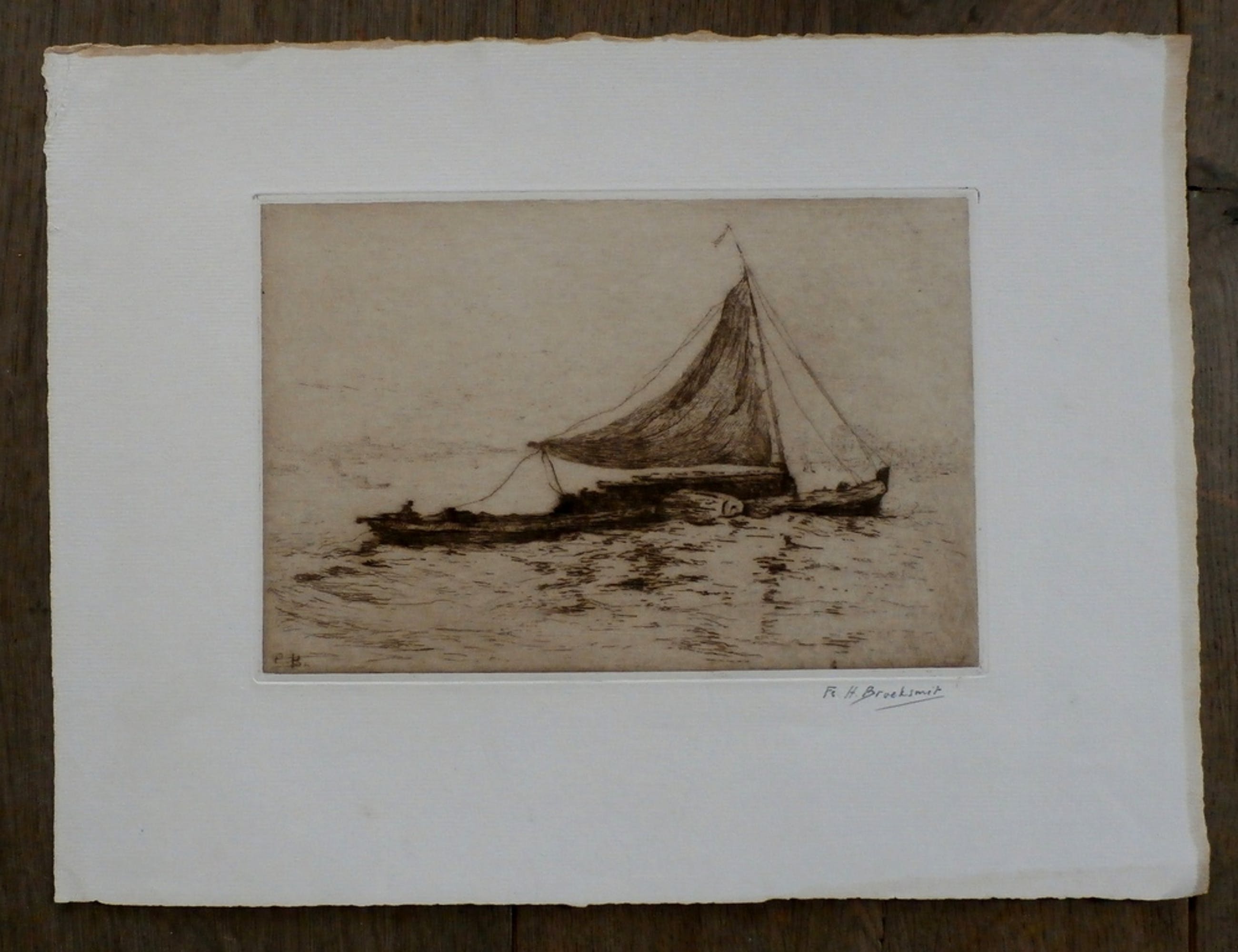 Mooie ets van Frederika Broeksmit met de titel: schuit met zeil. Het betreft een proefdruk uit de nalatenschap van de kunstenaar. De ets is afgedrukt in een bruingrijze tint op Hollands papier met watermerk Franse lelie. Afmetingen ets: h 15,5 x b23,5 cm. Afmetingen blad: h28,5 x 37,5 cm.