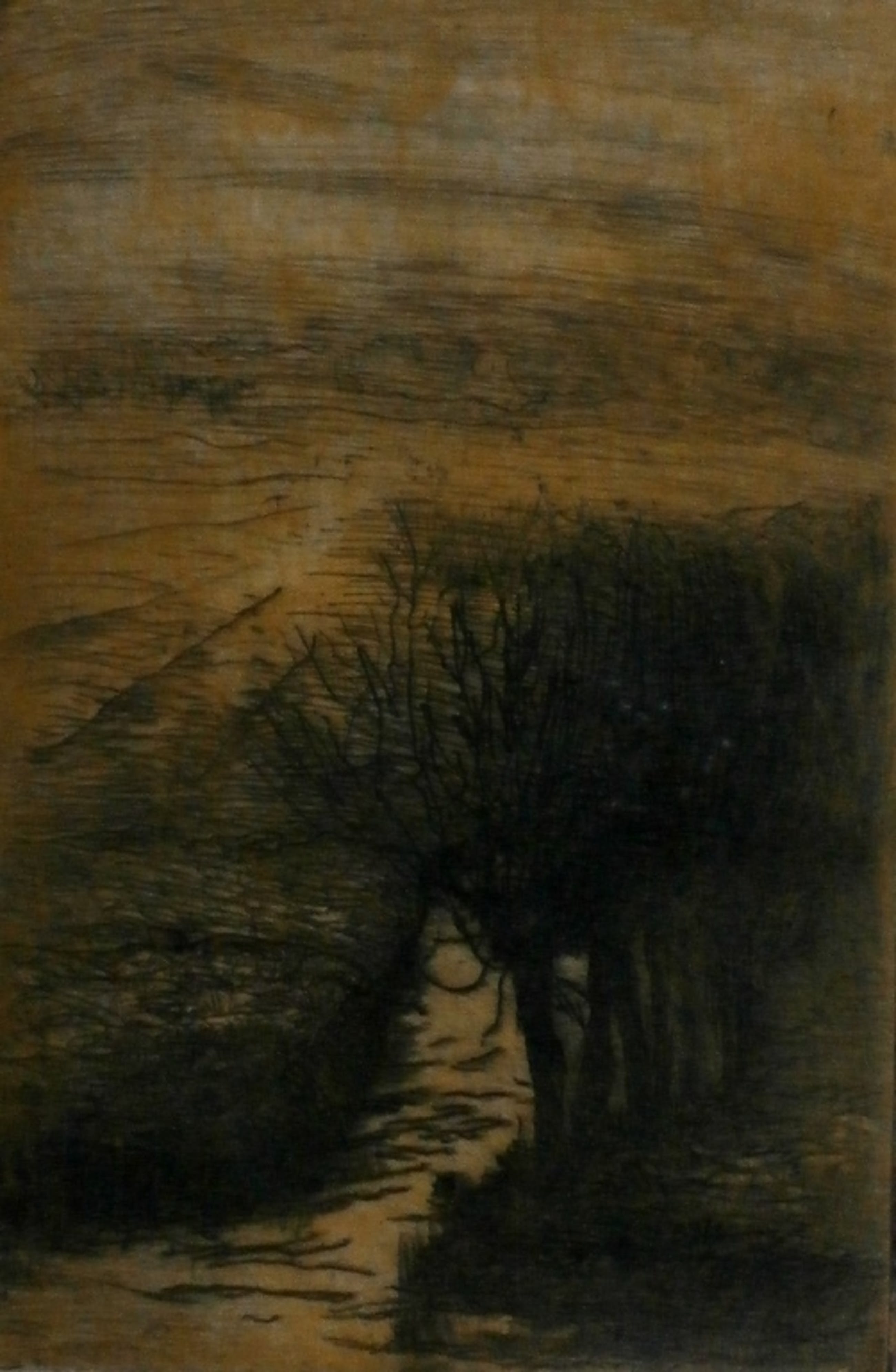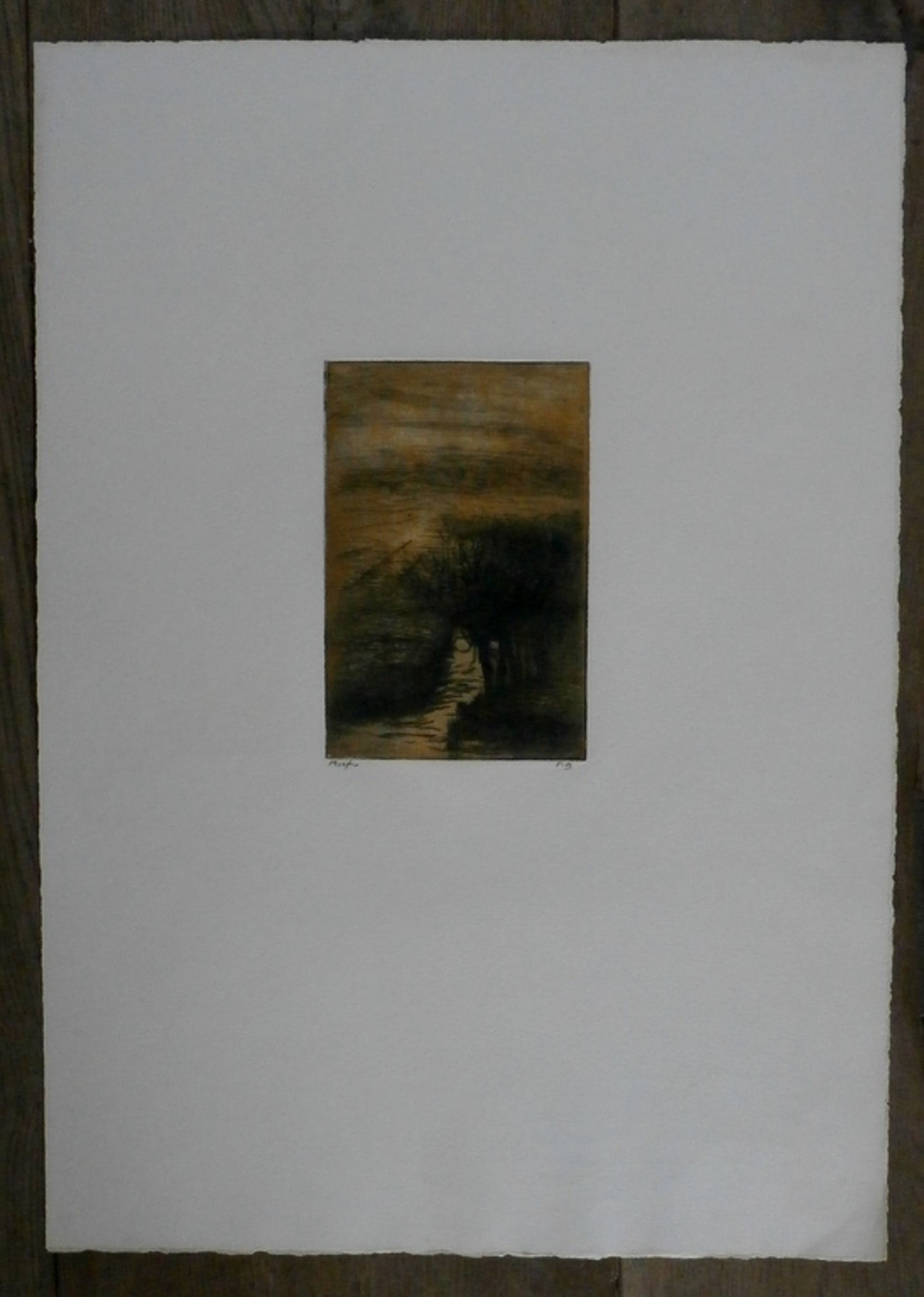 Mooie ets van Frederika Broeksmit met de titel: Slootje met knotwilgen. Het betreft een proefdruk uit de nalatenschap van de kunstenaar. De ets is afgedrukt in een geelbruine tint op Hollands papier met watermerk van Gelder en Zonen. Afmetingen ets: h 5,1 x b10 cm.