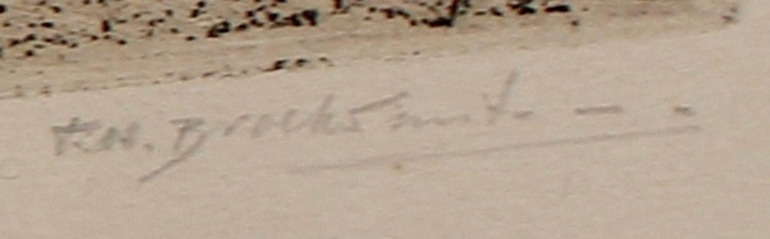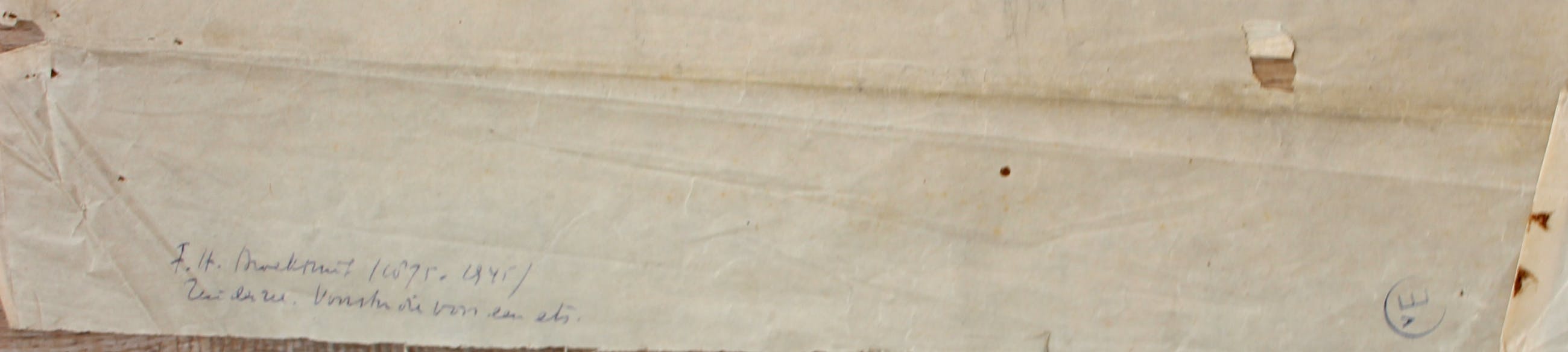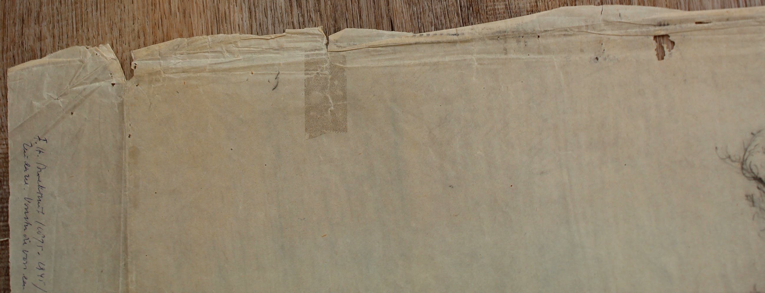 Tekening: Er zitten kreukels op de rand en een gaatje bovenaan en aan de linkerzijkant. Goed ingelijst, valt dit in de lijst/onder de passepartout.