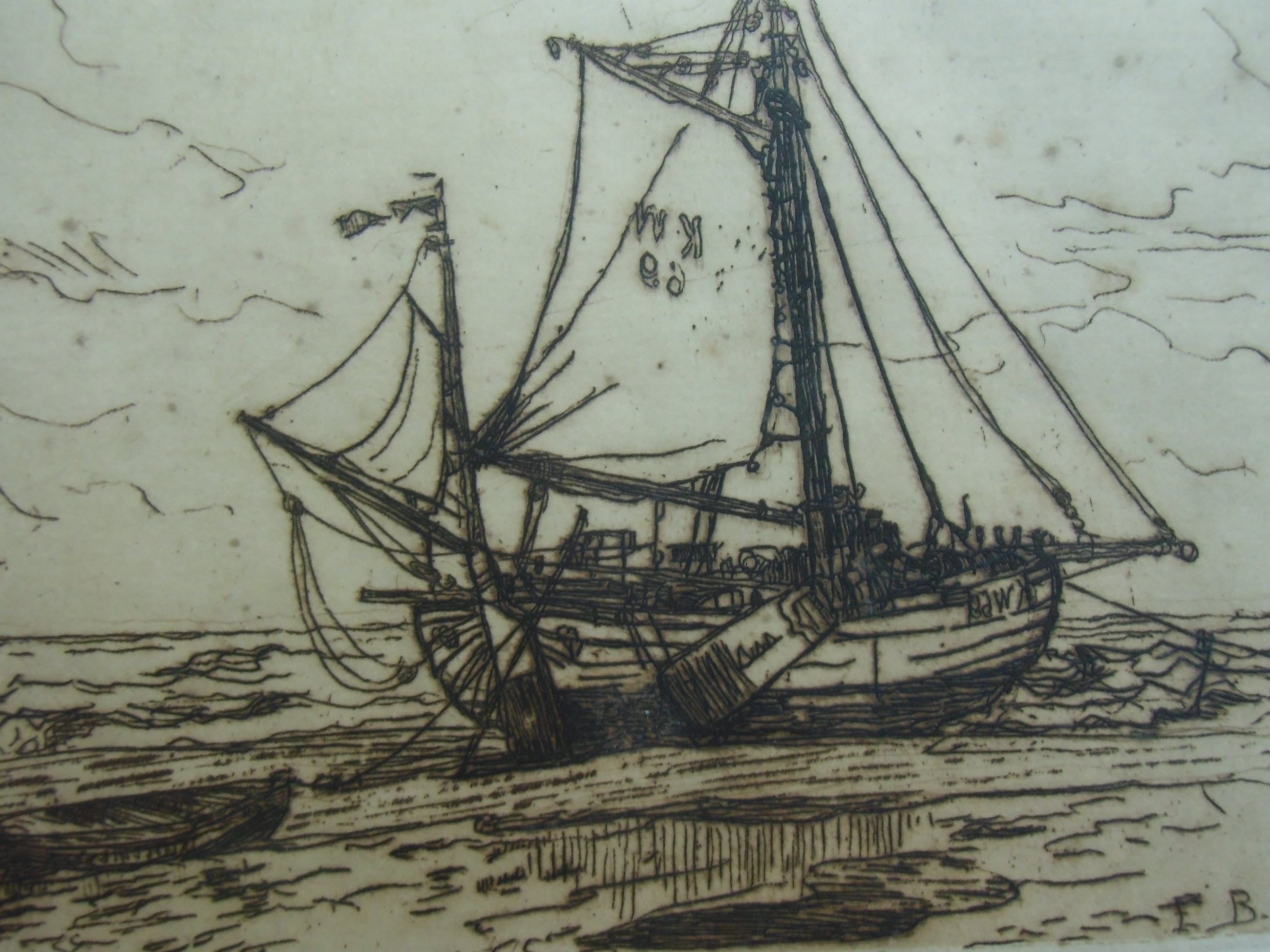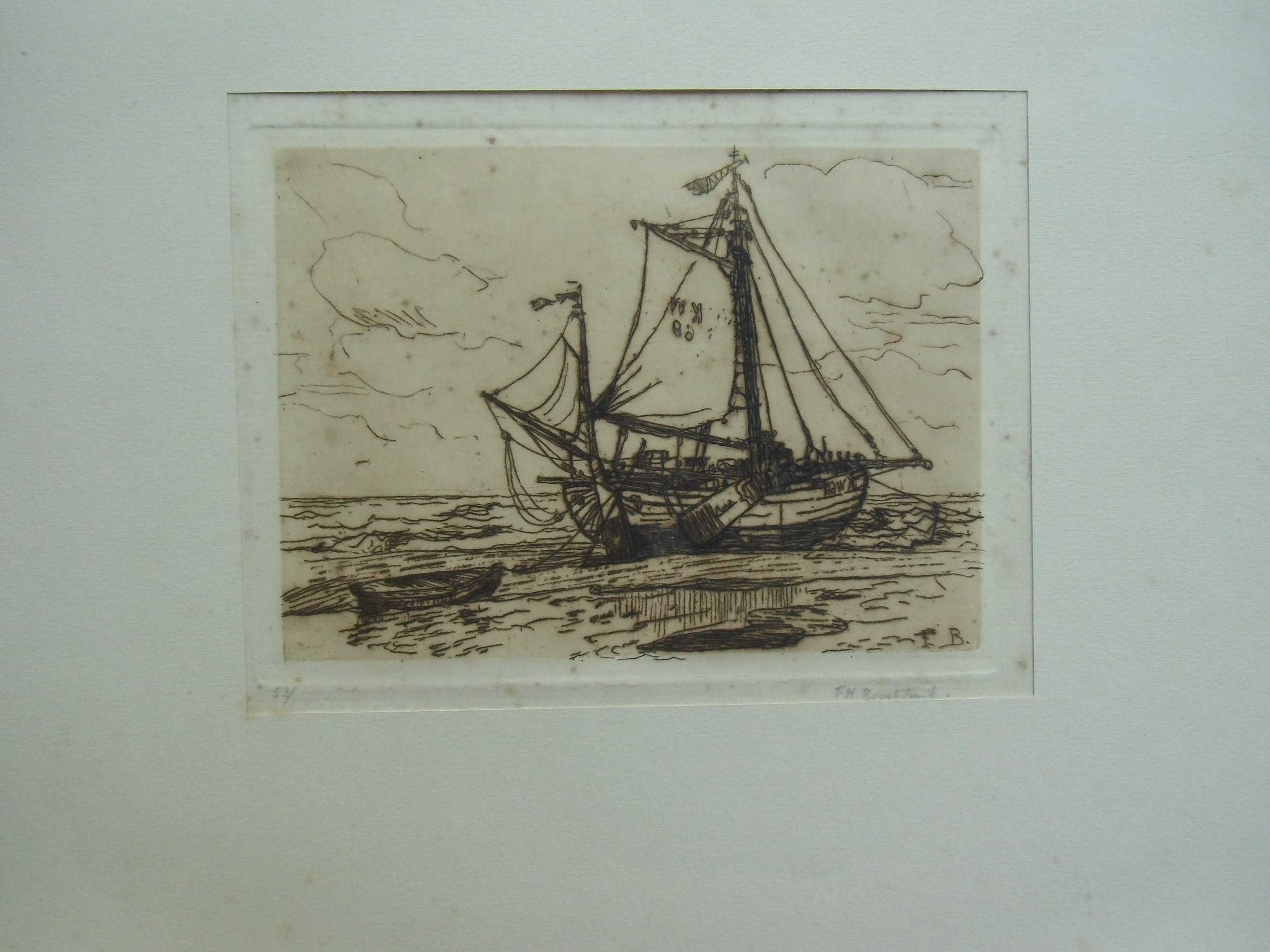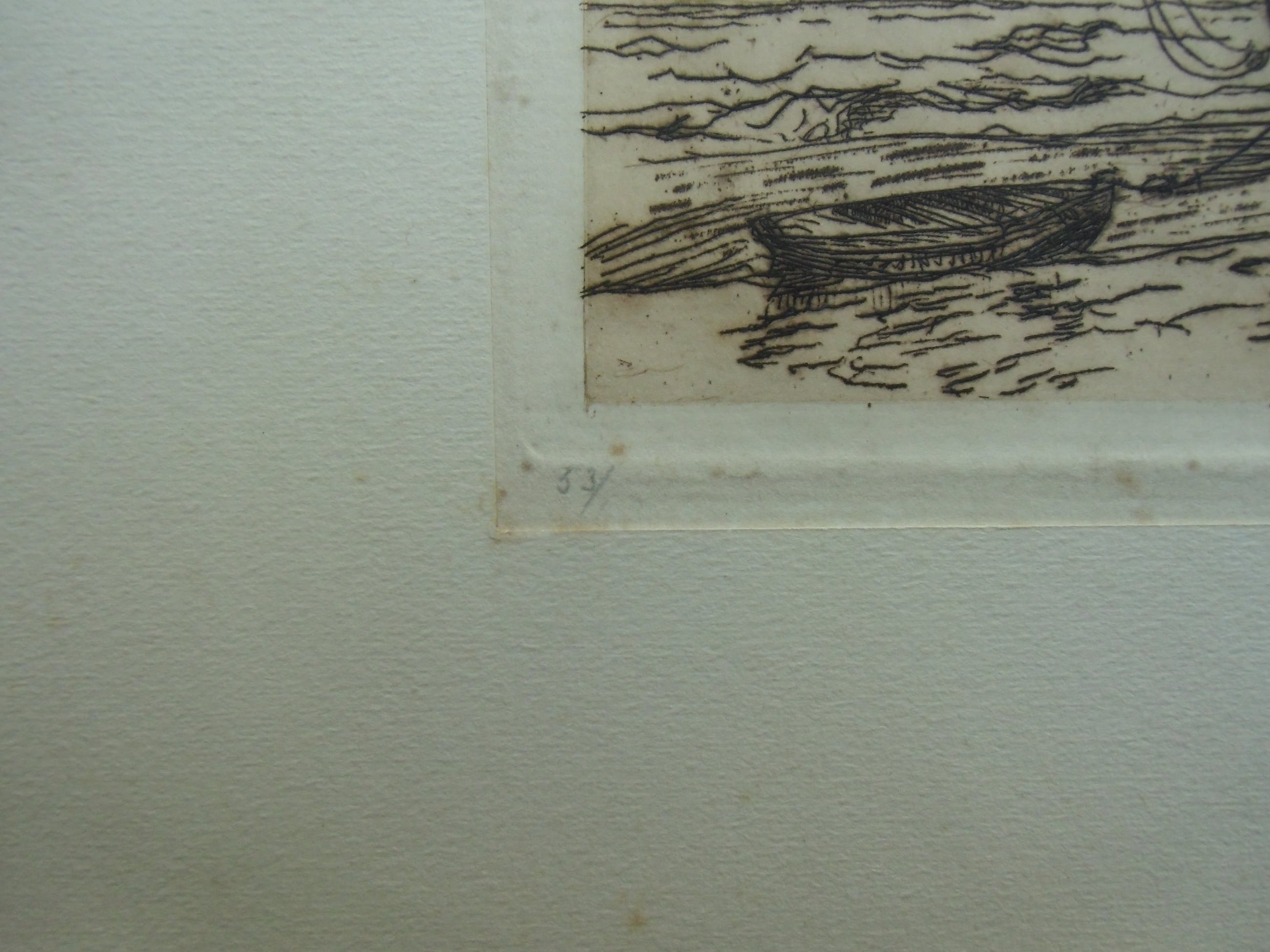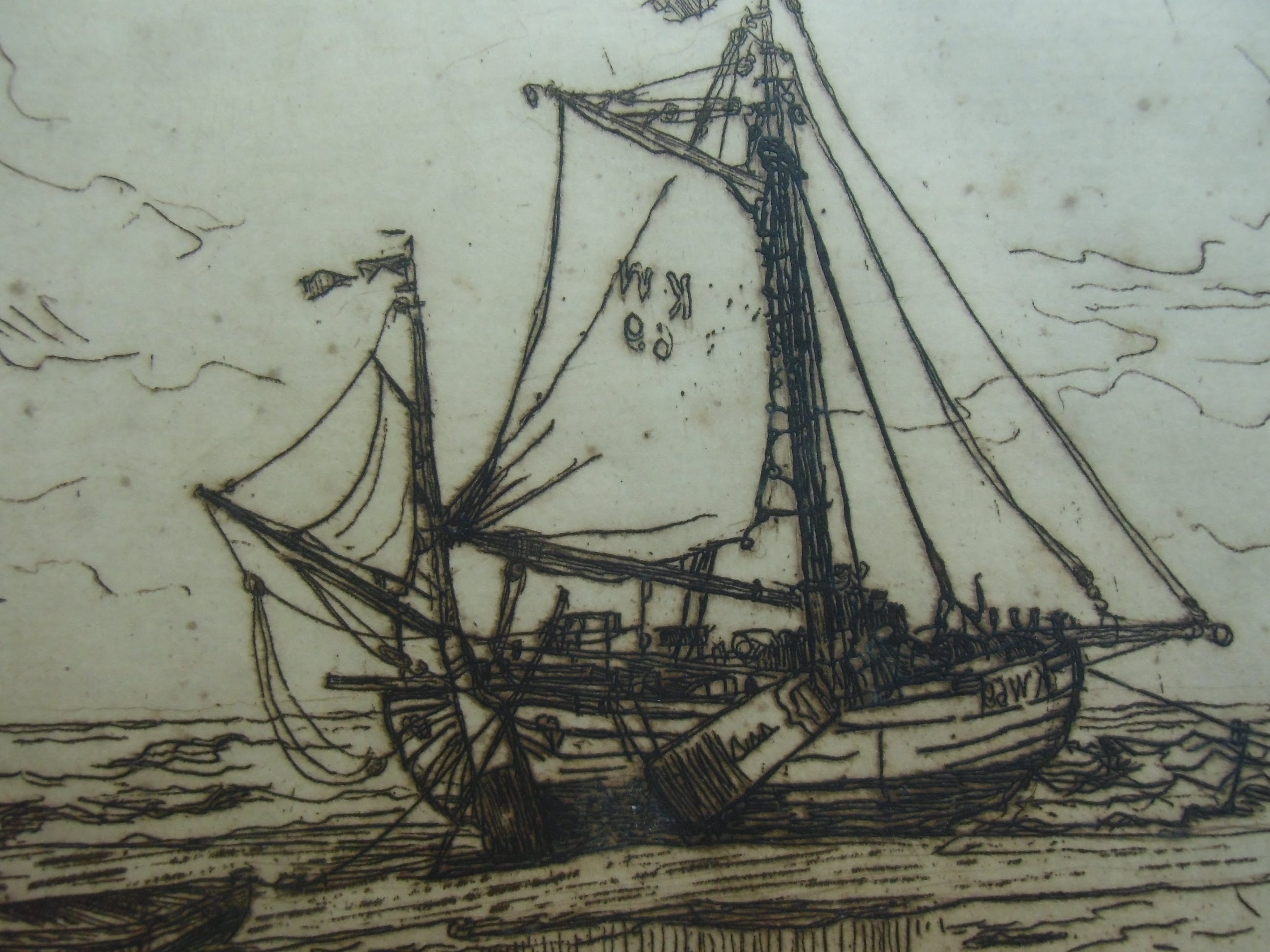 Een voor het werk van Broeksmit kenmerkend klein etsje van een vissersboot. Voorzien van atelier-passepartout. Licht gebruind en foxing in de marges . Toch goede conditie. Verzending gratis.