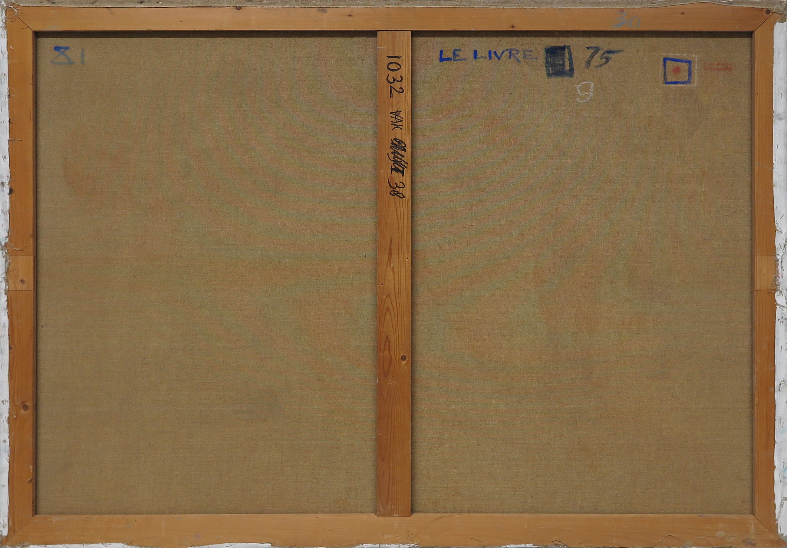 | Goede staat gezien leeftijd, maar wel met enkele beschadigingen. Wat slijtage langs de randen en hoeken. Met name langs de rand links is ook wat verfverlies (mogelijk door eerdere inlijsting). Paar bruinige vlekjes/spatjes langs de onderste rand links. In het midden van het doek, t.h.v. de onderbuik een kleine beschadiging met verfverlies met een paar krasjes. In de rechter(onder)helft van het doek paar horizontale blaasjes in de verf, waarbij de verf een beetje 'opstaat'. Zichtbaar op de eerste foto's, met name in het blauwe veld van het boek en een beetje links daarvan bij het rood/oranje. | |