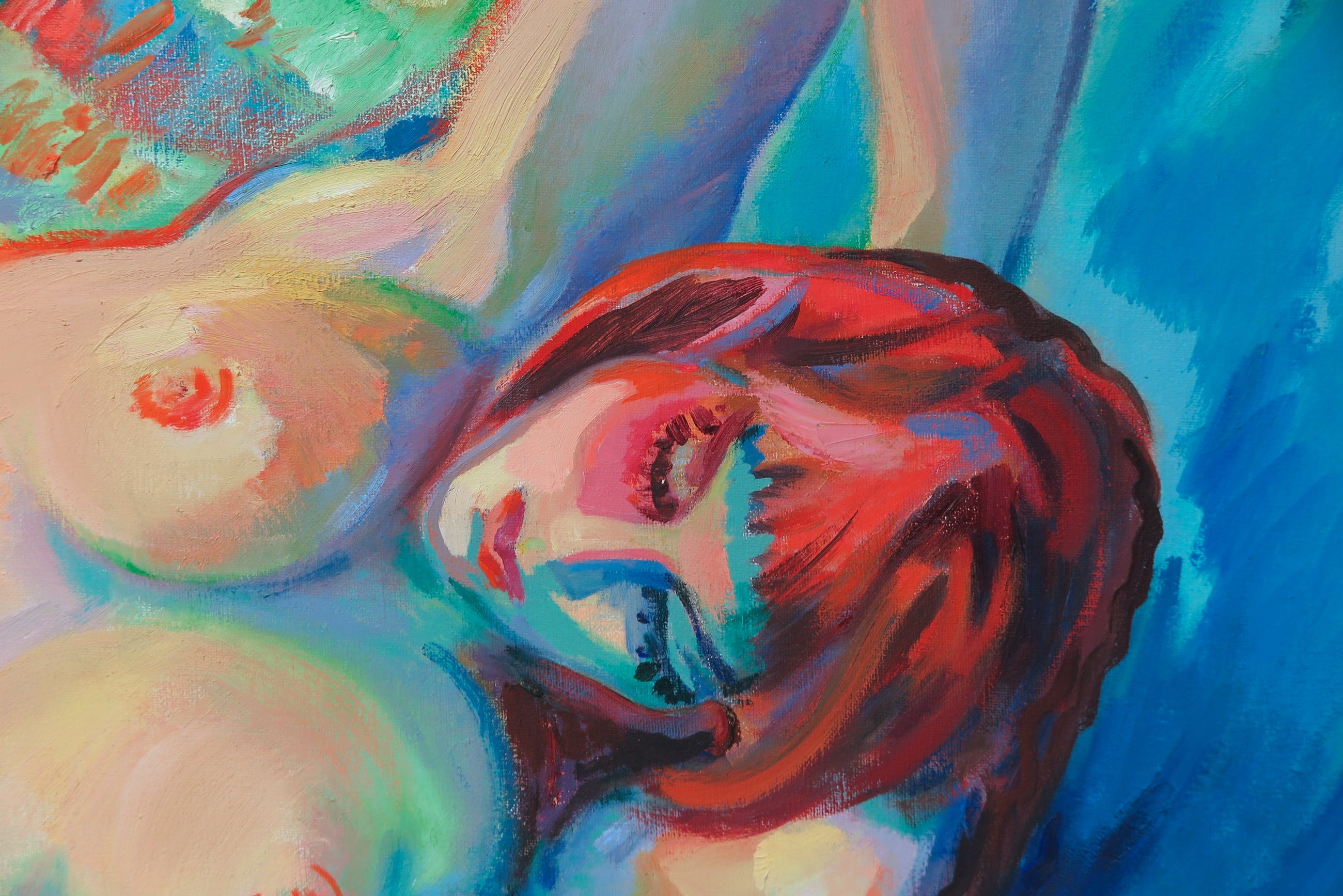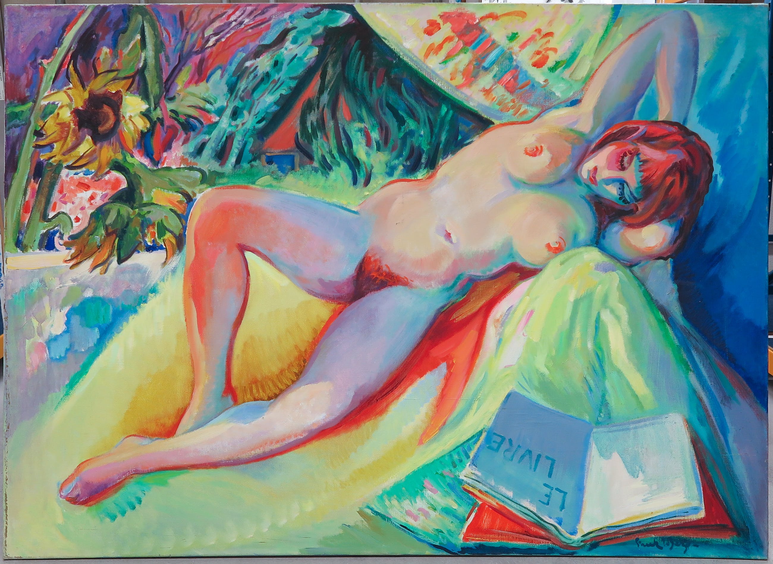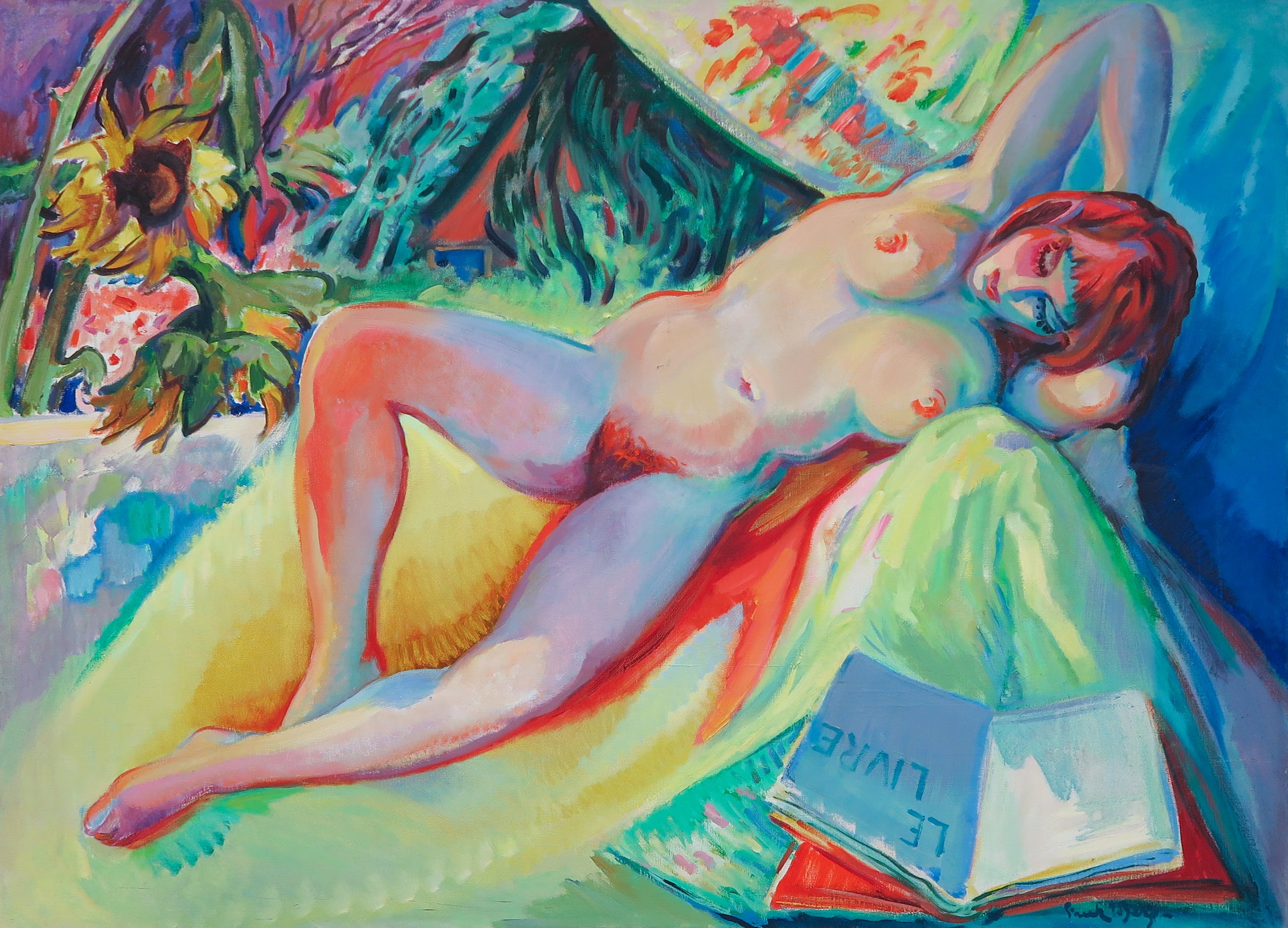 Groot kleurrijk doek in een impressionistische stijl, van een liggende naakte vrouw met boek.
