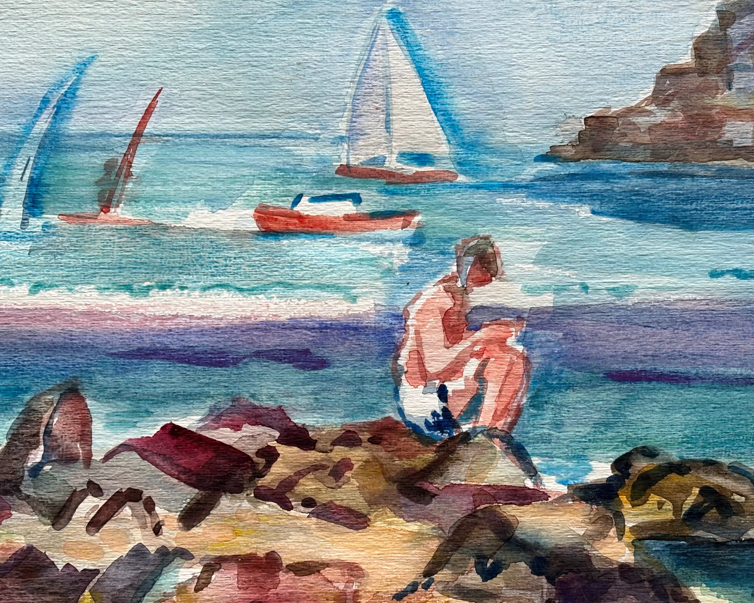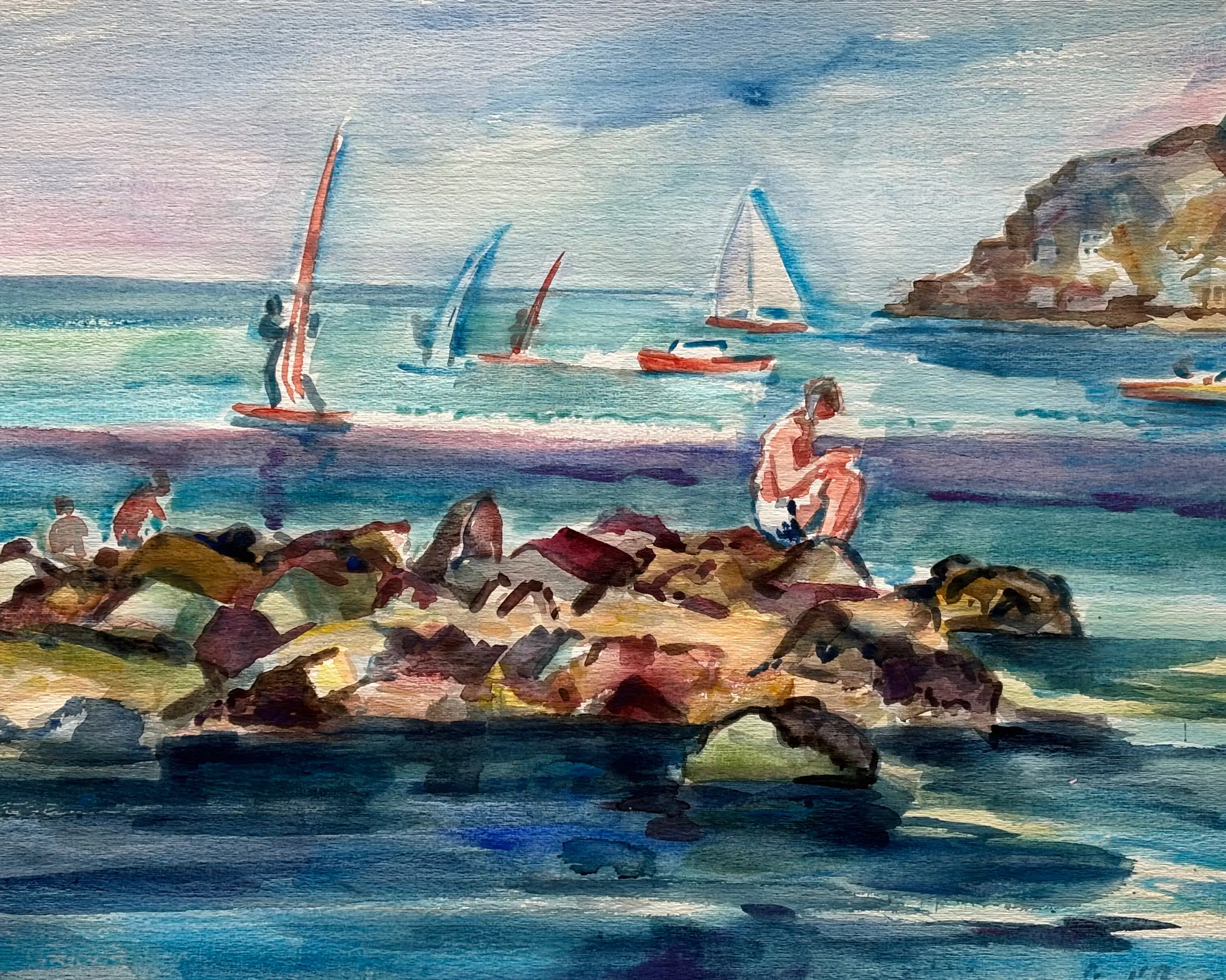Prachtige kleurrijke aquarel op dik papier van Amsterdamse schilder Freek van den Berg (1918-2000).