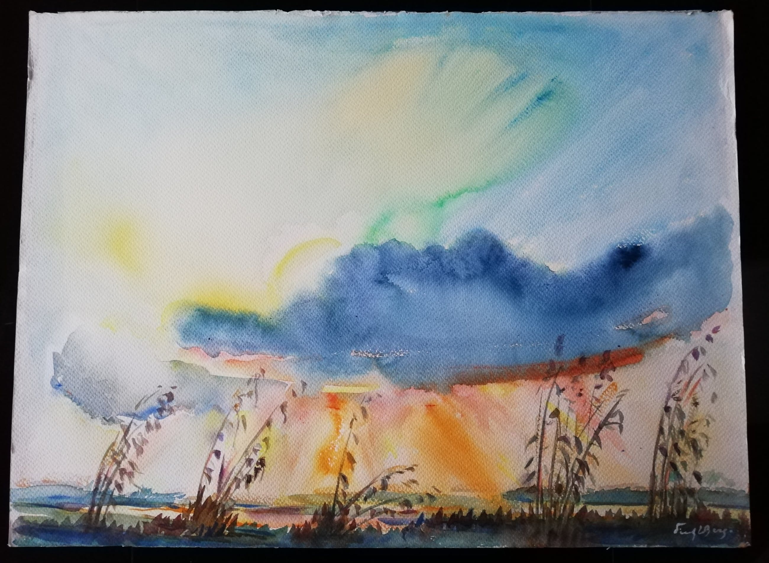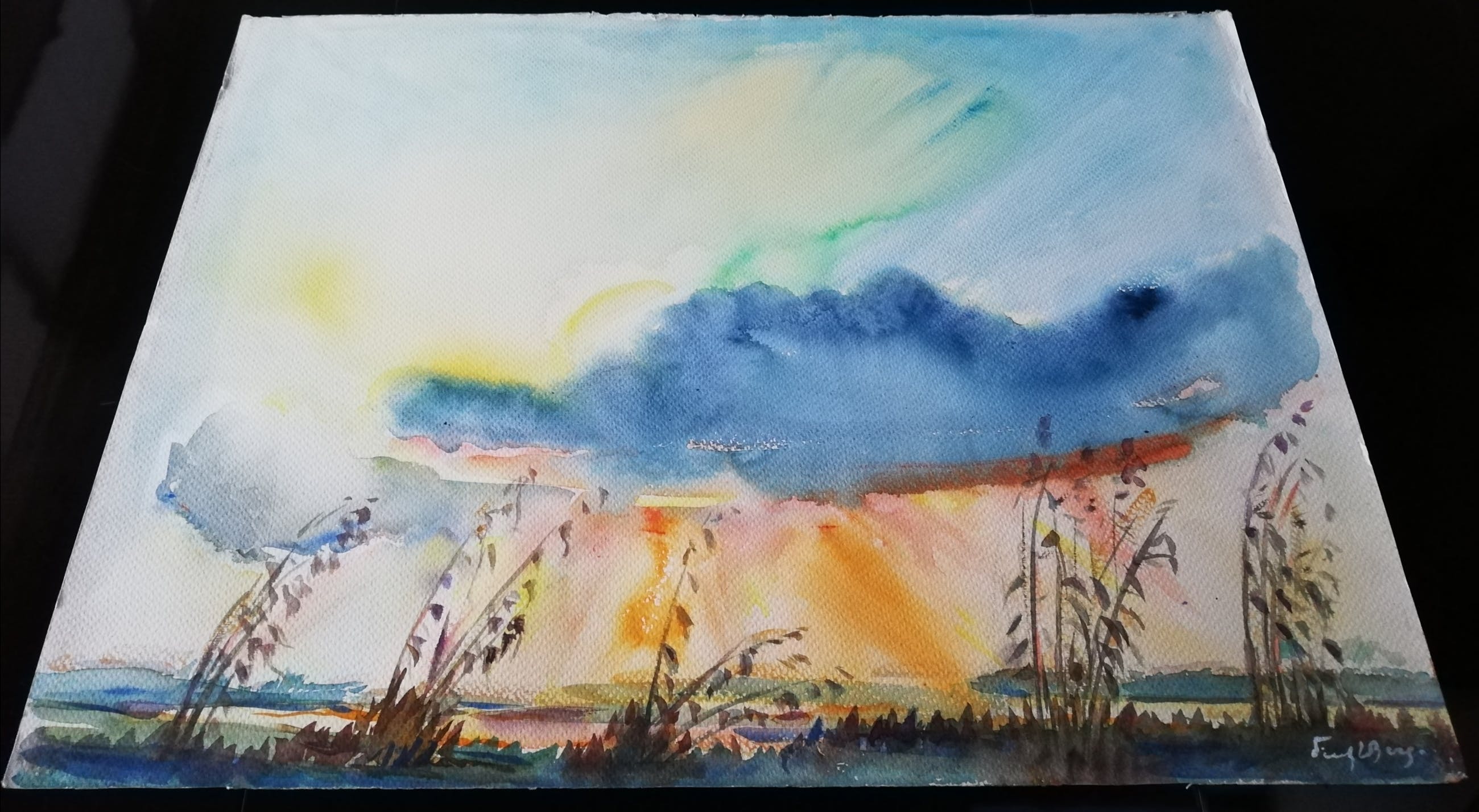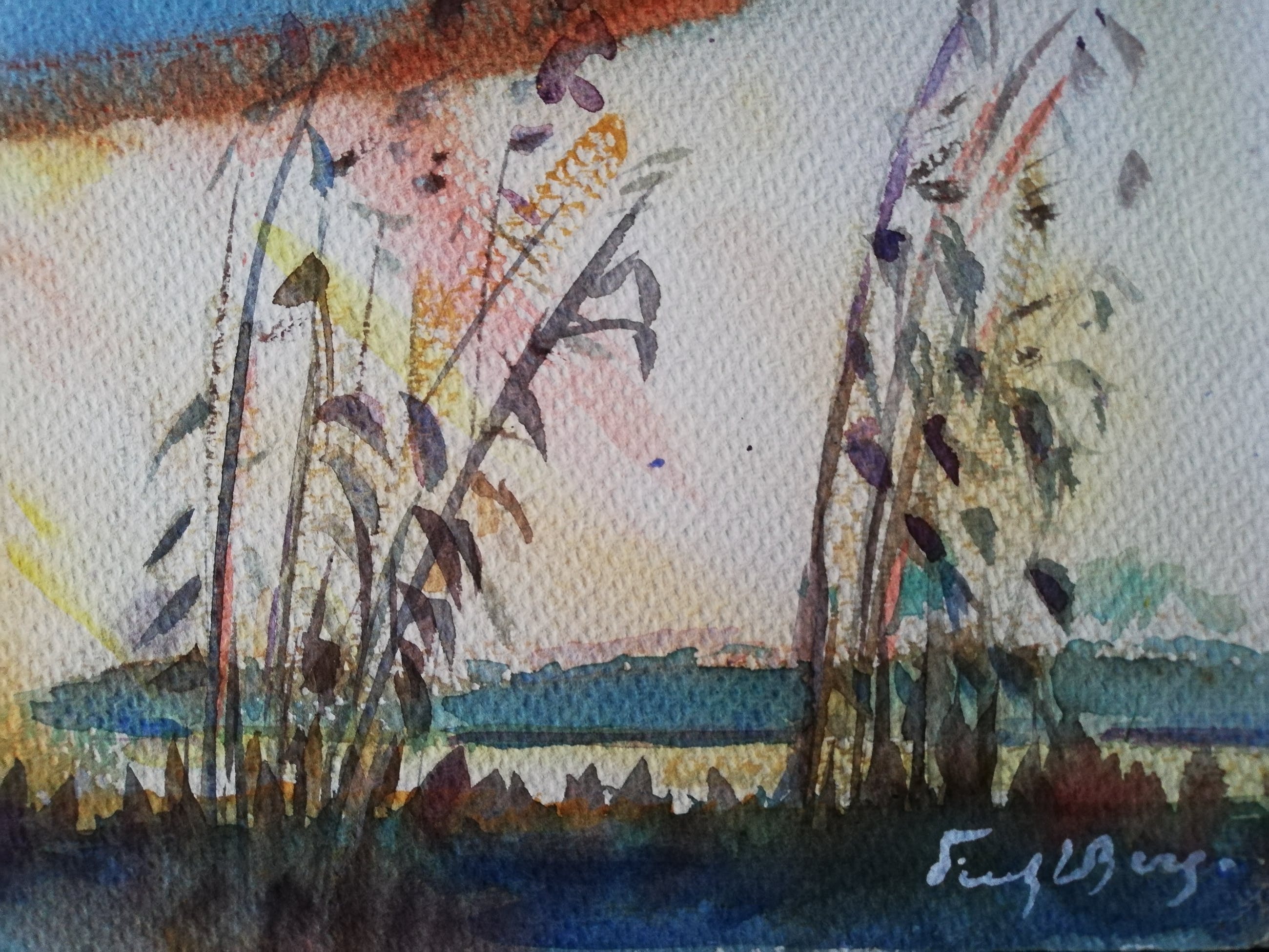 Mooie en zeer grote aquarel van Freek van den Berg op zeer dik papier. Handgesigneerd op de voorzijde en voorzien van monogram op achterzijde. Getiteld "Veessen". Afkomstig uit de nalatenschap van de kunstenaar.