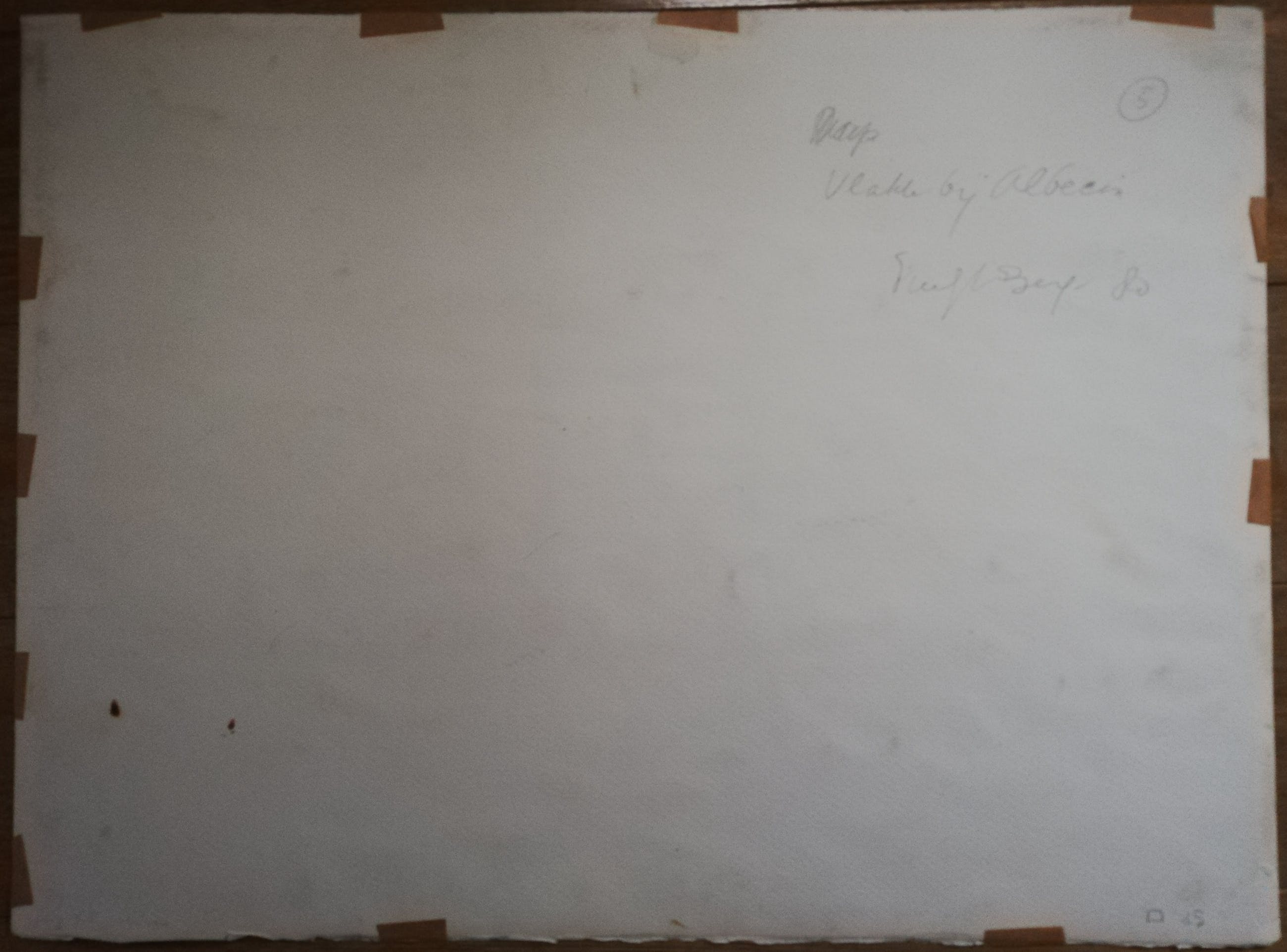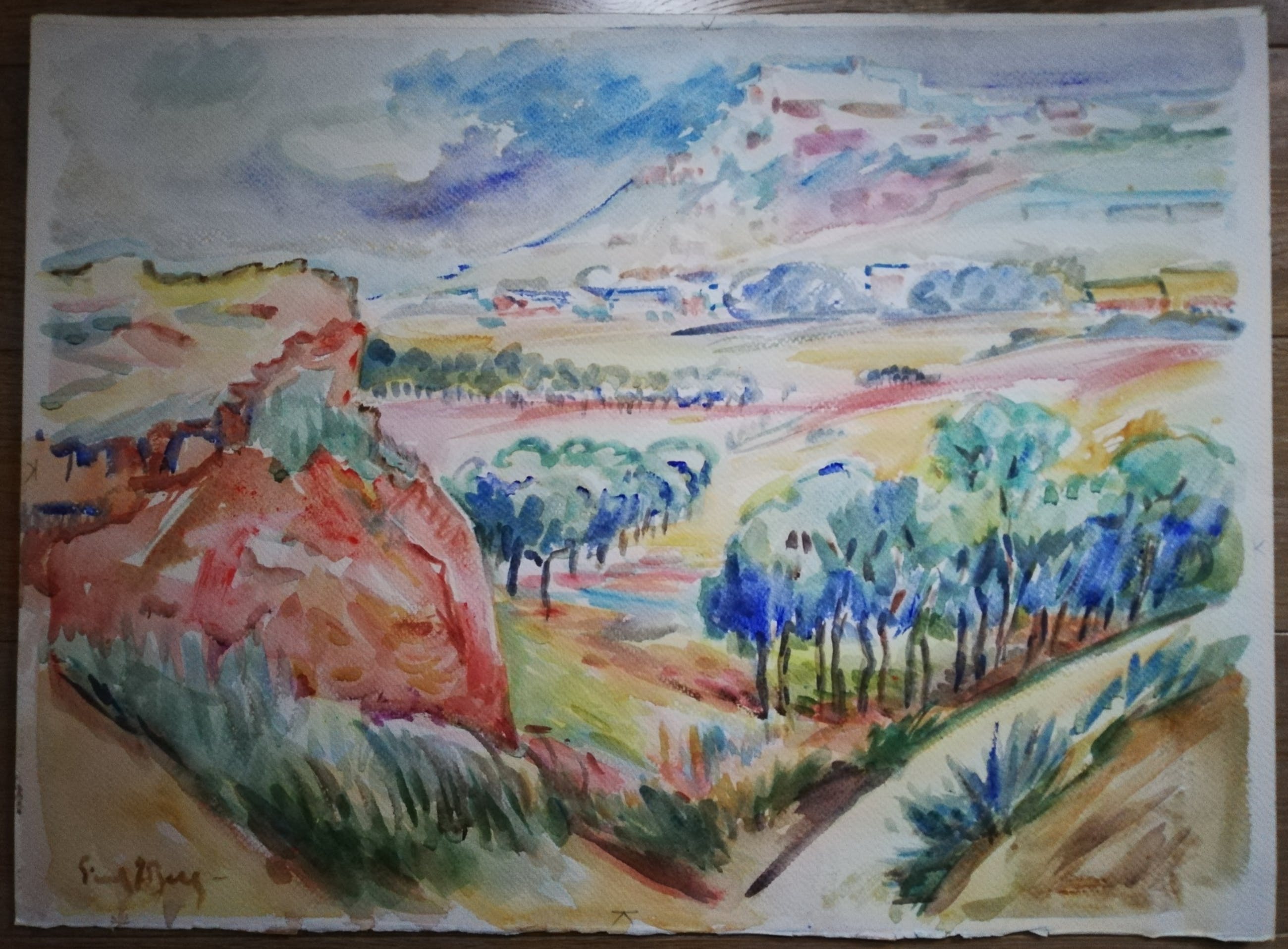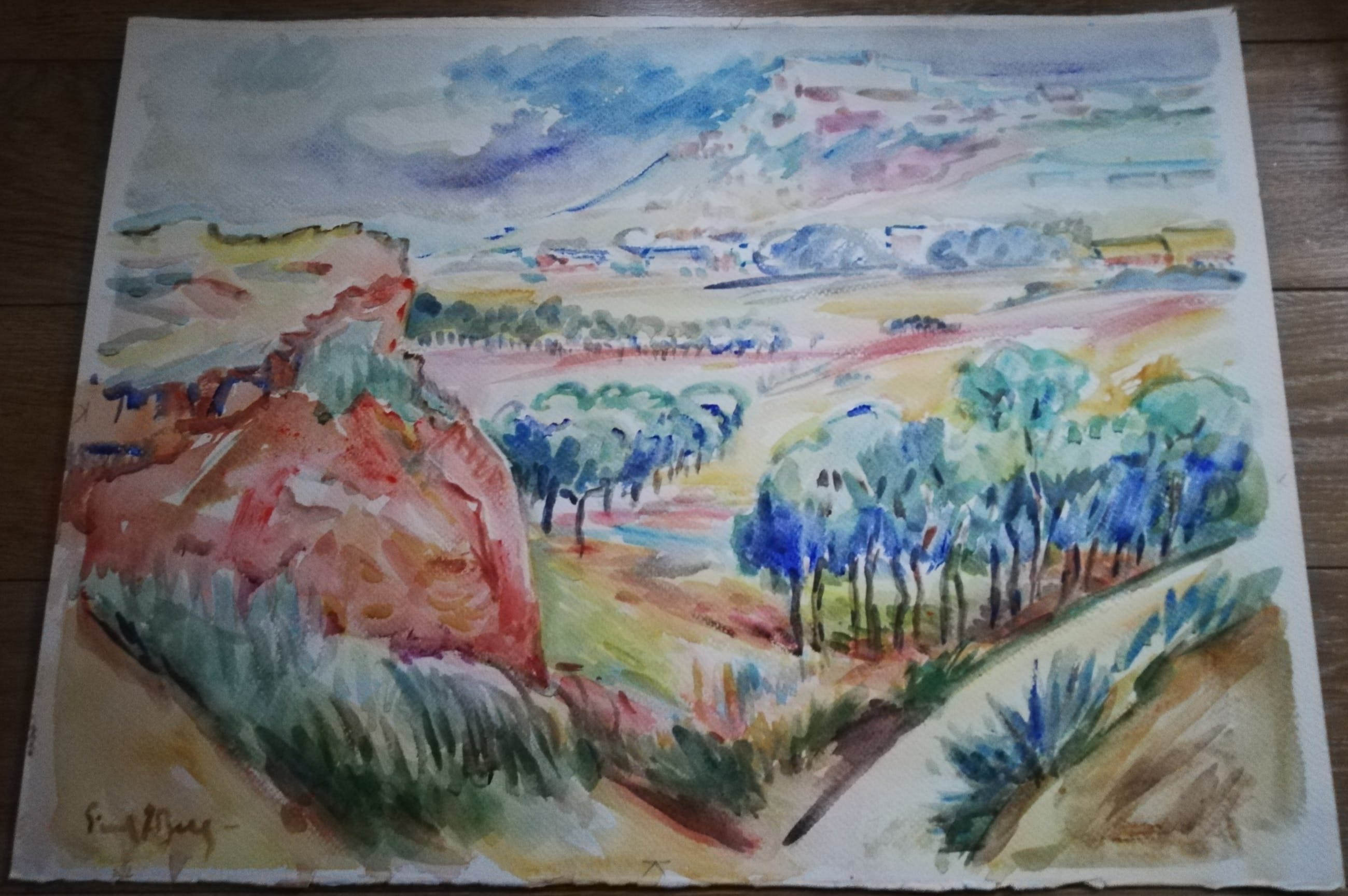 Mooie en zeer grote aquarel van Freek van den Berg. Handgesigneerd linksonder en nogmaals in potlood op de achterzijde. Op achterzijde tevens in potlood de titel en datering (1980). Kleurrijk landschap op zeer dik papier.