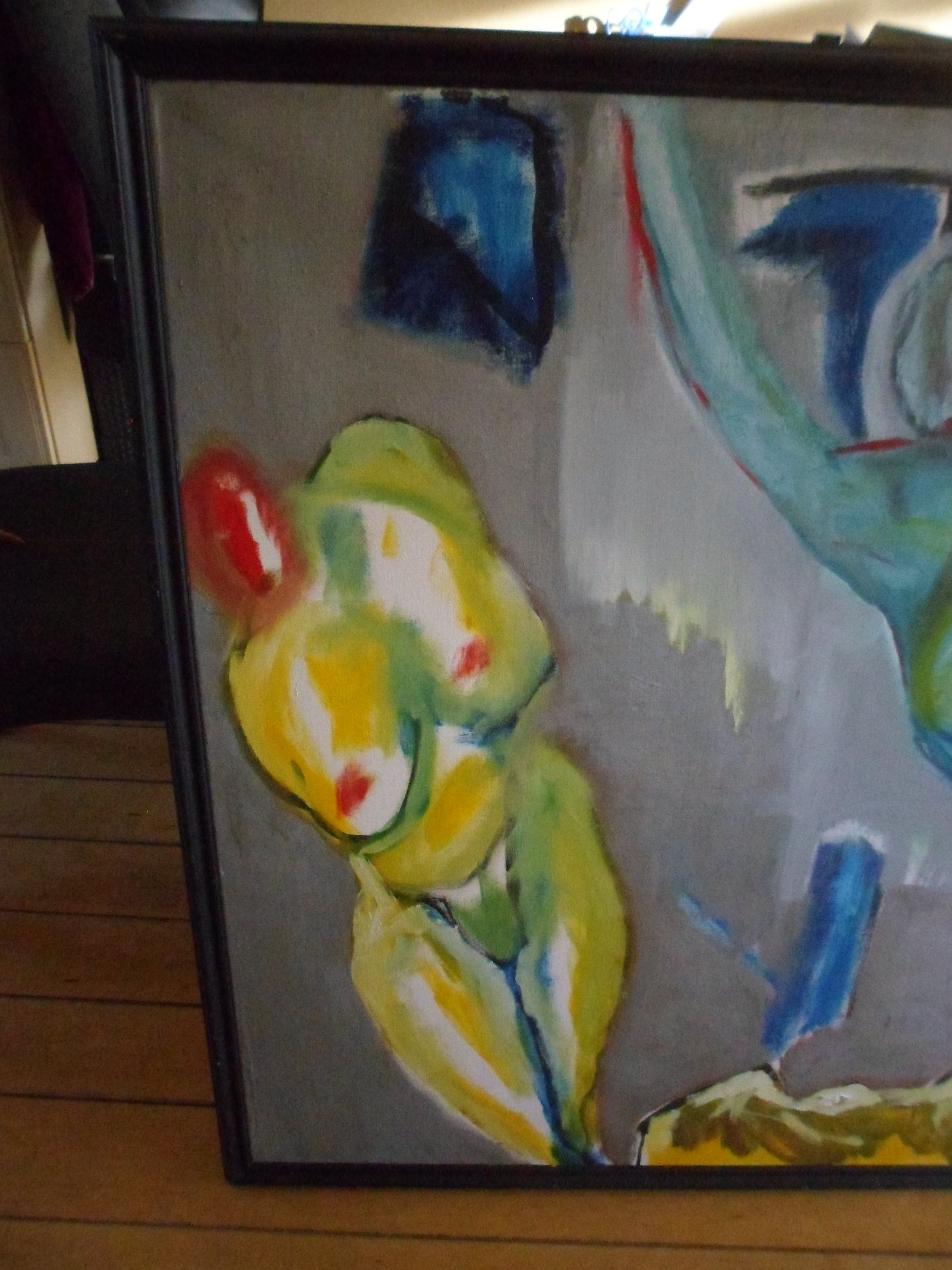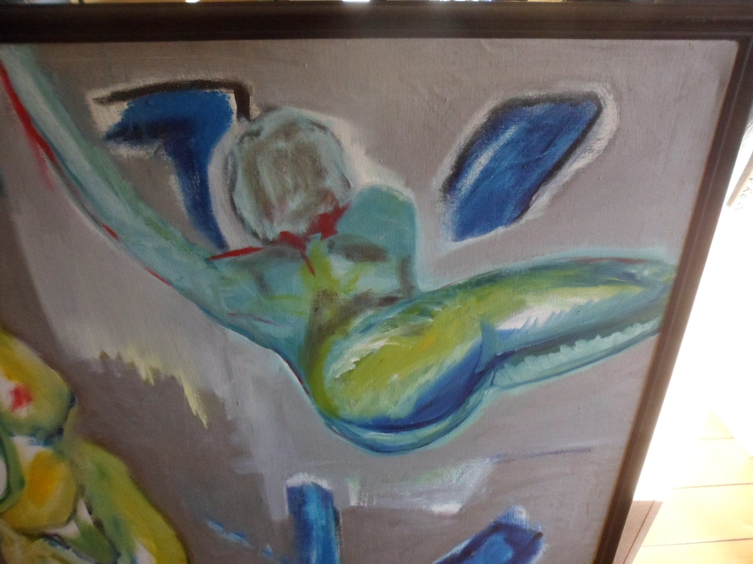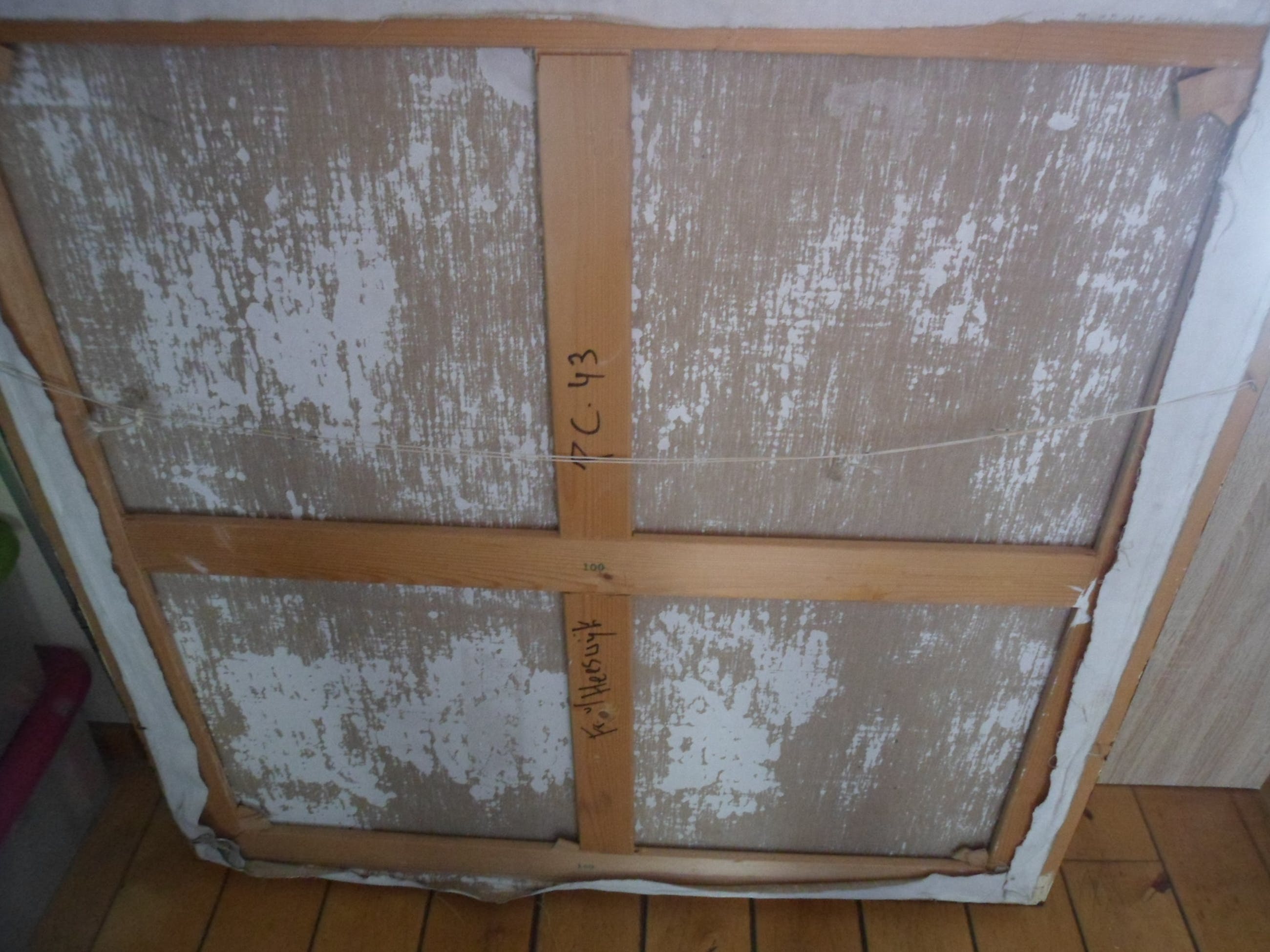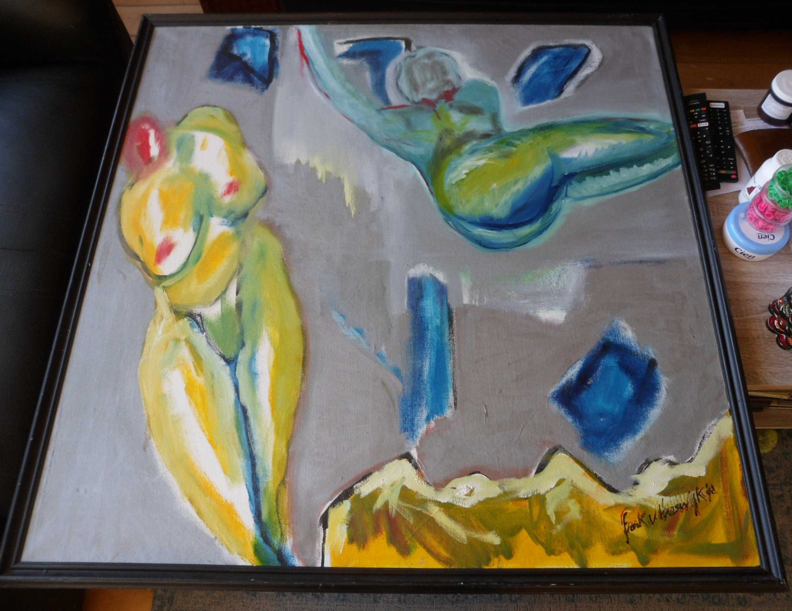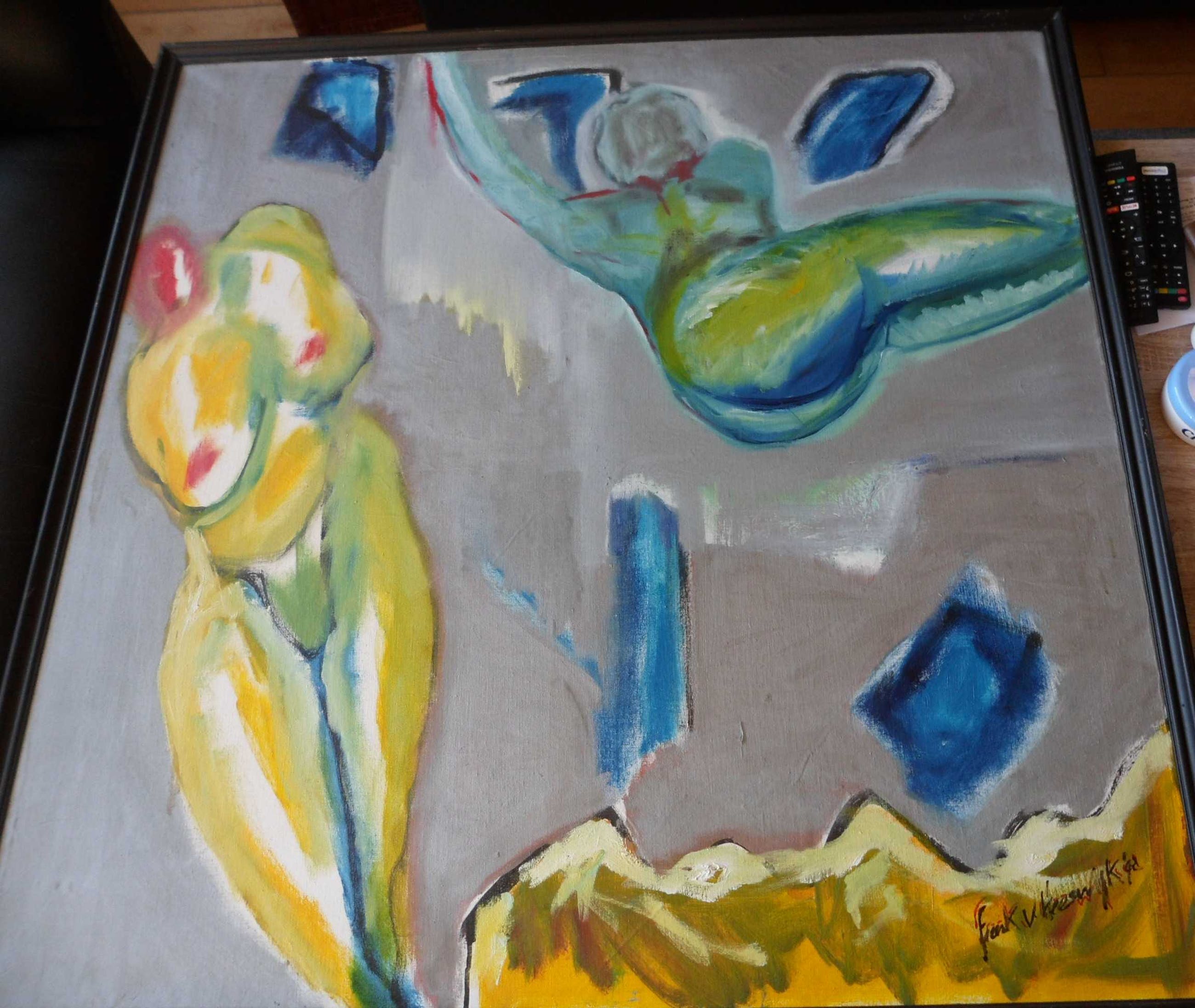 Groot olieverfschilderij van Frenk Heeswijk. Doek maat 100 x 100 cm en met lijst ongeveer 106 x 106 cm.