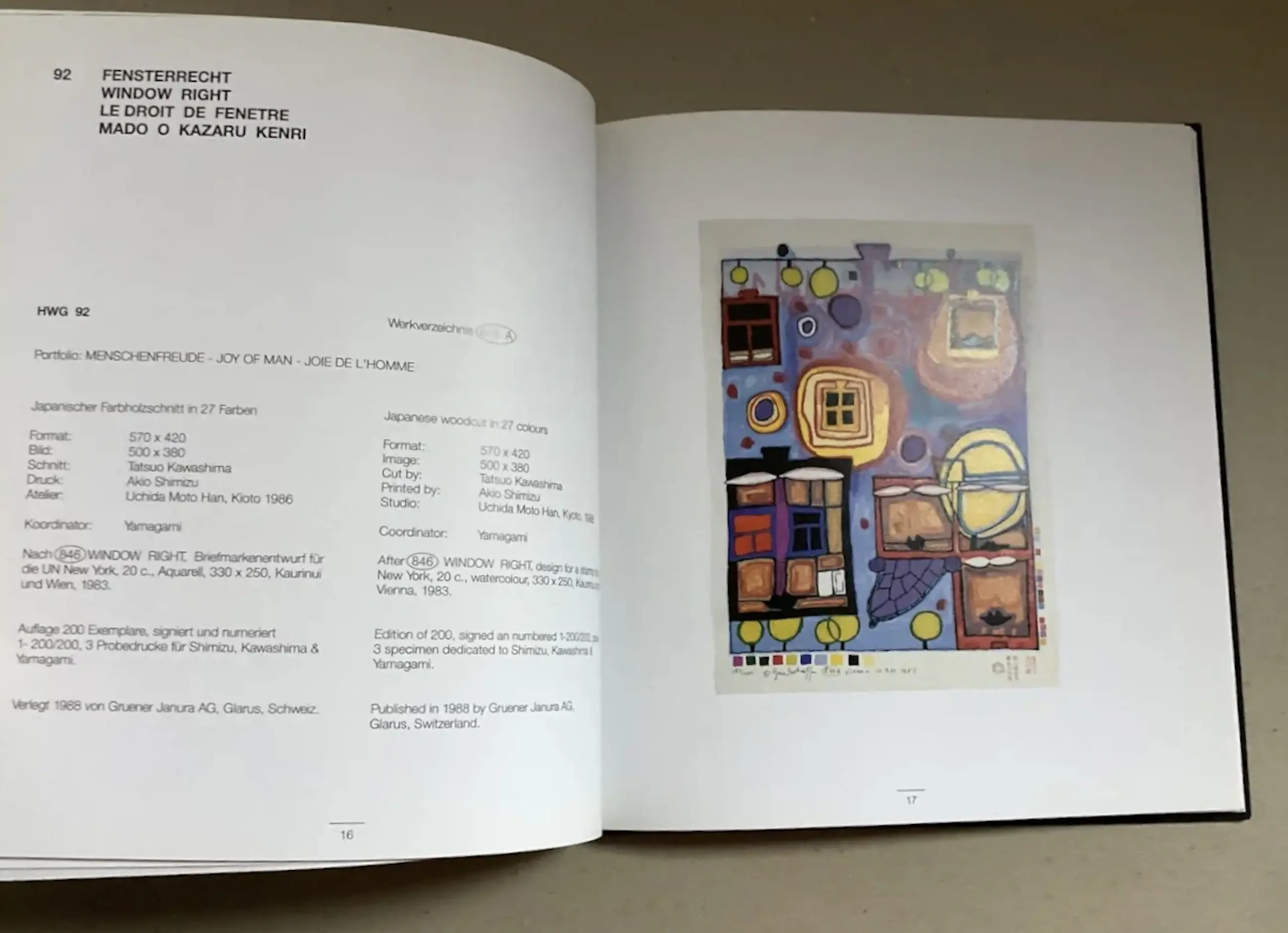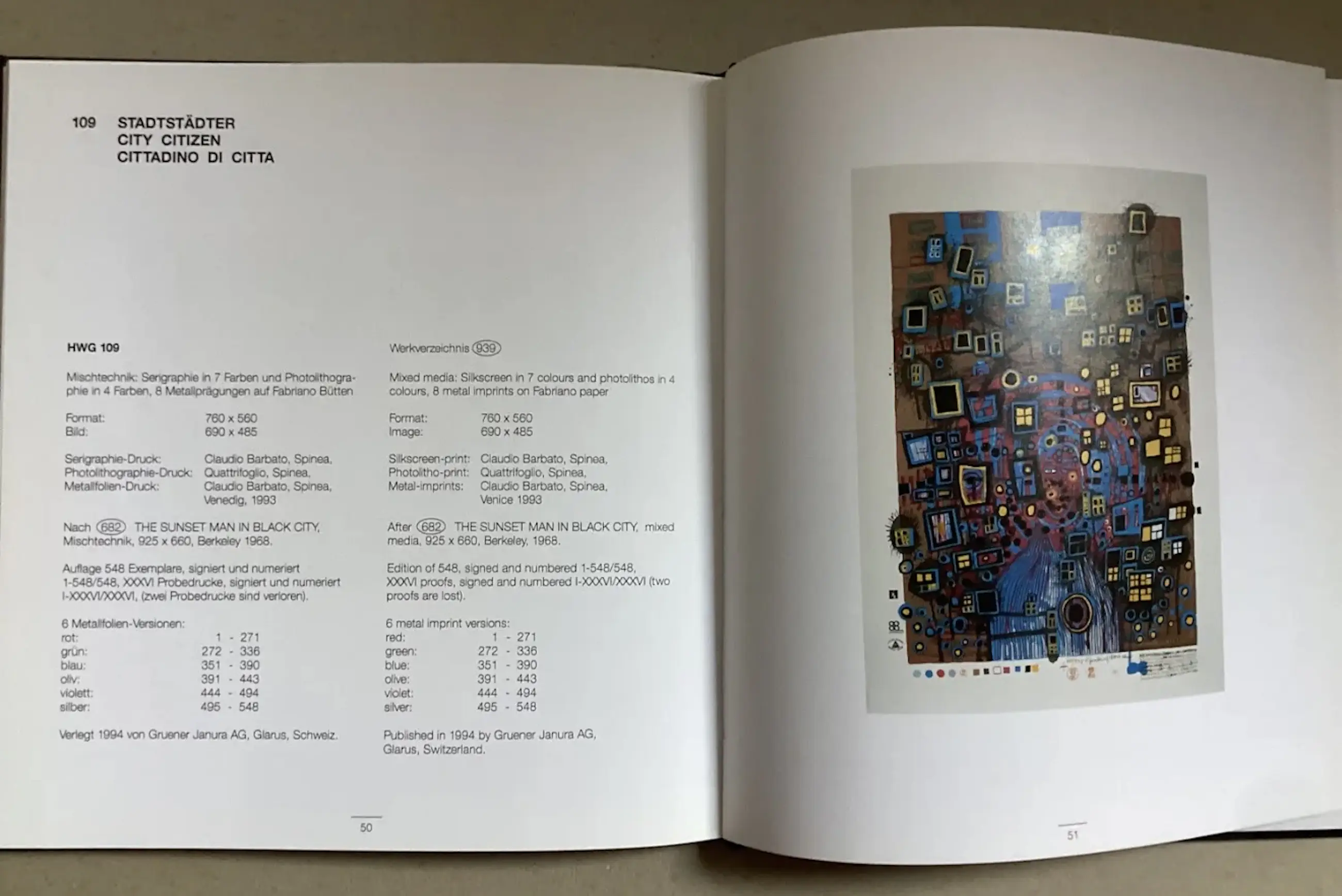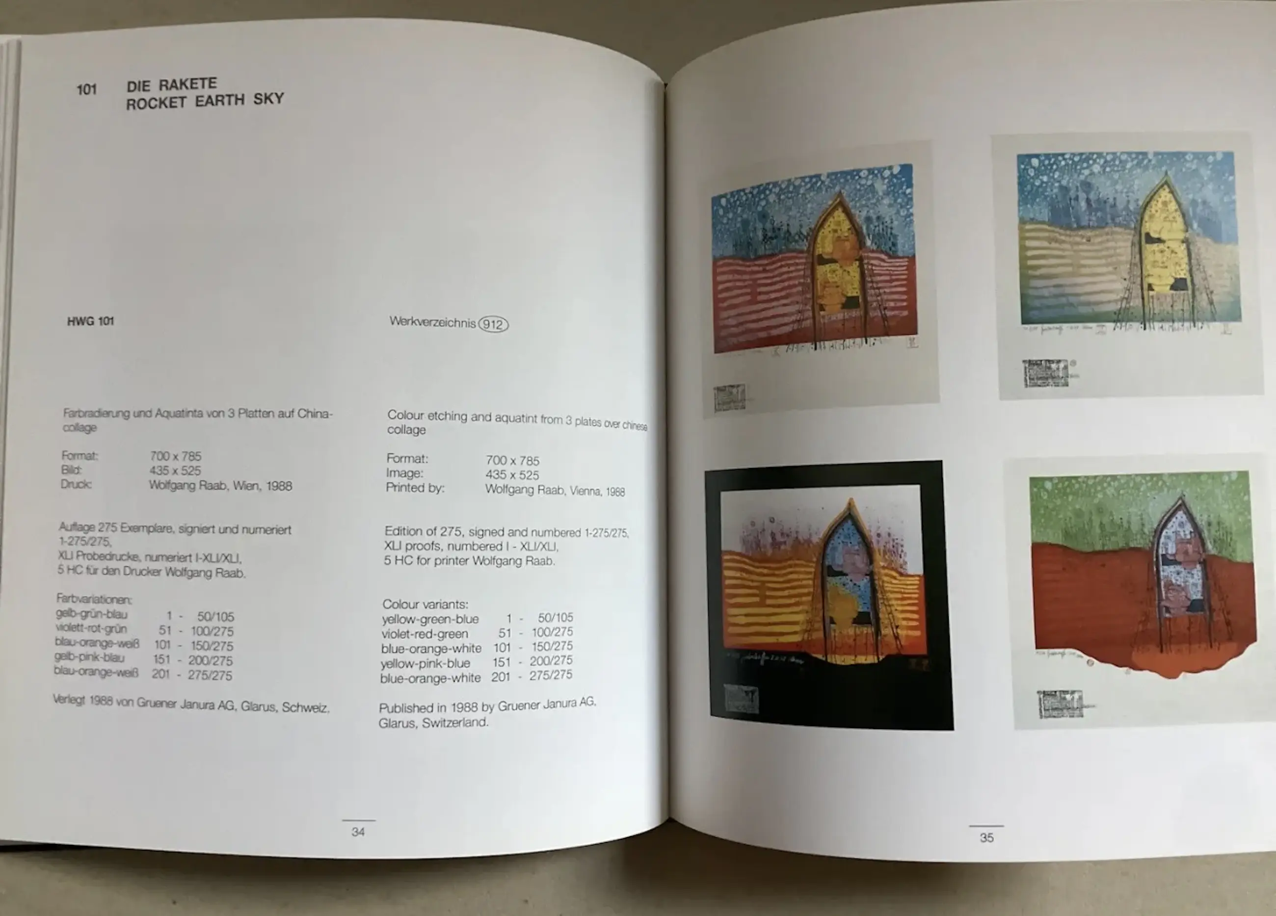 Duitstalige en Engelstalige uitgave 1995. 56 pagina's, betreffende het grafische werk van 1988-1995. Met gemonteerde voorkant/deksel afbeelding. Hardcover, mooi exemplaar.