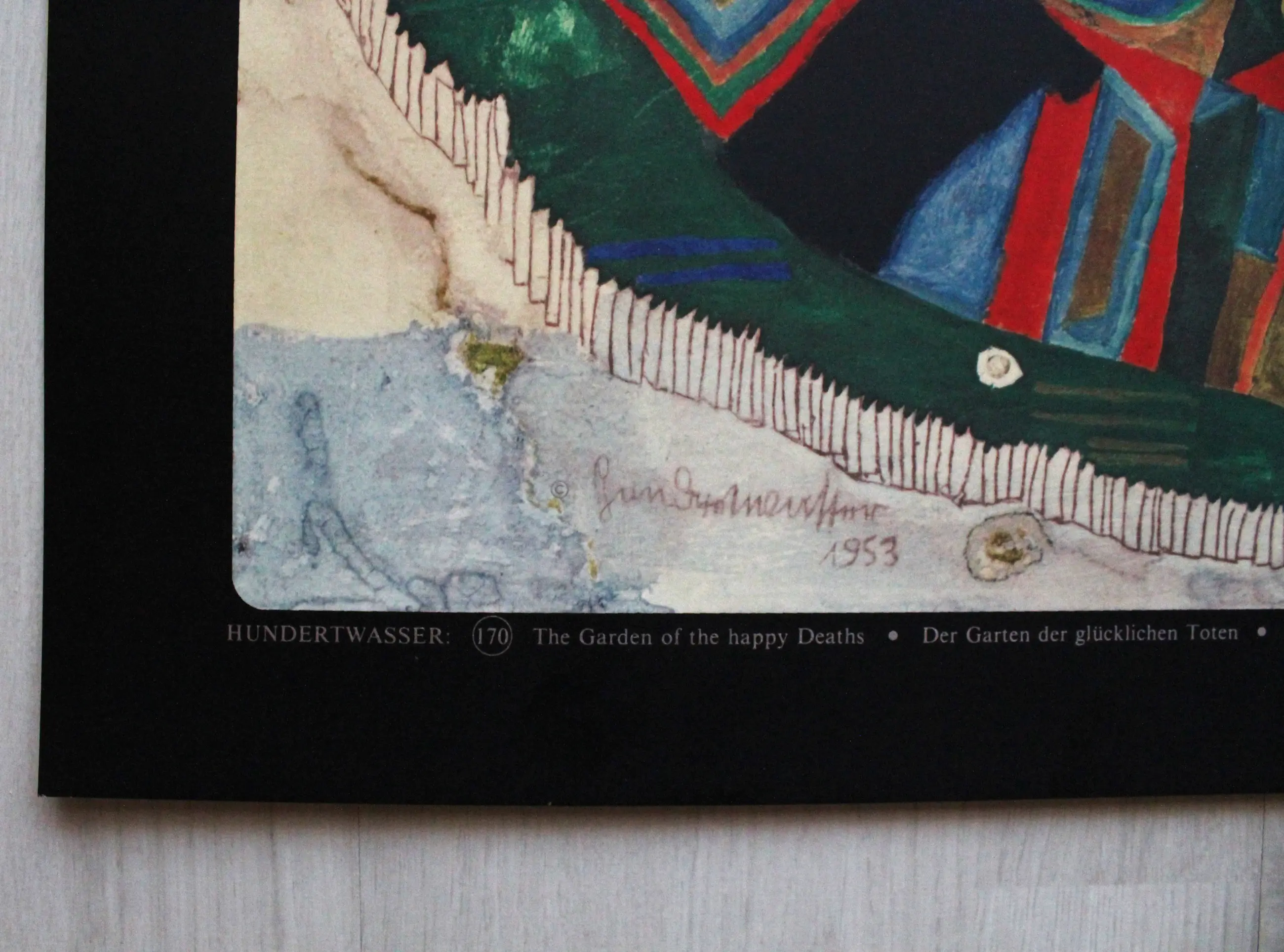 Titel: "Tuin van de gelukkige doden", naar het gelijknamige schilderij uit 1953. Techniek: Granolithografie op dik papier. Eerste gelimiteerde oplage: 4.000 exemplaren. Gesigneerd op het bord. Copyright 1979 door Gruener Janura AG/Zwitserland. In zeer goede staat.