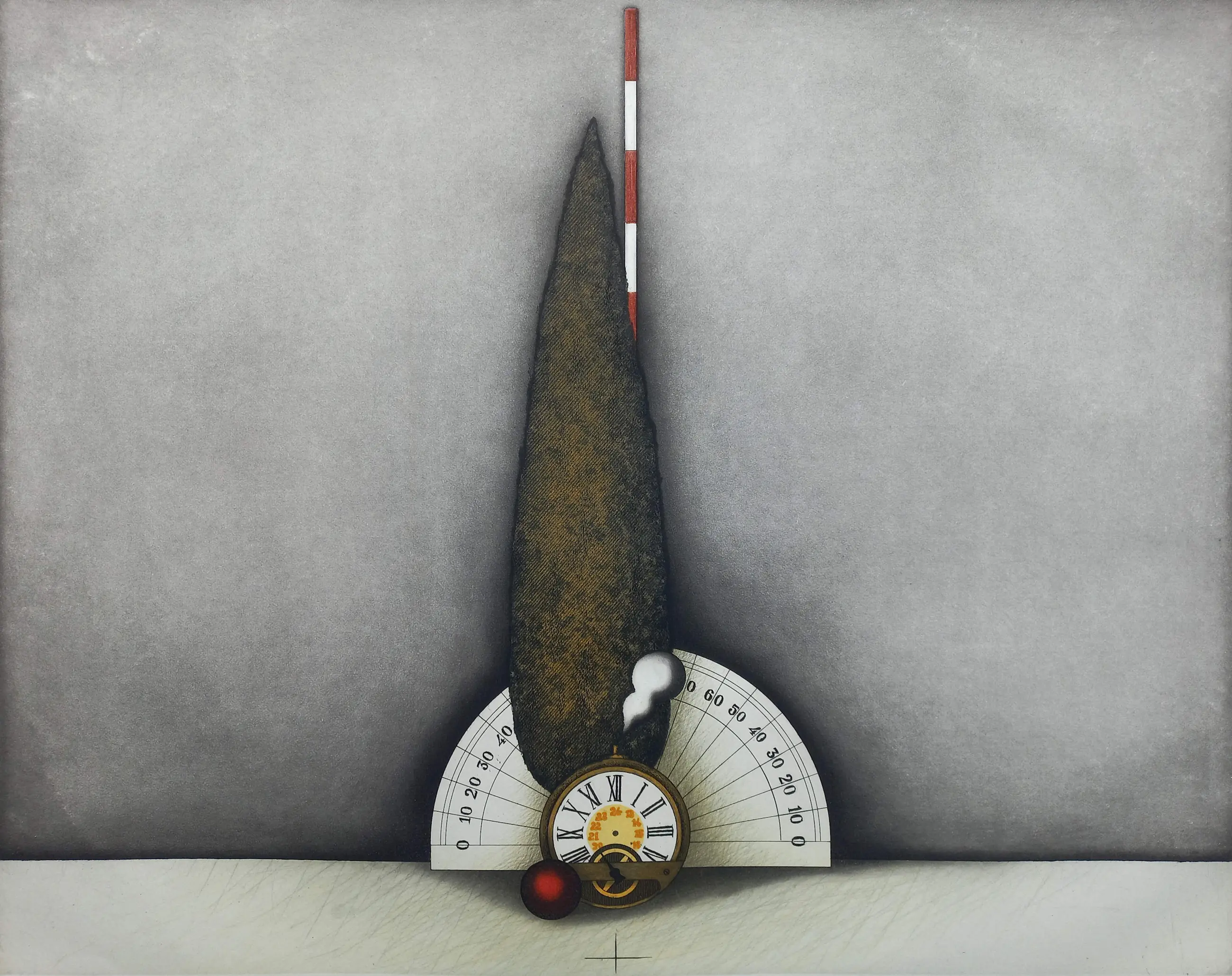 Prachtig, direct herkenbaar werk van de Duitse kunstenaar Friedrich Meckseper. Hij was zijn hele leven geïnteresseerd in technologie en hij werd o.a. beïnvloed door Leonardo da Vinci. Het uurwerk is een veelvuldig terugkerend element in zijn kunst.