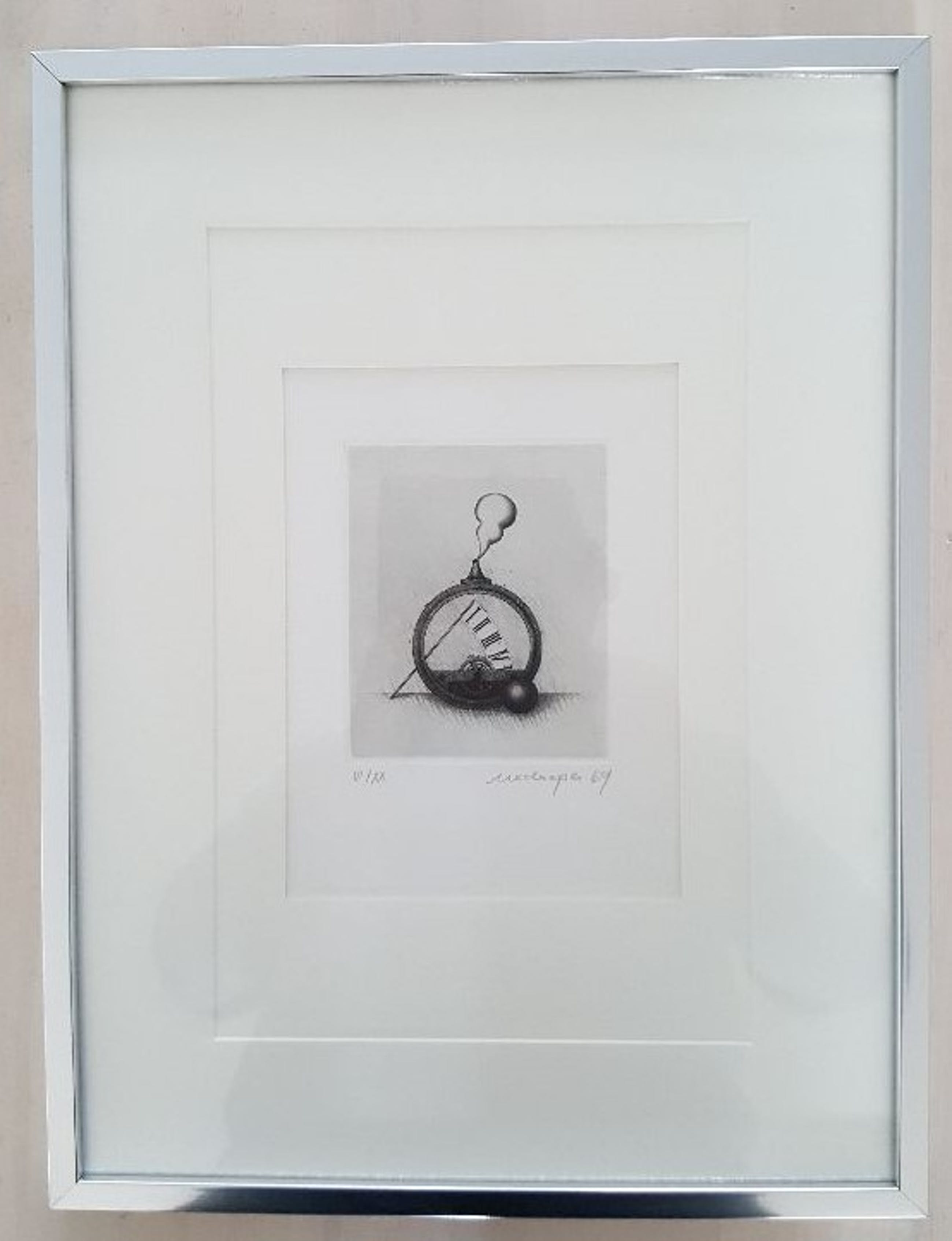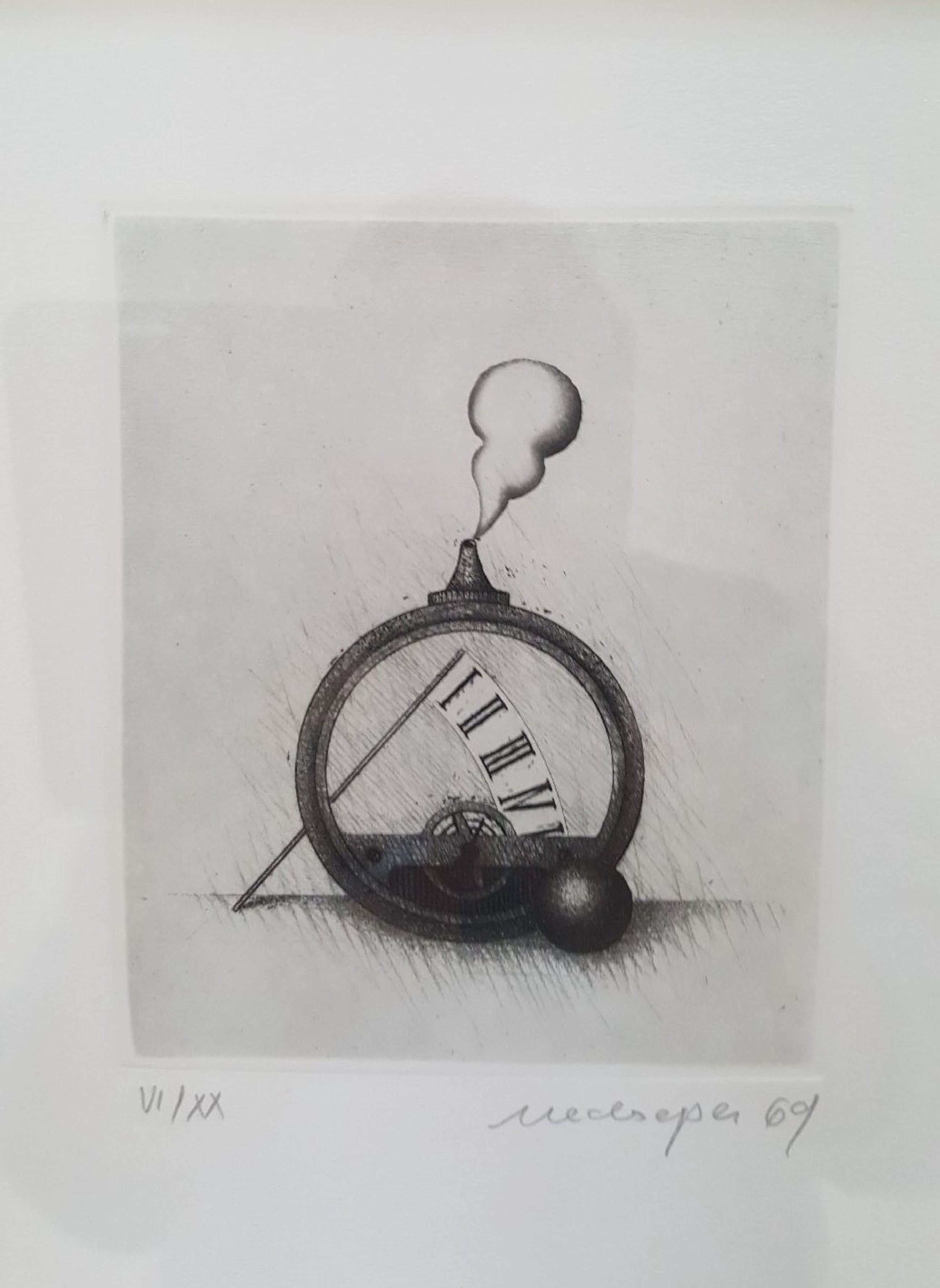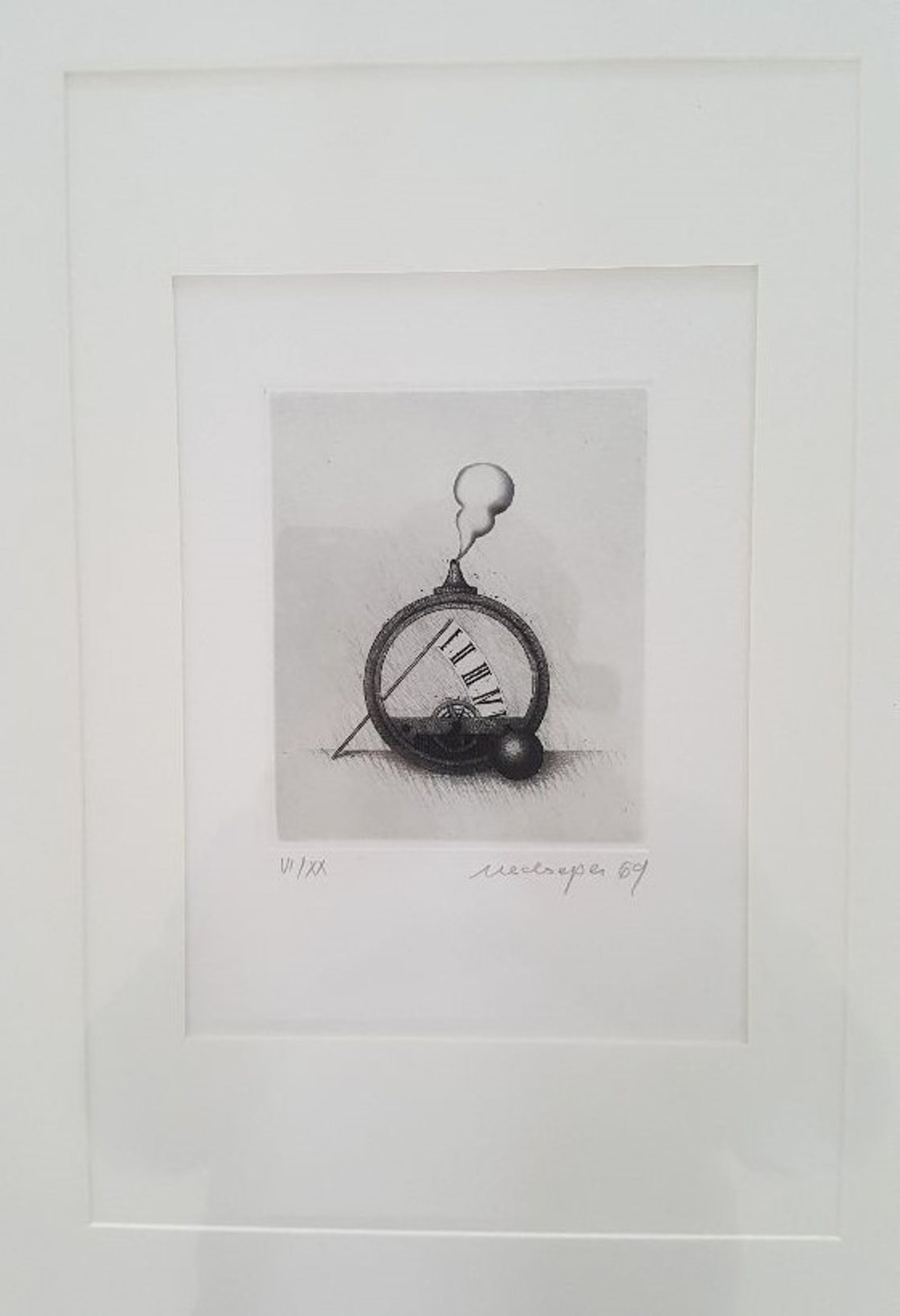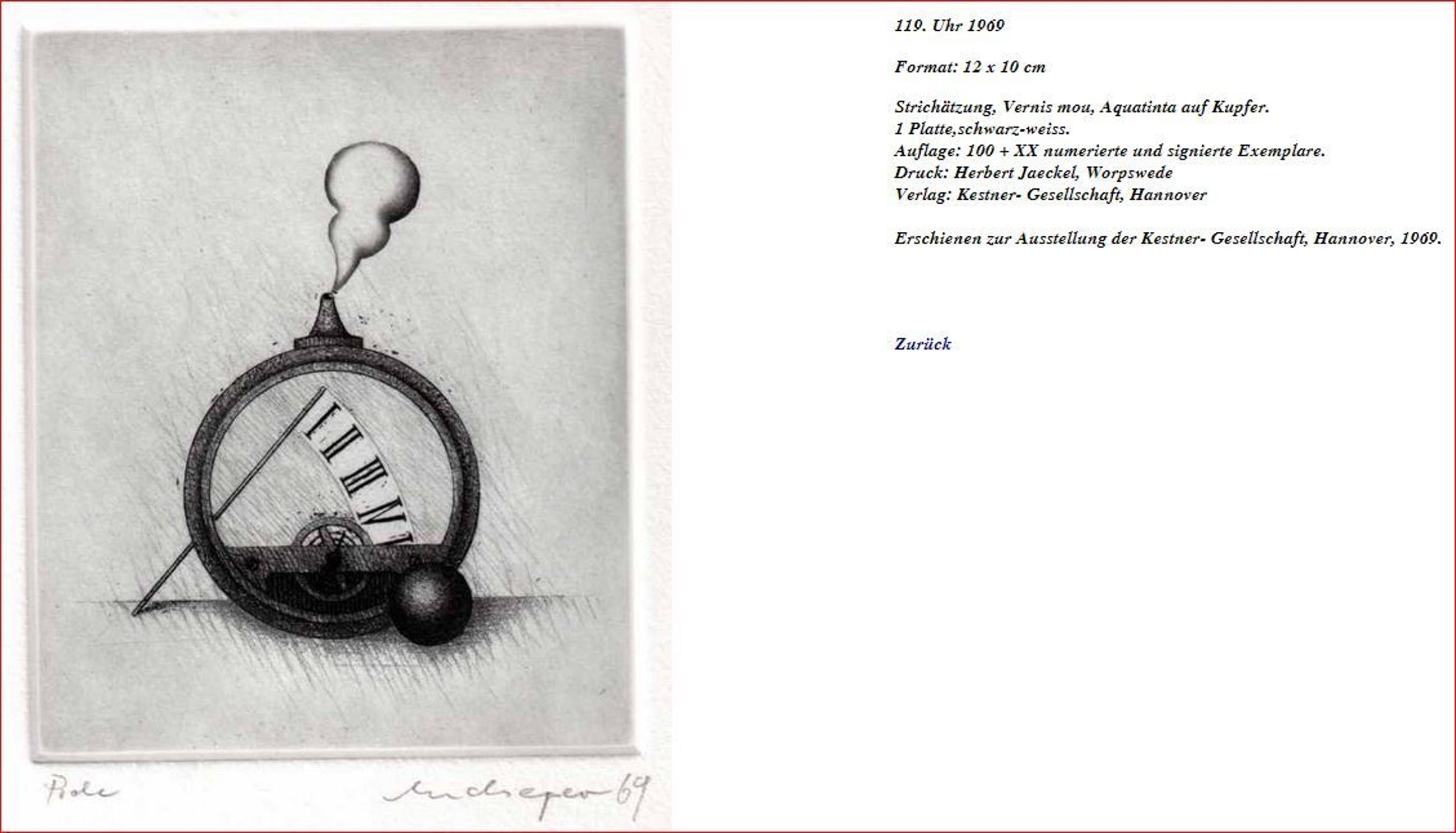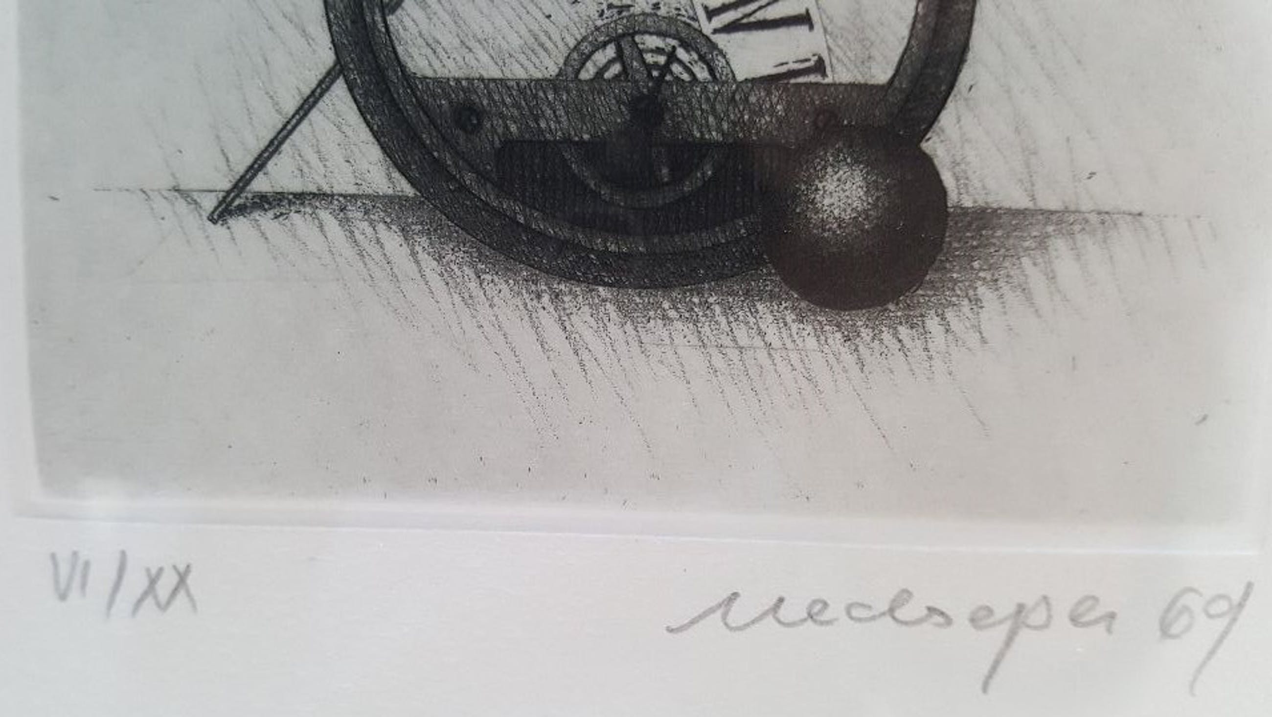 De ets met de titel ‘Uhr’ van Friedrich Meckseper (Bremen 1936 – Berlijn 2019) uit 1969 is handgesigneerd en -genummerd. De lijst heeft de afmetingen in cm.: 42 x 1,5 x 32 (h x b x l). Het beeld is 12 x 10 (h x b). De ets met nummer VI van XX, verkeert in goede staat.