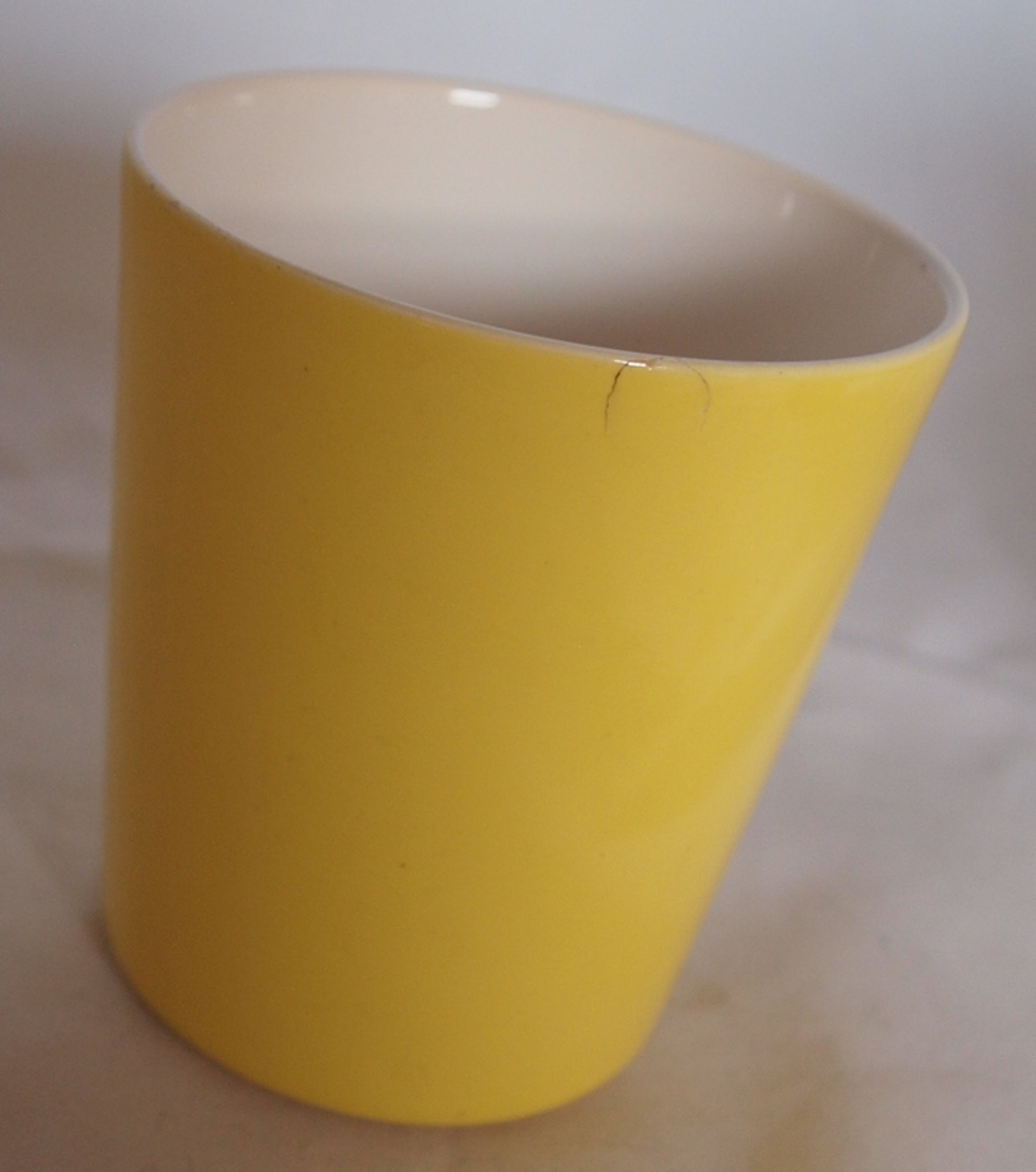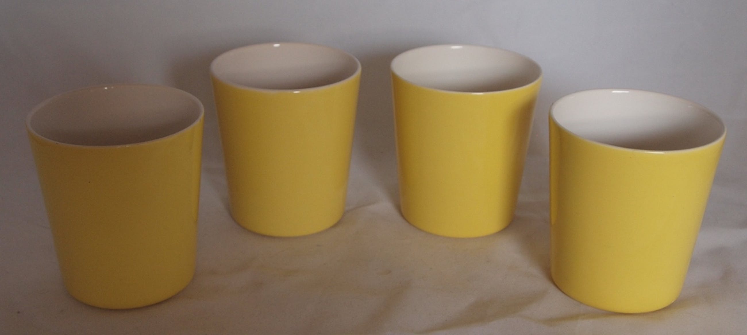 Vier vintage zacht gele aardewerken melkbekers van Fris Edam. In prima conditie, een beker heeft een bakfoutje op de rand en een beker heeft twee schilfertjes. Alle vier de bekers zijn aan de onderzijde gemerkt.