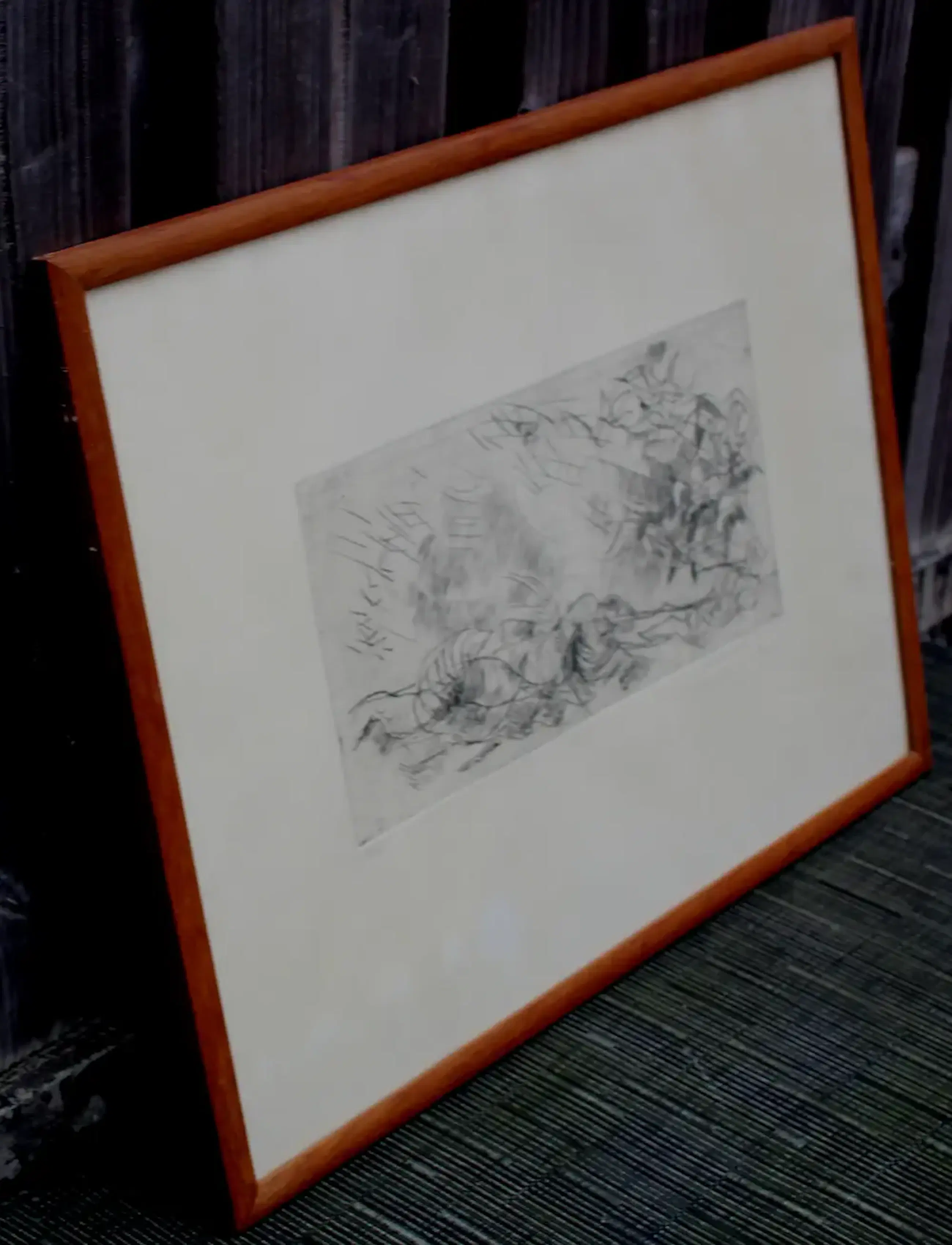 Ingelijste ets van Friso ten Holt. Jaar: 1961. Oplage: 2/12. In opdracht: Voor Mijntje en Willem. Afmetingen Incl lijst: H40.5 x b50cm. Afmetingen voorstelling: H16 x b31cm. Het werk is rechts onderaan gesigneerd door de kunstenaar. De authenticiteit van het aangeboden werk wordt volledig gegarandeerd. Een certificaat van echtheid kan, op aanvraag, worden gegarandeerd. Herkomst: collectie Willem Hoogendijk, Utrecht